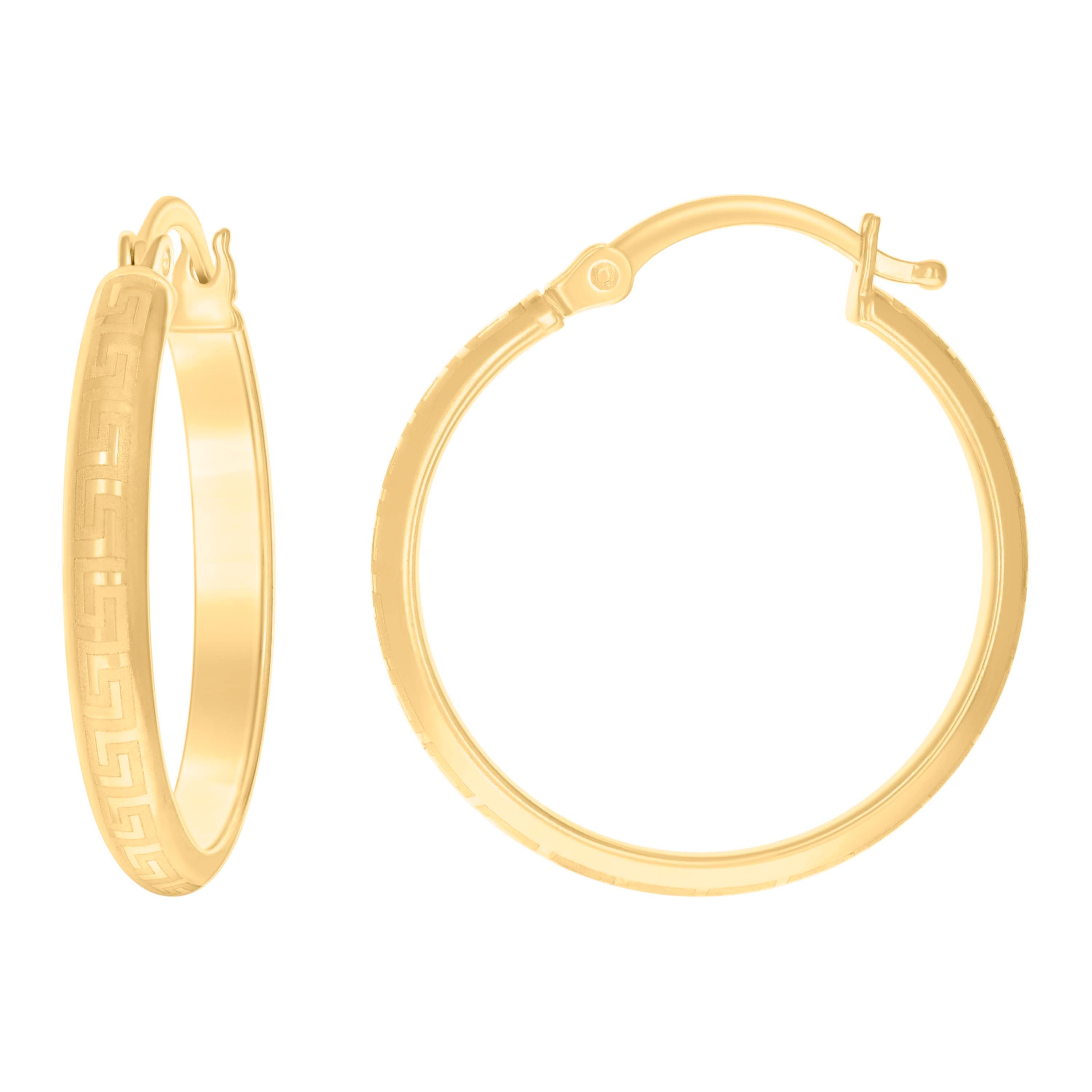 Discover the elegance of our 14Kt Yellow Gold Women's Greek Textured Huggie Hoop Earrings. These 20mm hoops, weighing just 2.3 grams, offer a stunning blend of classic design and intricate texture. Crafted with a secure hinged back closure, they provide a comfortable fit for any occasion. Elevate your style with these timeless earrings, showcasing the perfect harmony of sophistication and subtlety.