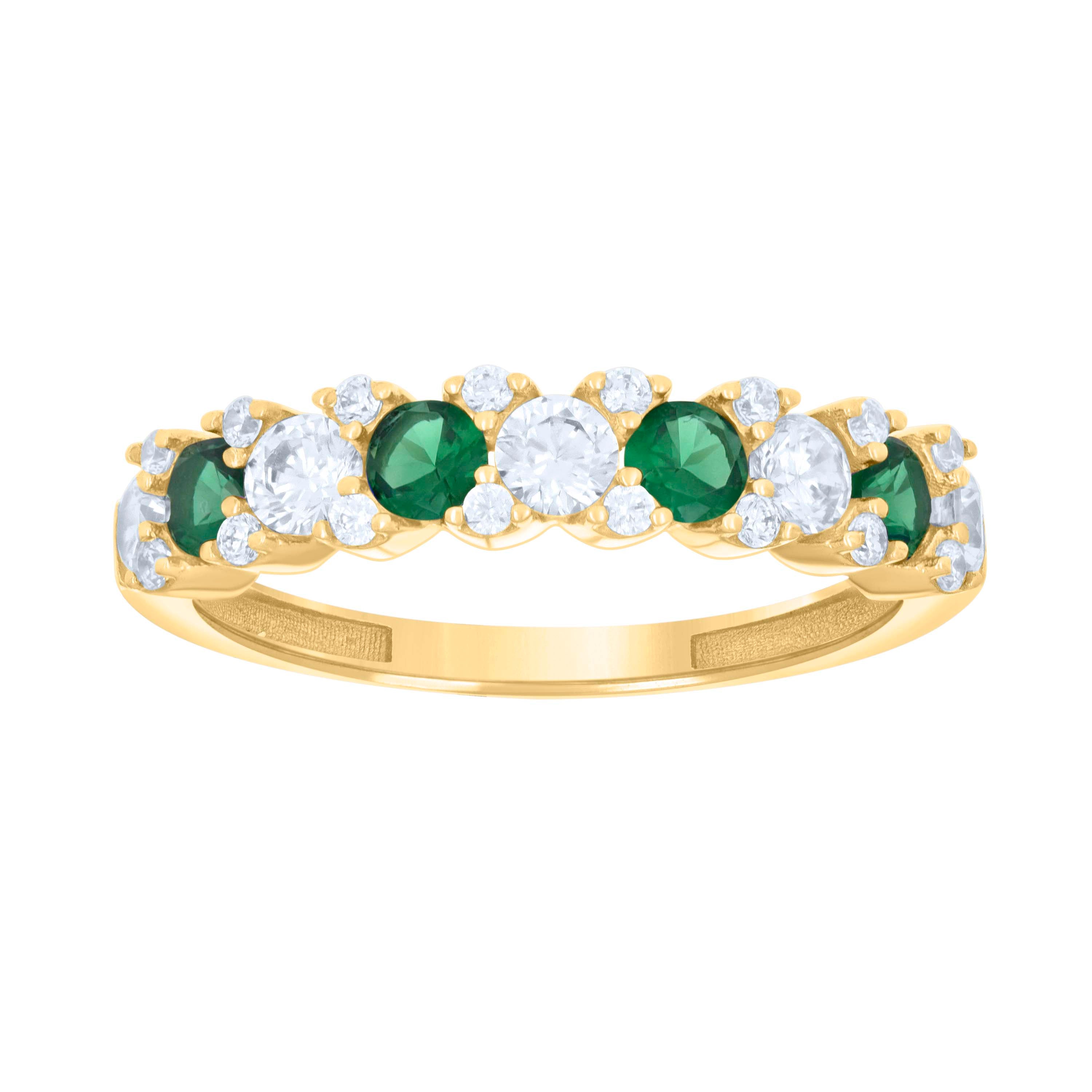 Elevate your elegance with this 14kt Yellow Gold Women's Half Eternity Ring, featuring a stunning combination of green and white round cubic zirconia stones. Weighing 2.1 grams, this polished masterpiece measures 4.1mm in height and width, ensuring a sleek fit. Each sparkling stone is securely set in prongs, reflecting a timeless radiance. Perfect for any occasion, this ring promises to be a cherished addition to your jewelry collection.