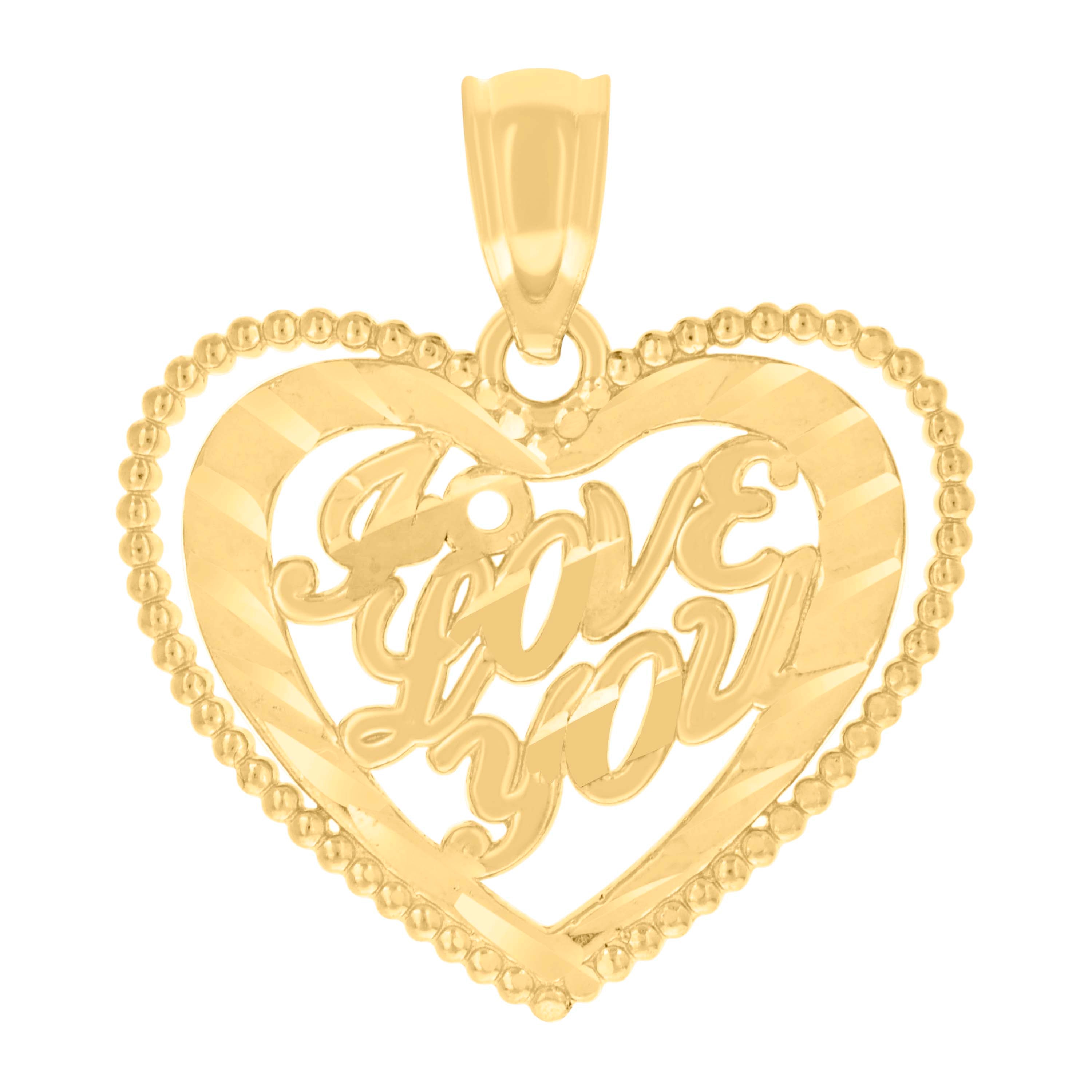 Embrace elegance with our 14kt Yellow Gold "I Love You" Heart Charm Pendant. This finely crafted piece boasts a stunning diamond-cut finish, offering a radiant shine that captures the essence of love. Weighing a delicate 1 gram, this charm is both lightweight and luxurious. Its dimensions, 18.5MM in height and 17MM in width, make it a perfect statement piece for any occasion. The single bail closure ensures secure and easy wear. A timeless gift to express your affection, this pendant is a must-have addition to any jewelry collection.