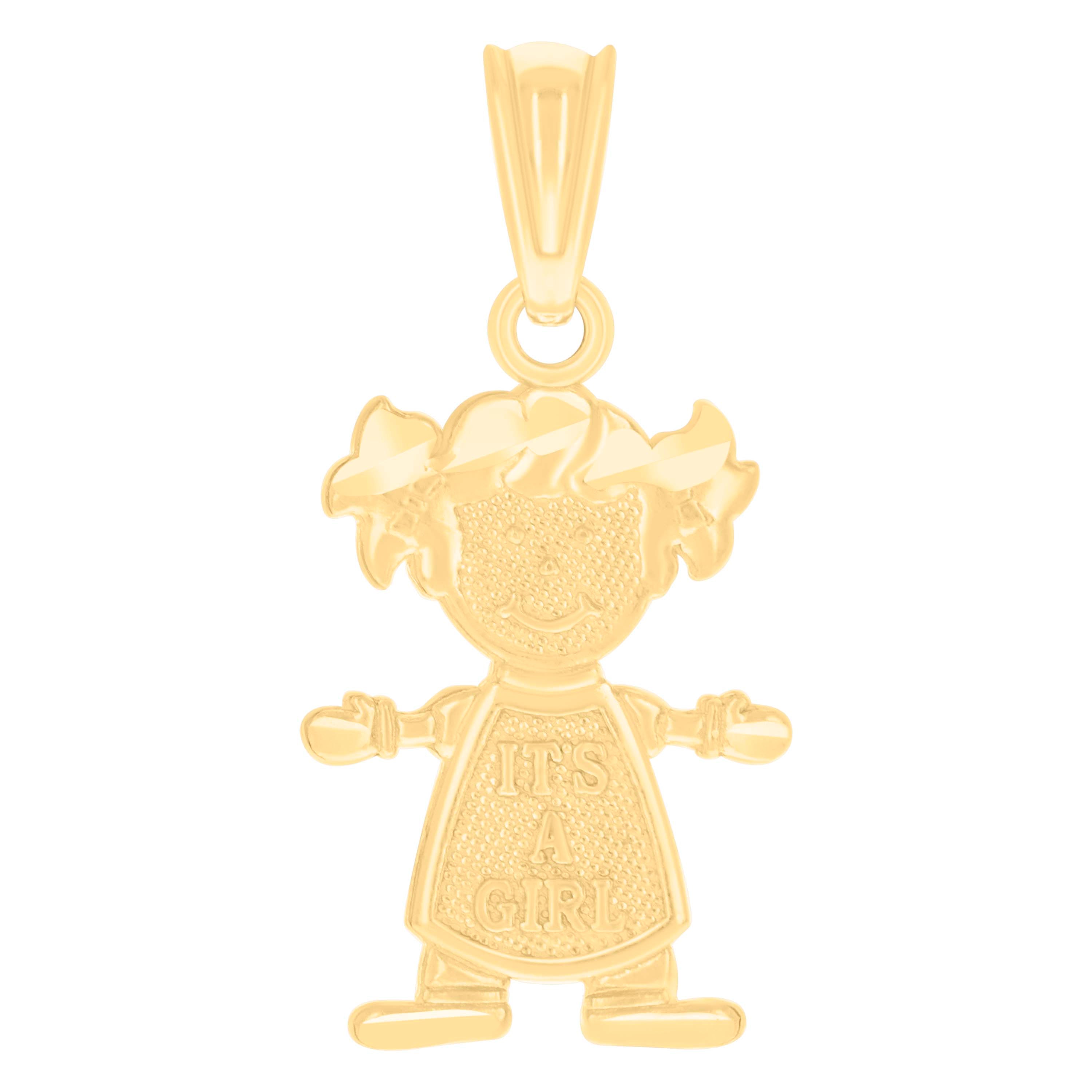 Celebrate the arrival of your little one with this exquisite 14kt Yellow Gold "It's A Girl" Baby Charm Pendant. Crafted with a stunning diamond-cut finish, this delicate piece weighs just 0.7 grams, offering a lightweight yet luxurious feel. The charm measures 21.8MM in height and 10.7MM in width, making it the perfect keepsake to cherish forever. Its single bail closure ensures easy attachment to any chain, allowing you to wear it close to your heart. A timeless treasure to mark a precious milestone.