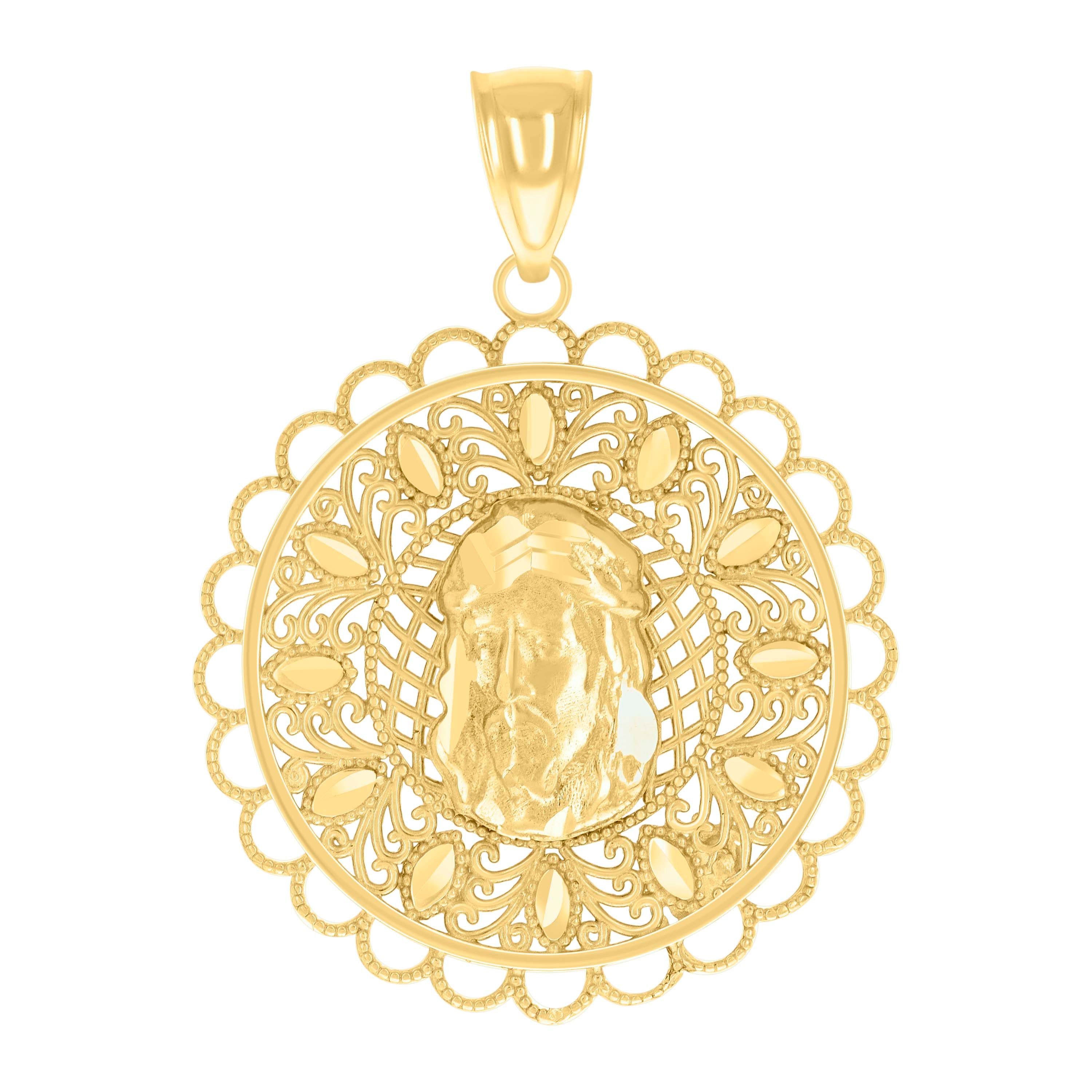 Illuminate your faith with this stunning 14Kt Yellow Gold Women's Jesus Religious Charm Pendant. Expertly crafted with a diamond-cut finish, this exquisite piece weighs 1.7 grams, offering a lustrous shine and intricate detail. Measuring 29.5MM in height and 22MM in width, the pendant's sleek single bail closure ensures it sits gracefully on any chain. A timeless symbol of devotion, perfect for both everyday wear and special occasions.
