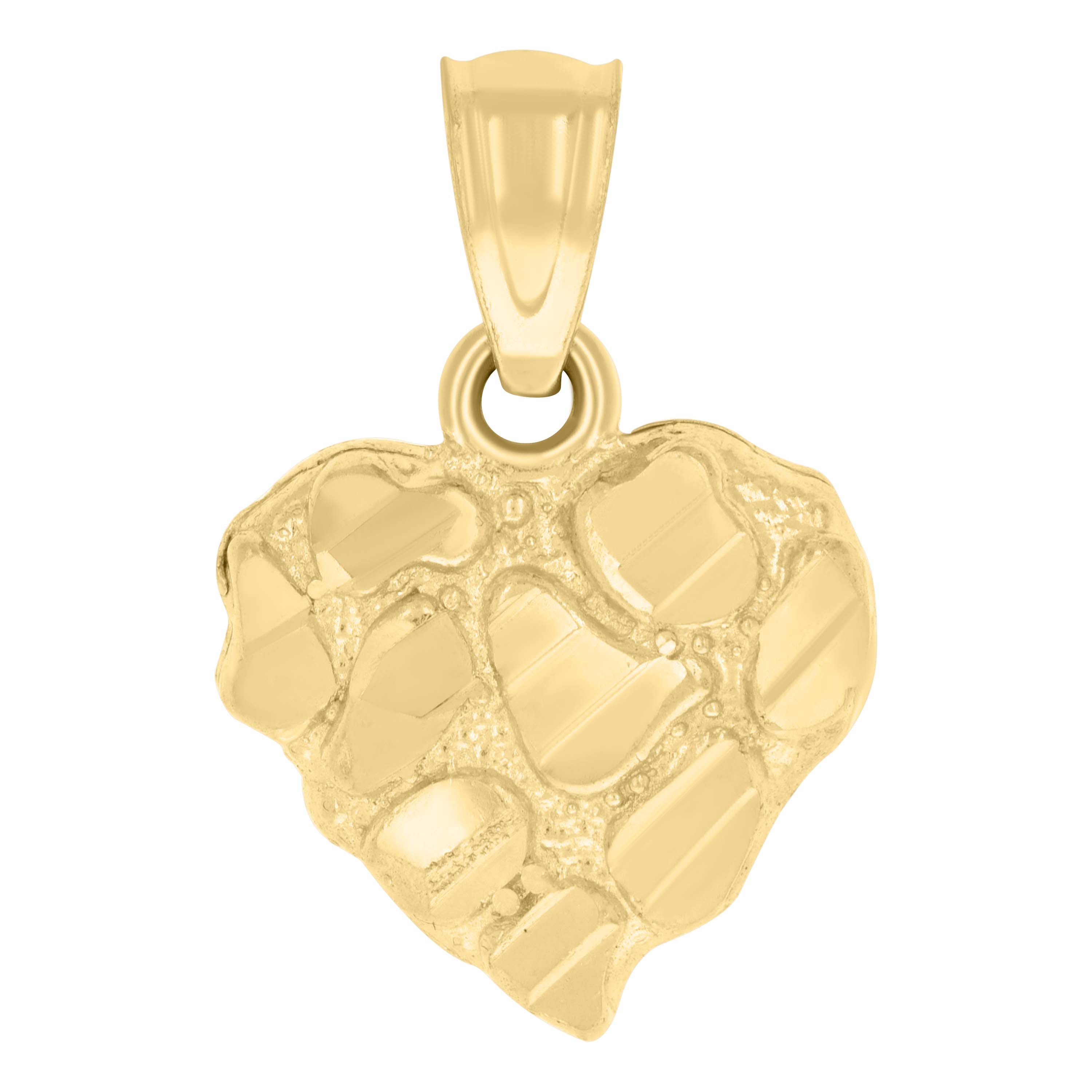 Crafted from radiant 14kt yellow gold, this elegant Women's Nugget Heart Charm Pendant is a stunning piece of jewelry. Weighing a delicate 0.7 grams, it features a brilliant diamond-cut finish that enhances its sparkle. Designed with a single bail closure, its dimensions are a perfect 15.7MM in height and 10.4MM in width, offering a timeless touch of elegance to any ensemble. Ideal for expressing love or adding a touch of sophistication to your collection.