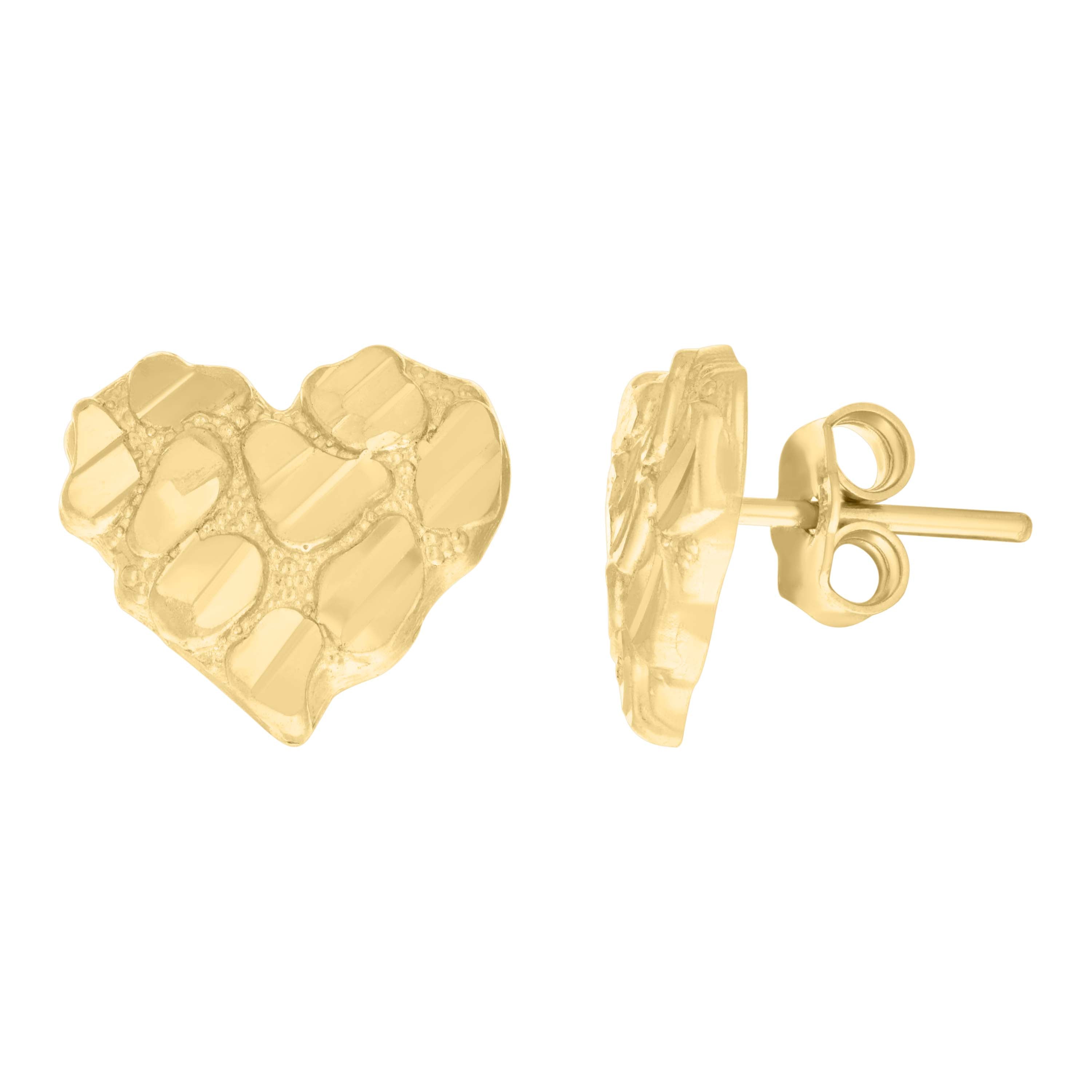 Indulge in timeless elegance with these 14kt Yellow Gold Women's Nugget Heart Stud Earrings. Weighing just 1.6 grams, these earrings feature a dazzling diamond-cut finish that beautifully catches the light. The classic push-back closure ensures a secure fit, while their 10MM height and 10.8MM width make them a perfect statement piece for any occasion. Elevate your jewelry collection with these exquisite, heart-shaped treasures.