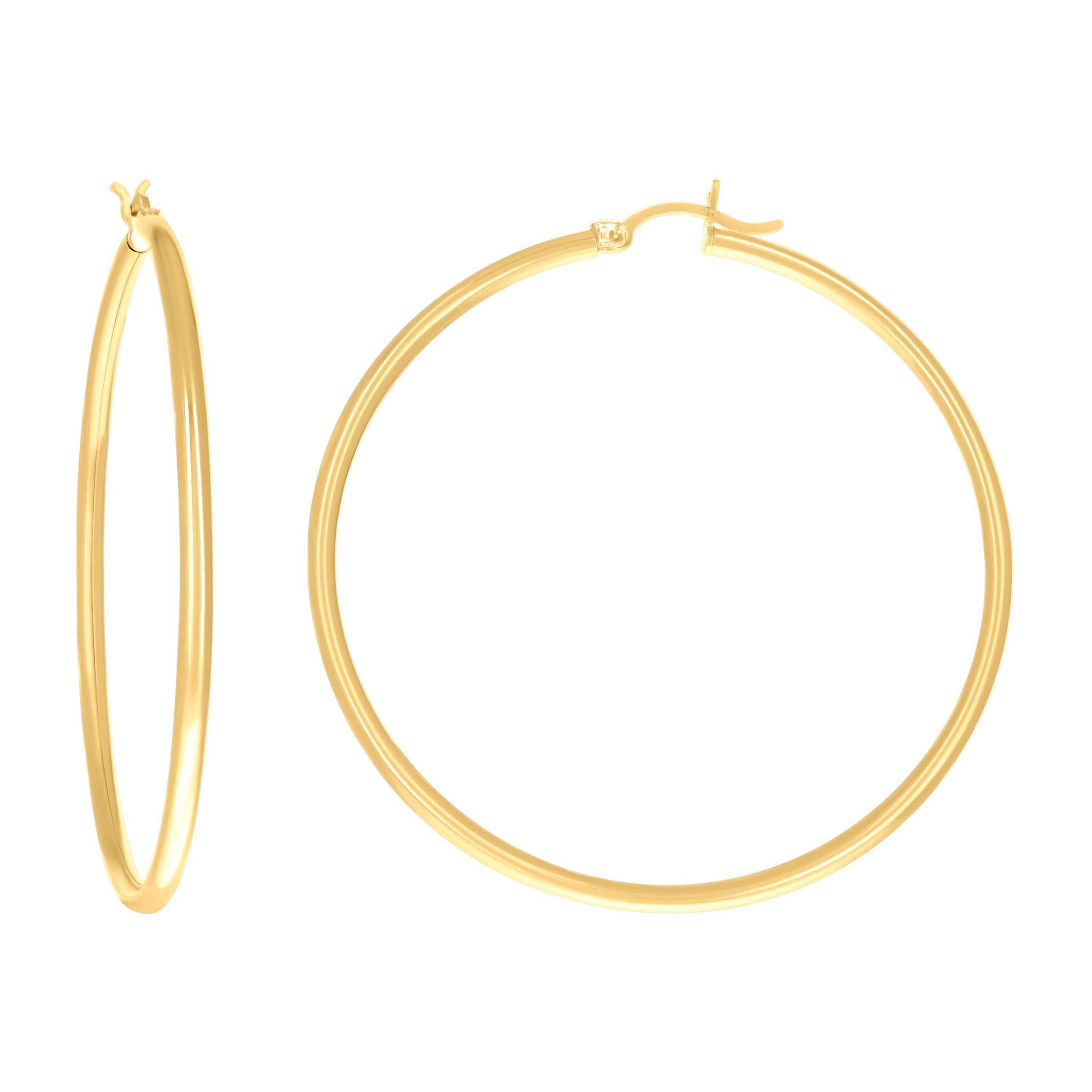 Elevate your everyday style with these classic 14Kt yellow gold round tube hoop earrings. Crafted in a sleek, polished finish, they feature a slim 2 mm profile and a bold 50 mm diameter for a timeless, face-flattering silhouette. Lightweight at 4.8 grams and designed with a secure hinged back, they offer comfortable, all-day wear. Minimalist and elegant without CZ stones, these hoops are the perfect versatile staple—from casual chic to evening glamour.
