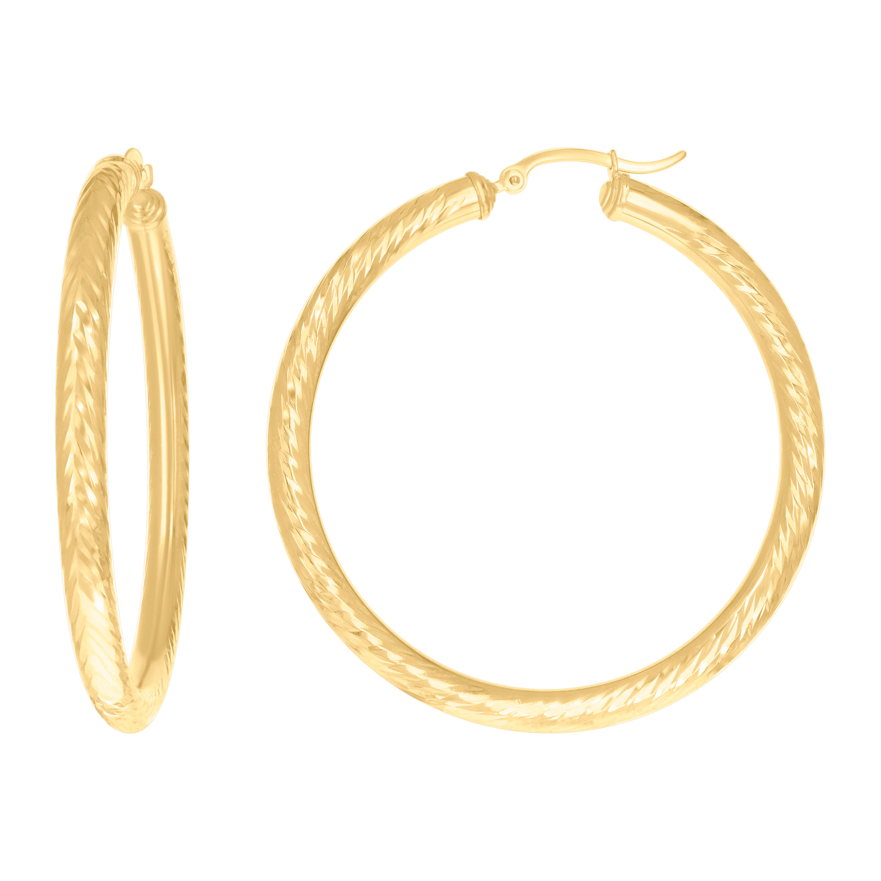 Elevate your everyday shine with these 14Kt yellow gold women’s hoop earrings, crafted in a sleek round tube silhouette and finished with a radiant diamond-cut pattern that catches the light from every angle. Measuring 50 mm in height and 4 mm in width, they strike the perfect balance between bold and refined, while the lightweight 5.2-gram design ensures comfortable wear all day. The hinged back closure offers secure, effortless fastening. Elegant and versatile, these CZ-free hoops are a timeless essential for any jewelry collection.