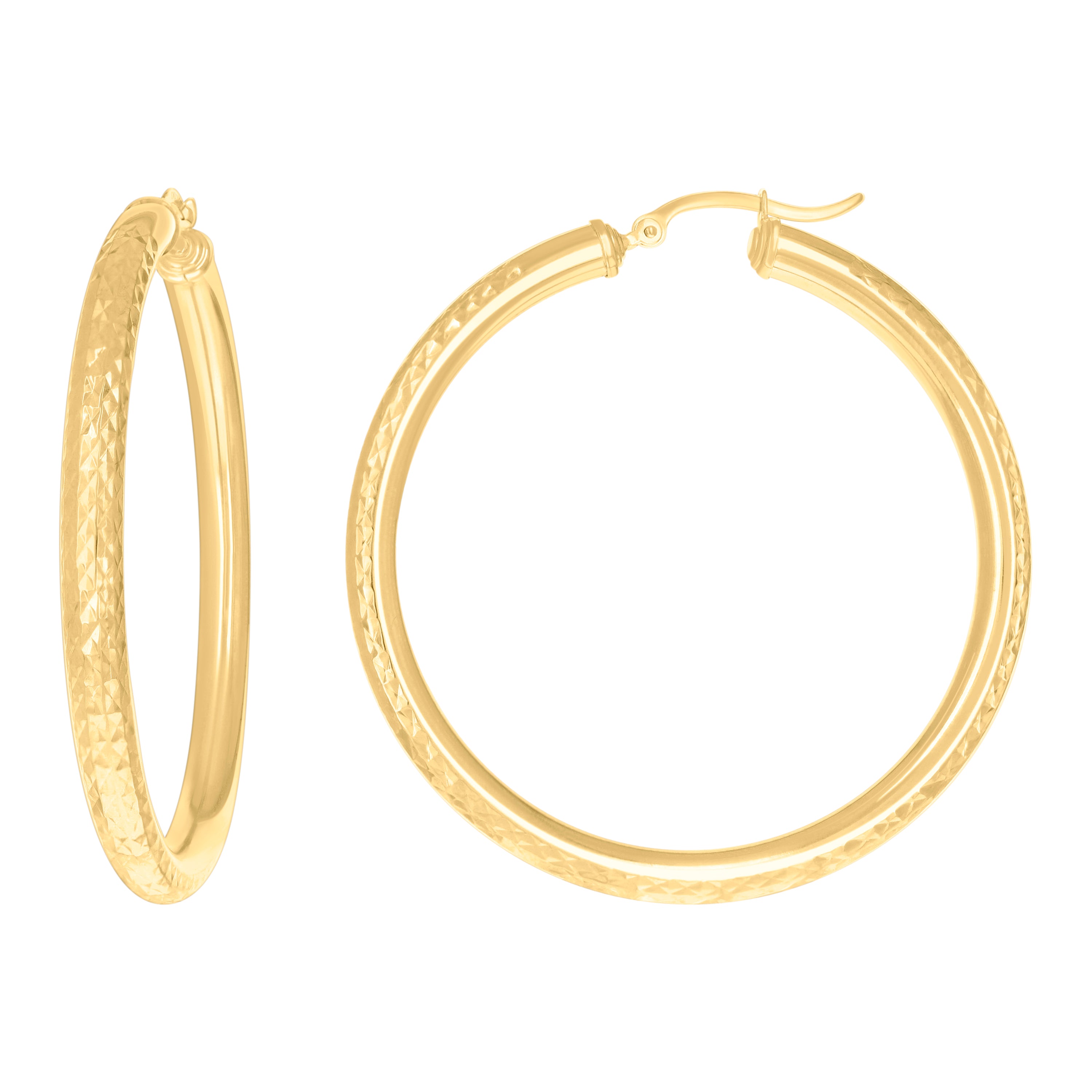 Elevate your look with these 14Kt Yellow Gold women’s hoop earrings, crafted in a bold round tube design with an eye-catching diamond-cut patterned finish that shimmers with every turn. Measuring 50 mm in height and 4 mm in width, they strike the perfect balance between statement and sophistication. Lightweight yet substantial at approximately 5.2 grams, they’re comfortable for all-day wear. The secure hinged-back closure ensures easy on-and-off and a confident fit. Pure gold brilliance—no CZ—just timeless elegance you can dress up or down.