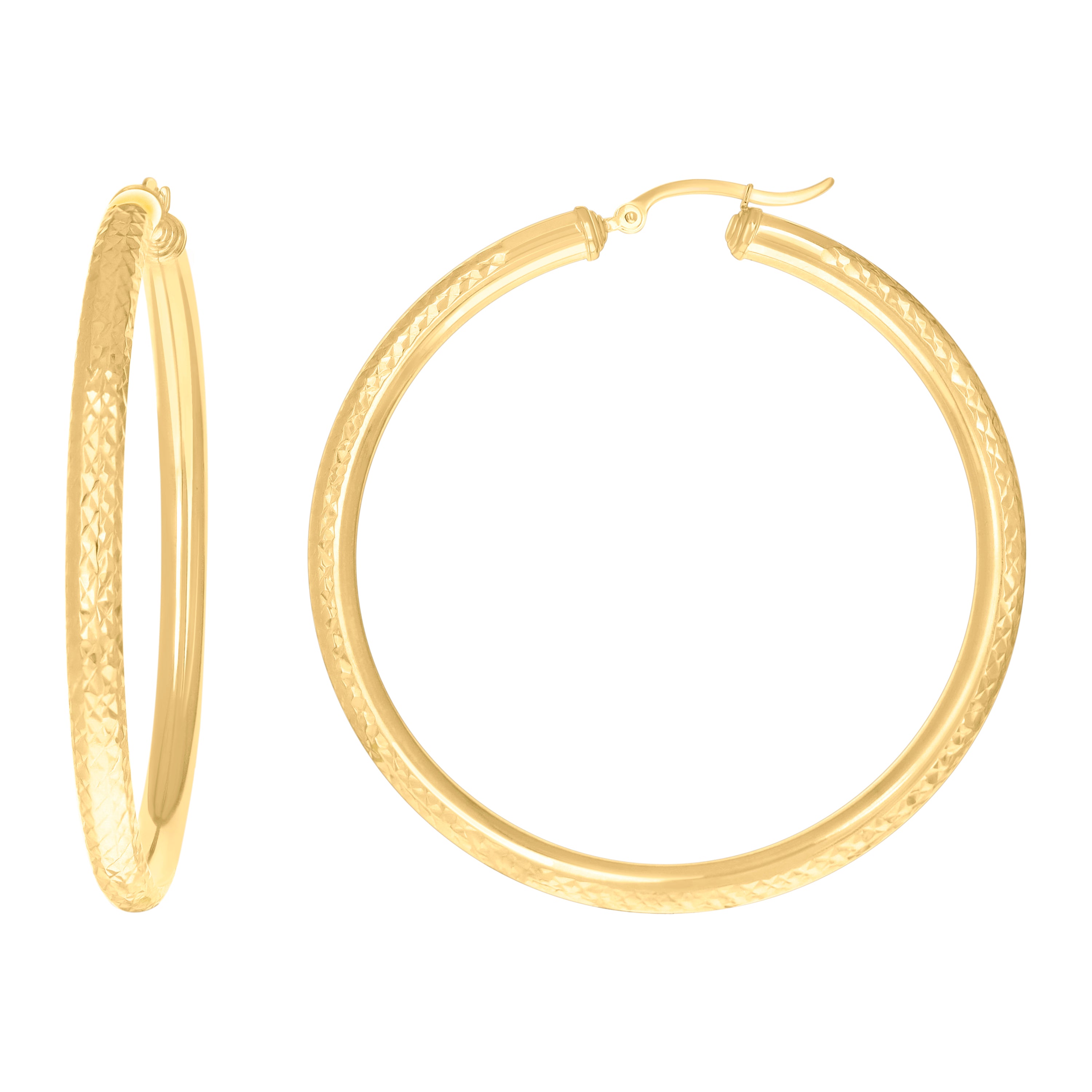 Elevate your everyday elegance with these 14Kt Yellow Gold women’s hoop earrings, crafted in a sleek round tube design and finished with a dazzling diamond-cut pattern that catches the light from every angle. Measuring a bold yet refined 57 mm in height and 4 mm in width, they offer a statement silhouette without the weight—just 5.8 grams for comfortable, all-day wear. The secure hinged back closure ensures effortless on-and-off and a reliable fit. Chic, timeless, and free of CZ stones for a pure gold glow, these fancy hoops are your go-to for both polished daytime looks and sophisticated evenings.
