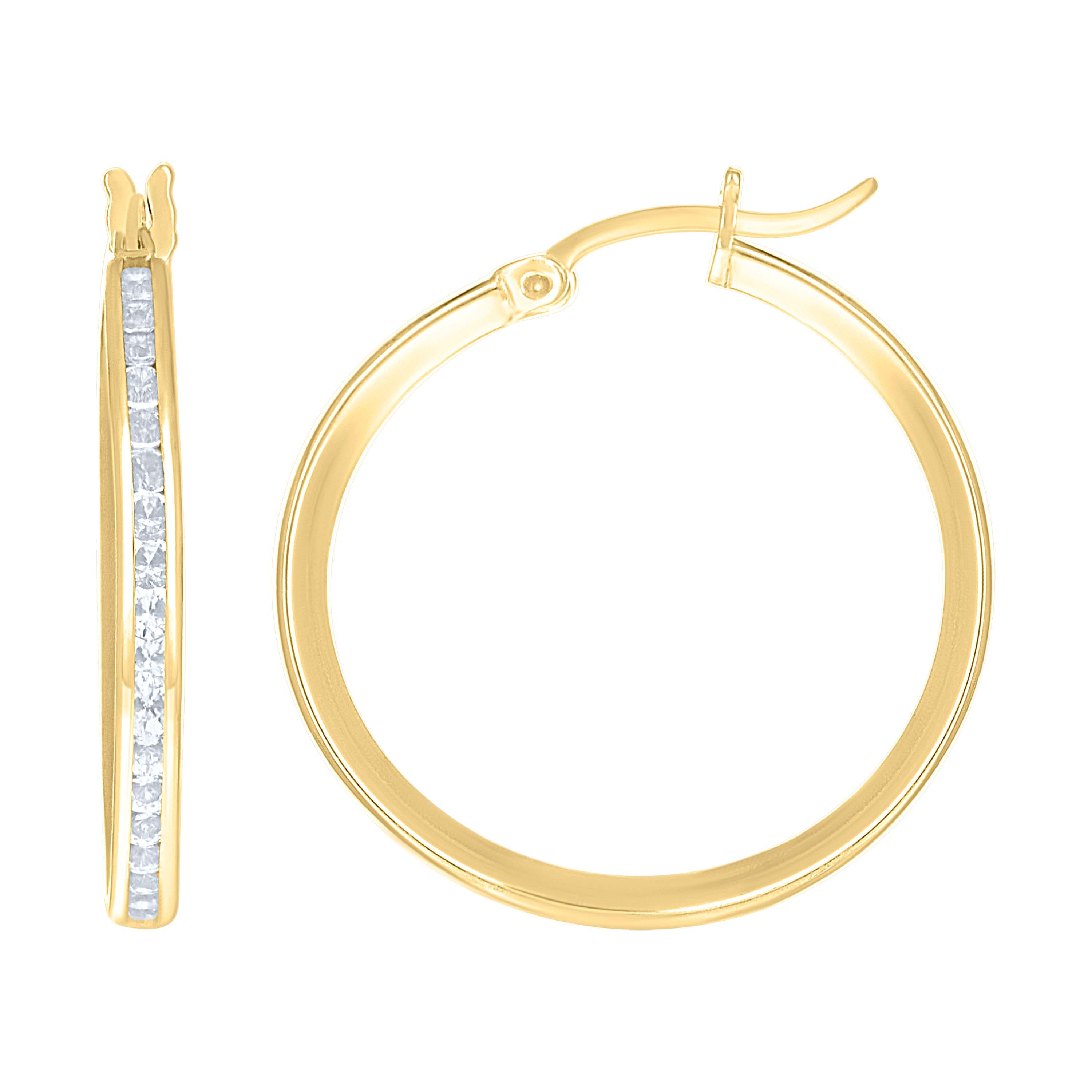 Elevate your elegance with these exquisite 14Kt Yellow Gold Women's Huggie Hoop Earrings. Delicately crafted, each hoop measures 23mm in height and 2mm in thickness, showcasing a refined single row of dazzling white cubic zirconia stones. The channel setting beautifully accentuates the round CZ gems, capturing light with every movement. Weighing a light 1.9 grams, the polished finish adds a luxurious sheen, while the hinged back closure ensures a secure and comfortable fit. Perfect for adding a touch of sophistication to any ensemble.