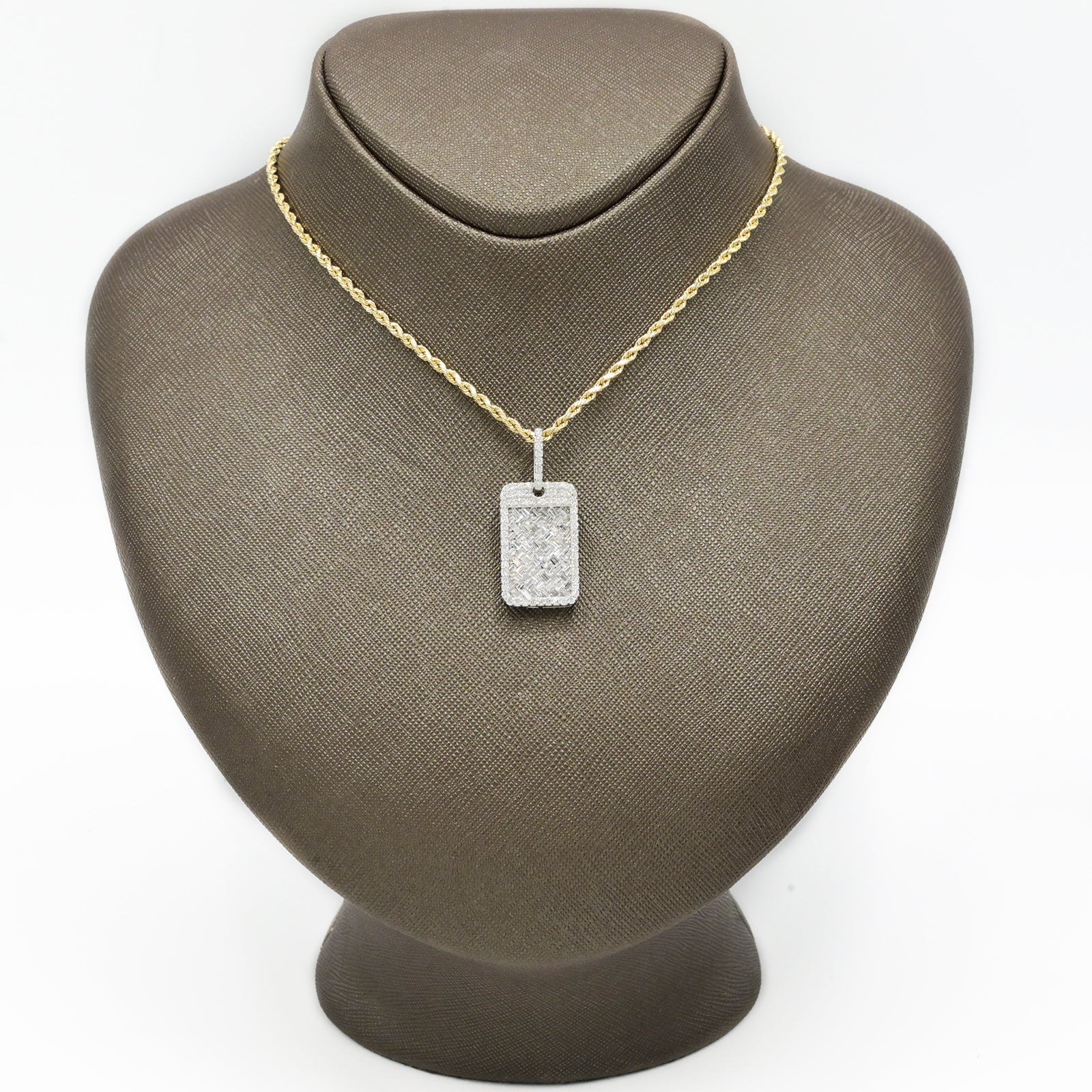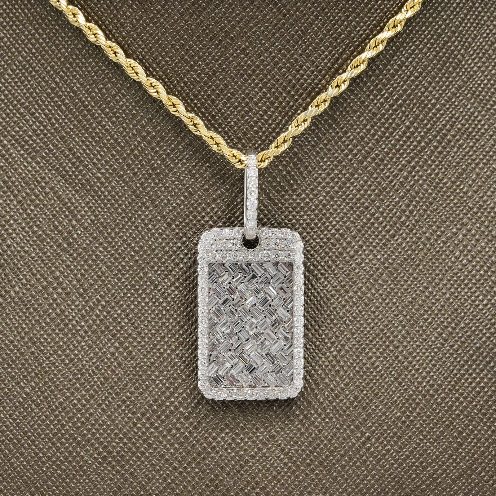 This 15mm dog tag pendant is crafted from 10k yellow gold, weighing 4.9 grams for a substantial feel. It features 2 carats total weight of lab-grown baguette diamonds, delivering brilliance with ethical sourcing. Designed for men, this pendant offers a modern, sophisticated look ideal for elevating any ensemble with both style and responsibility.