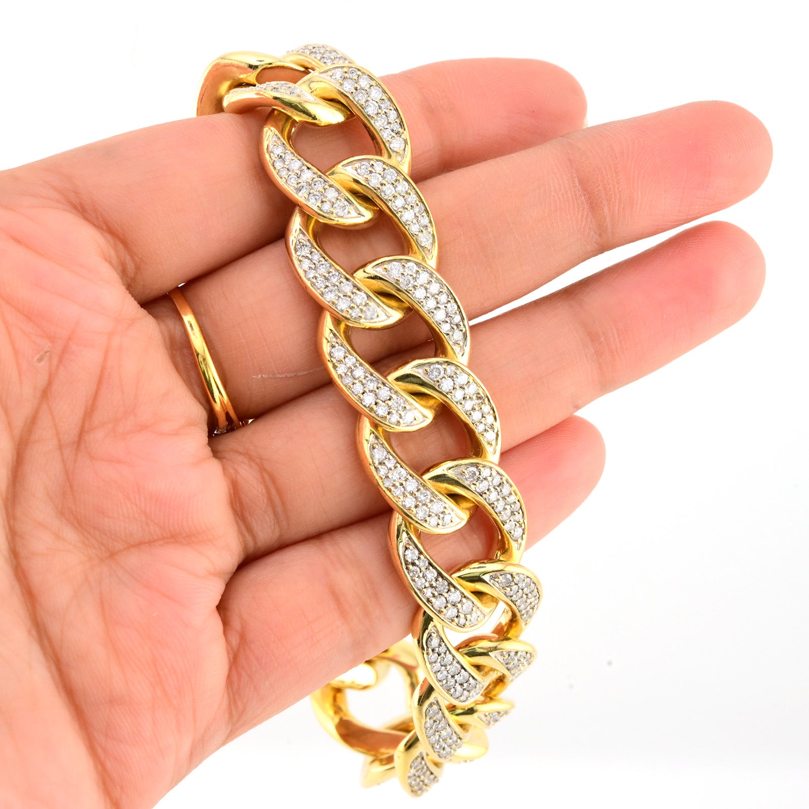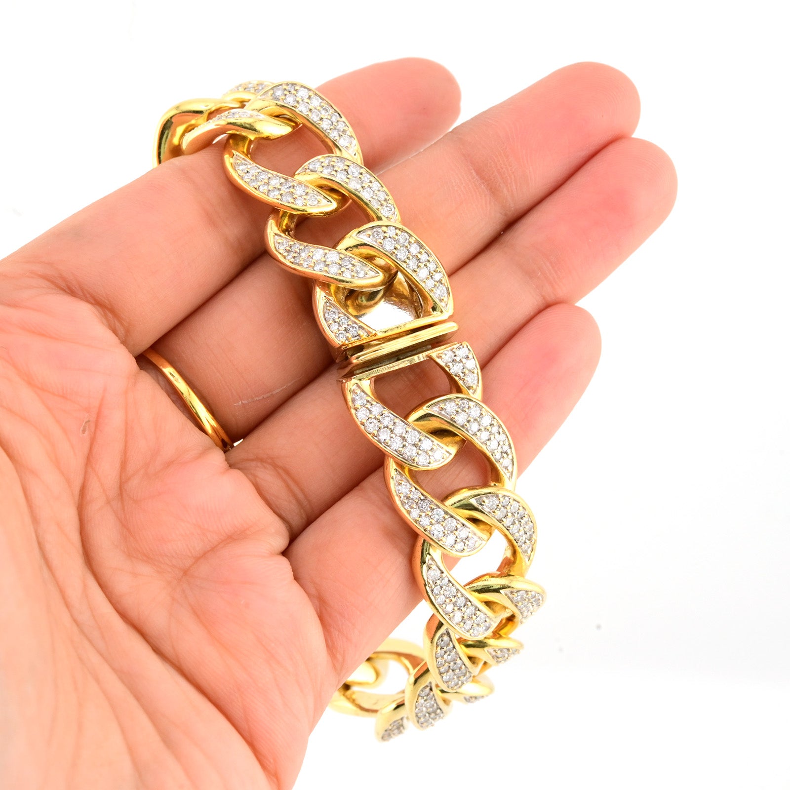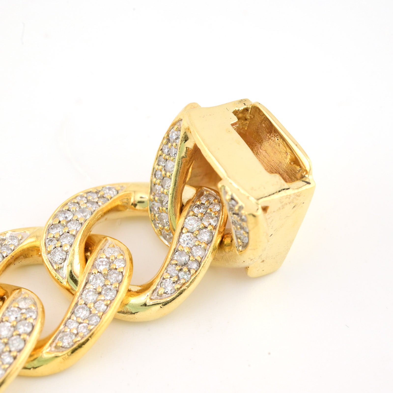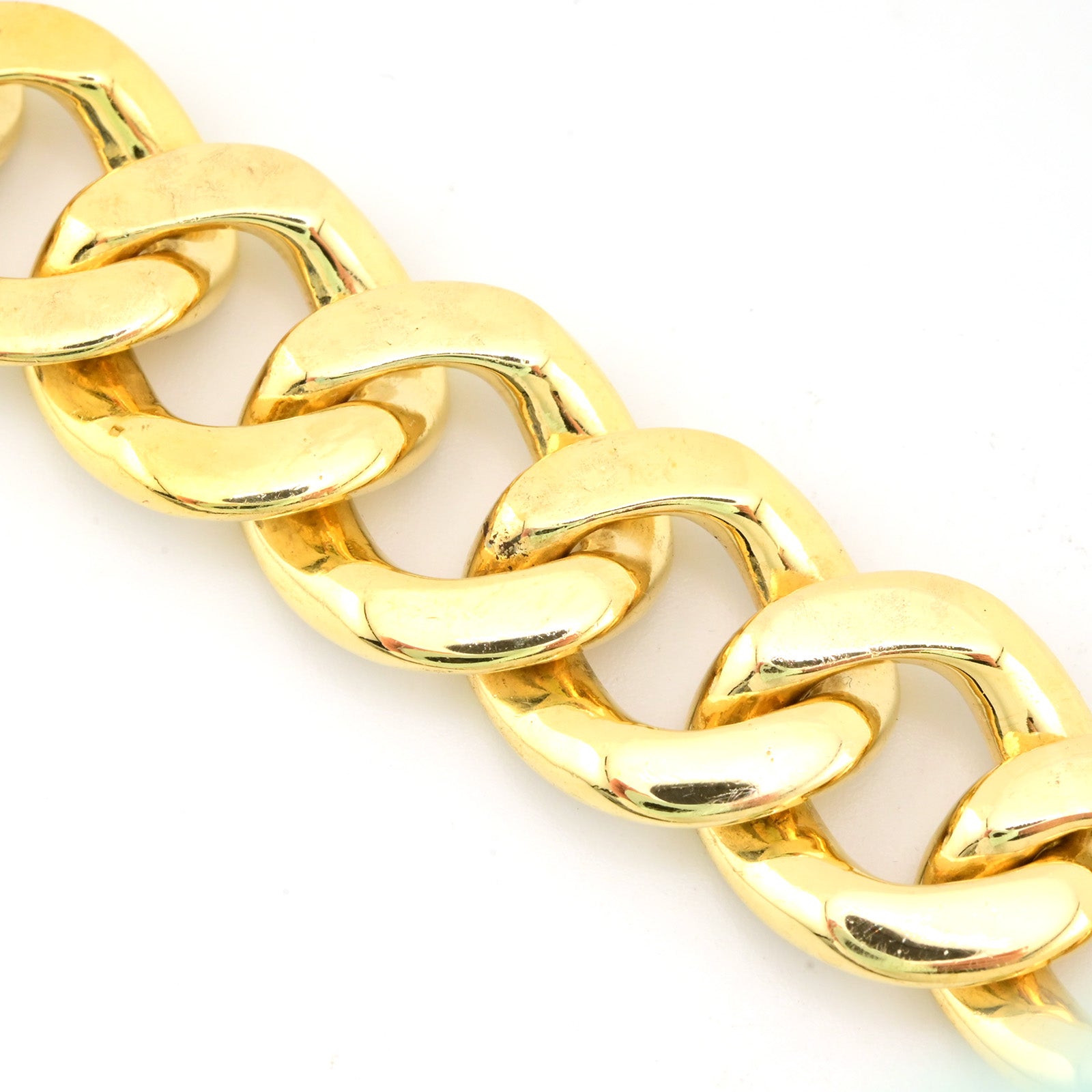 This 17mm wide men's Cuban bracelet is crafted from durable 10k yellow gold, offering both strength and classic style. Measuring 8.5 inches, it features 10 carats total weight of natural diamonds that enhance its bold, luxurious appeal. Weighing 91.2 grams, this substantial bracelet combines exceptional craftsmanship with a striking design ideal for making a distinguished statement.