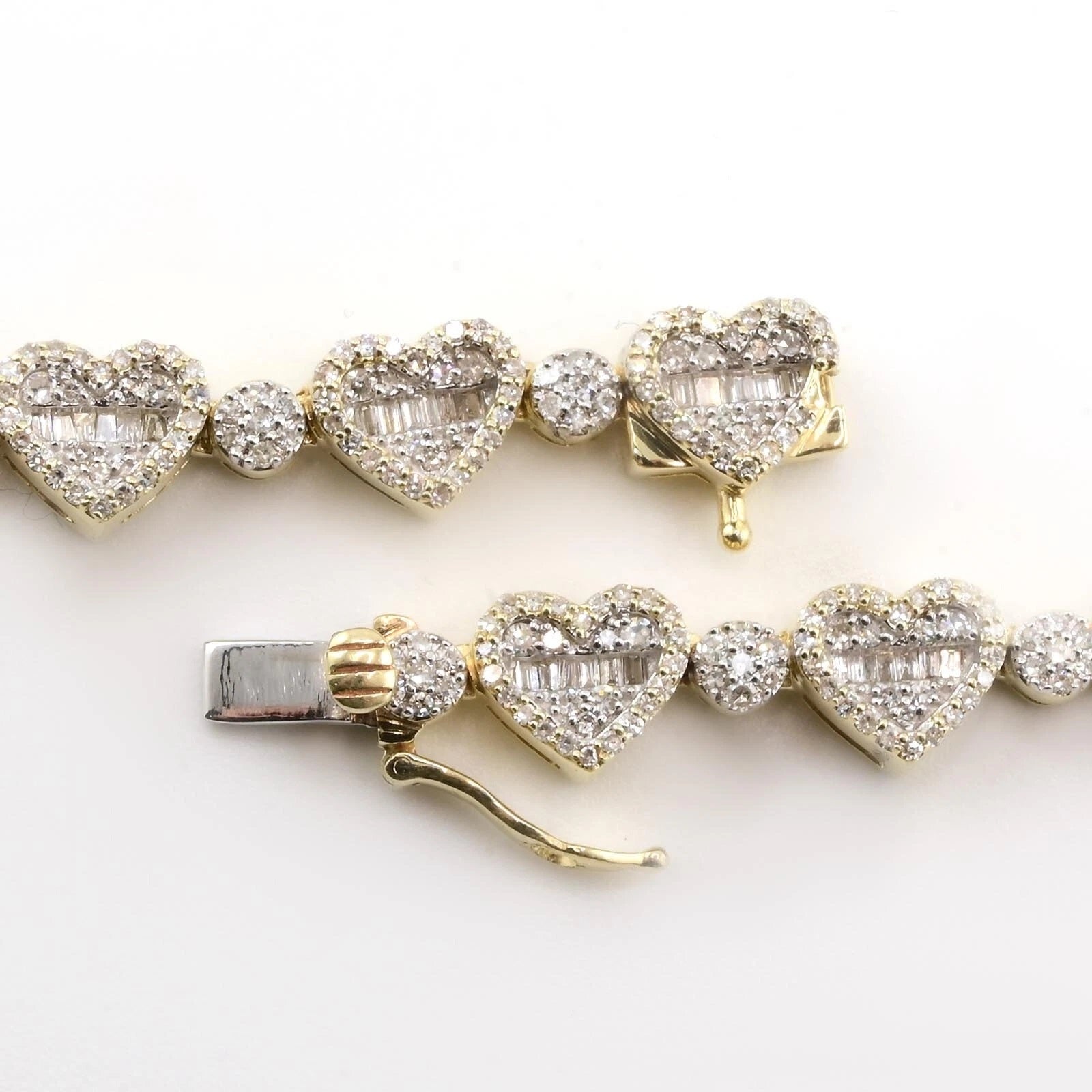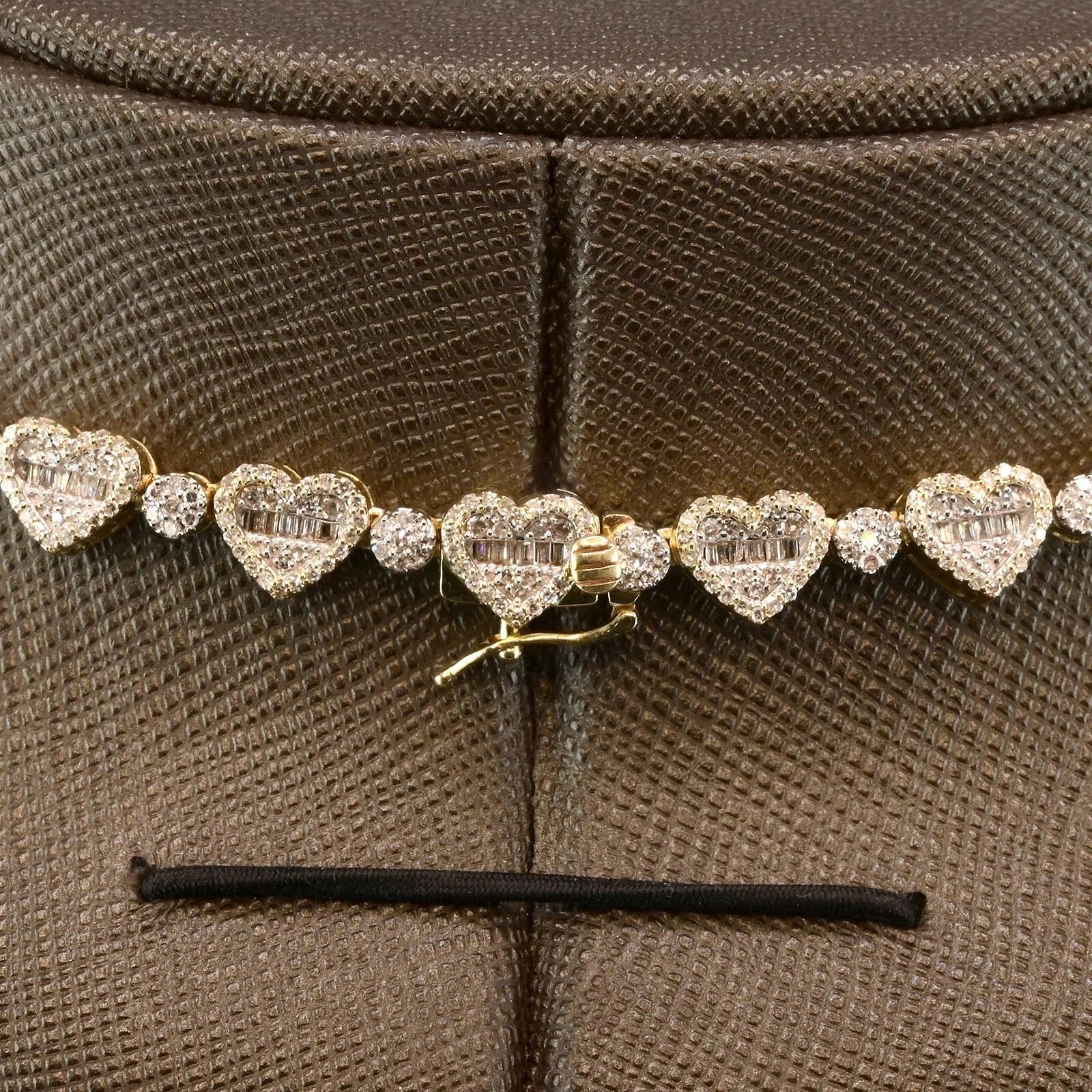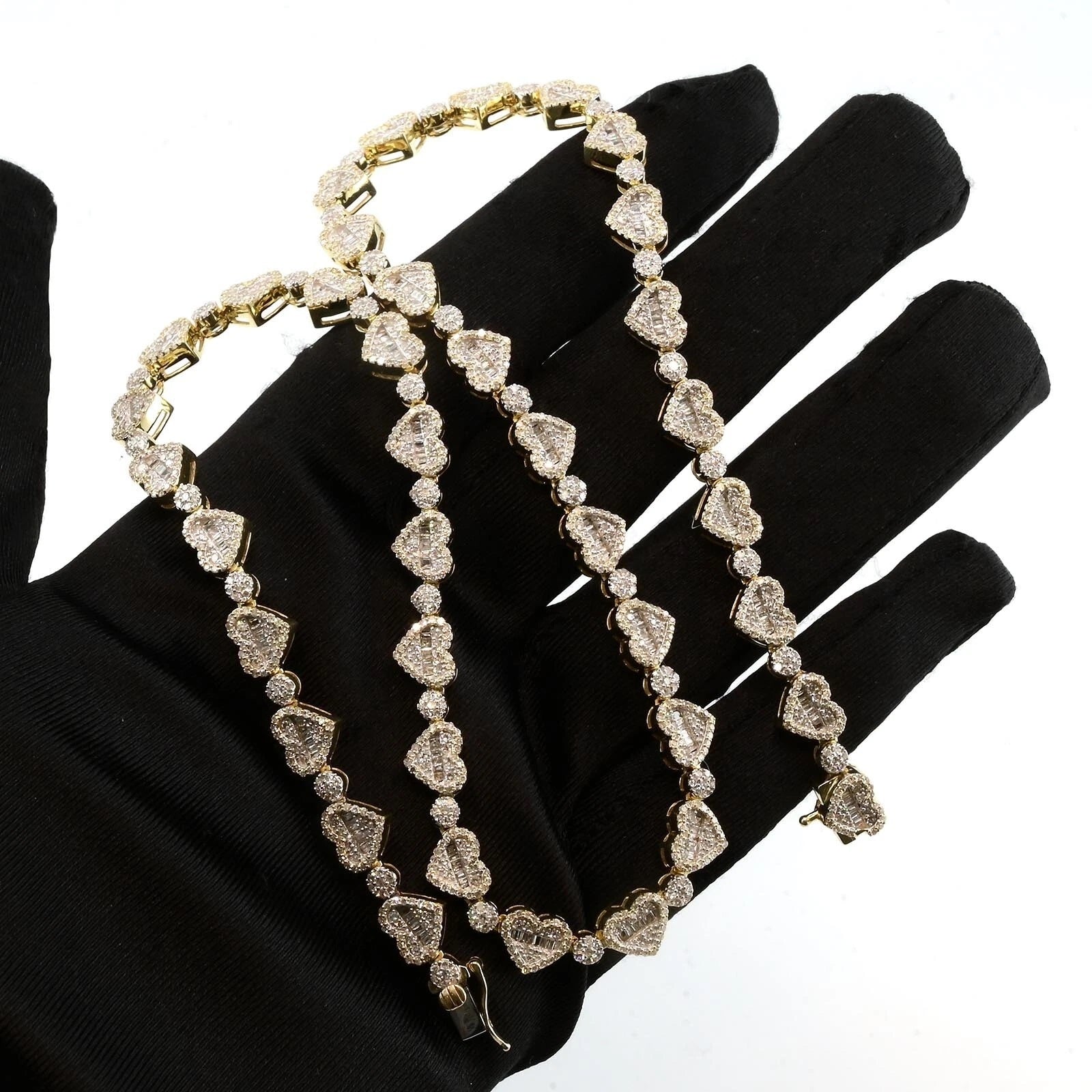This 18" Women's 7MM 10k Yellow Gold Heart Necklace features a stunning design with 6.1CTW of round and baguette diamonds. It is a classic and elegant piece suitable for various occasions such as anniversaries, weddings, birthdays, and more. The necklace is crafted from solid 10k gold with a polished finish, making it a high-quality and stylish accessory for adult women. It comes with an official appraisal document and is professionally tested and stamped for authenticity. The necklace comes in a complimentary SB Premium Jewelry Box, adding to its overall appeal.