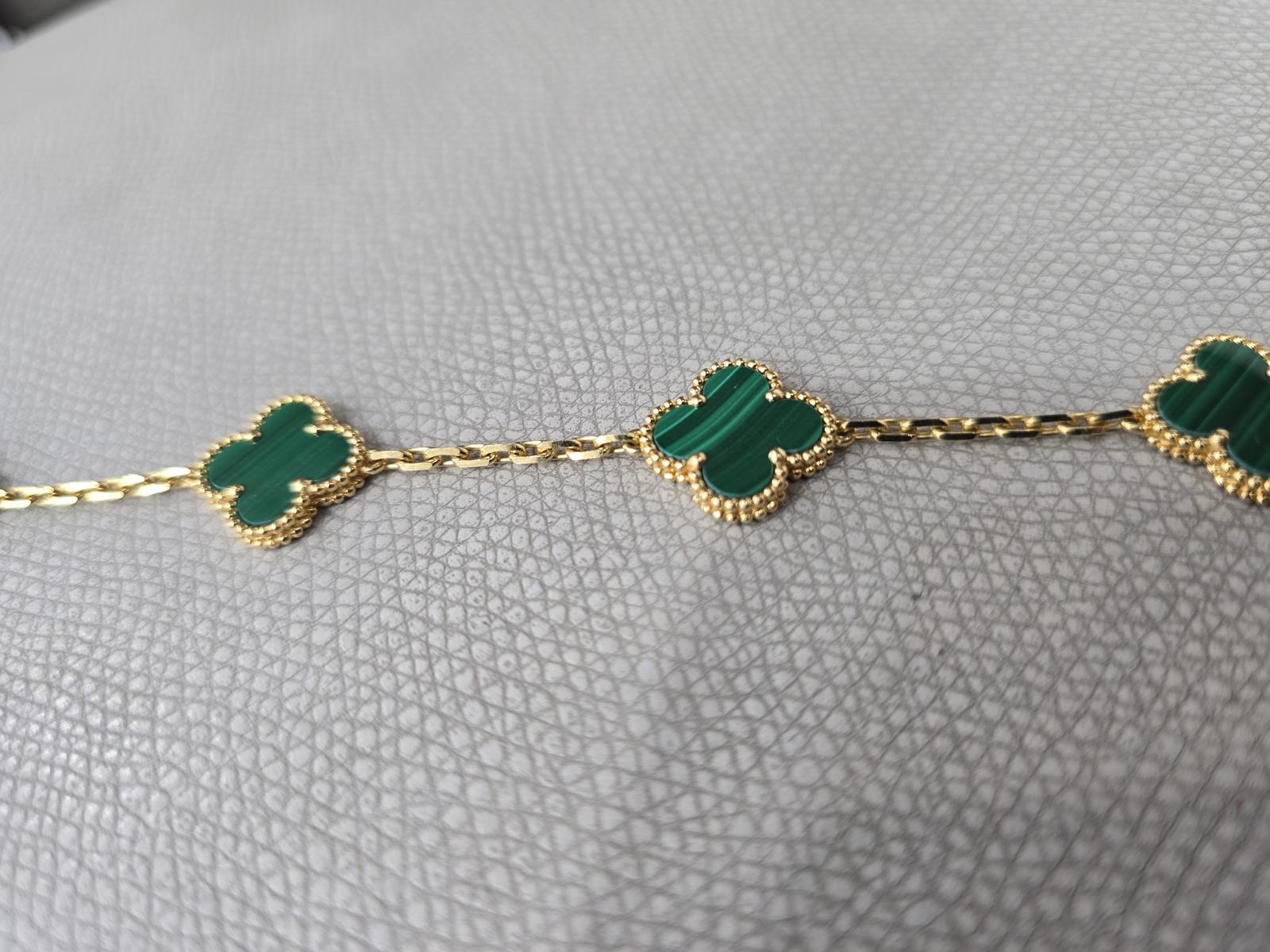 Elevate your style with our Noble Vintage Alhambra Five Motifs Malachite Clover Bracelet, a piece that effortlessly blends elegance and meaning. Featuring five interlocking clover motifs, this bracelet is a timeless addition to any wardrobe, perfect for complementing both casual and formal looks. Its classic design ensures versatility, making it suitable for any occasion.