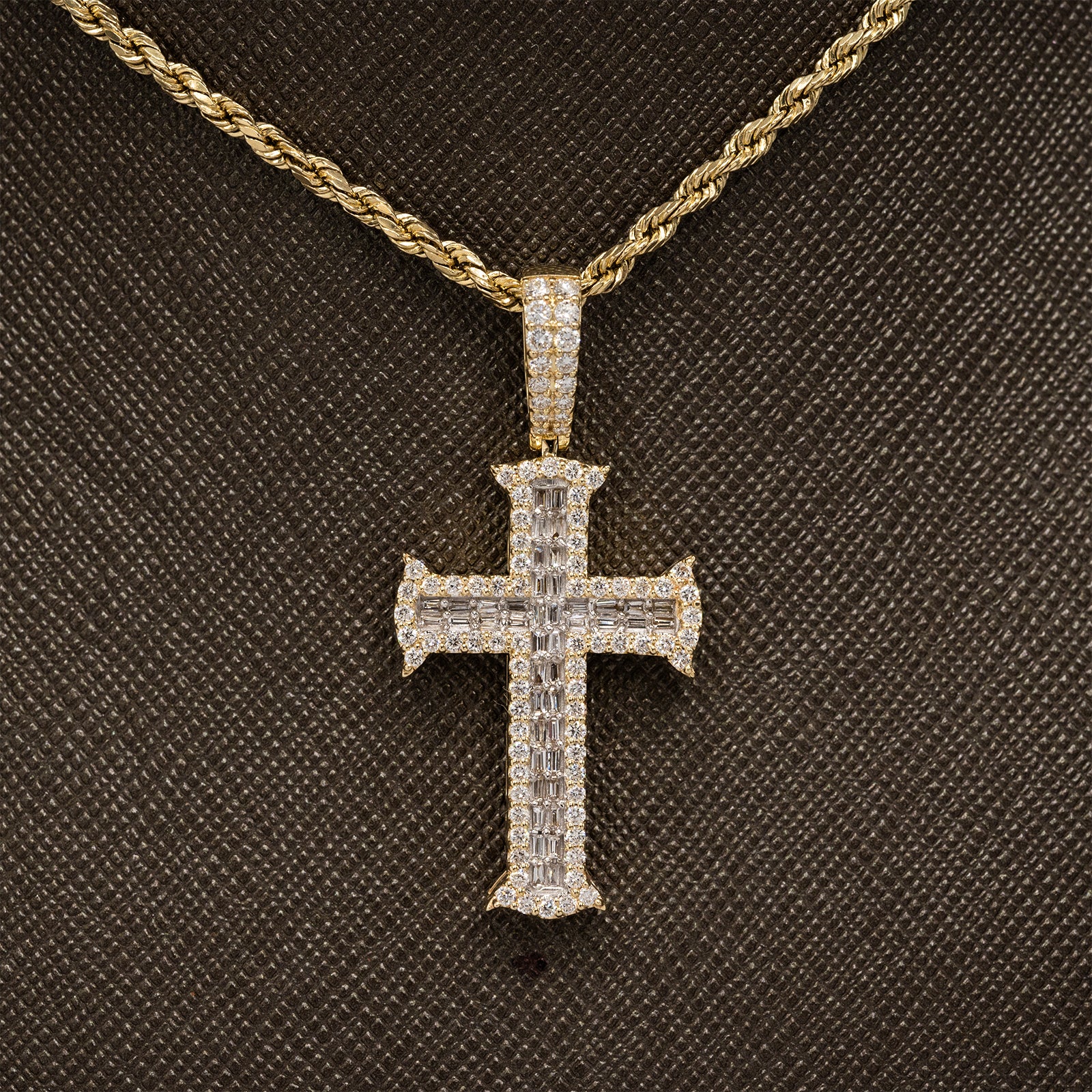 Crafted in 10k yellow gold, this 18mm double-layer cross charm features 1 carat total weight of lab-grown baguette diamonds, delivering refined brilliance with ethical sourcing. Weighing 4 grams, its layered design offers depth and sophistication, making it a distinguished accessory that complements both everyday and formal styles with expert craftsmanship and contemporary elegance.