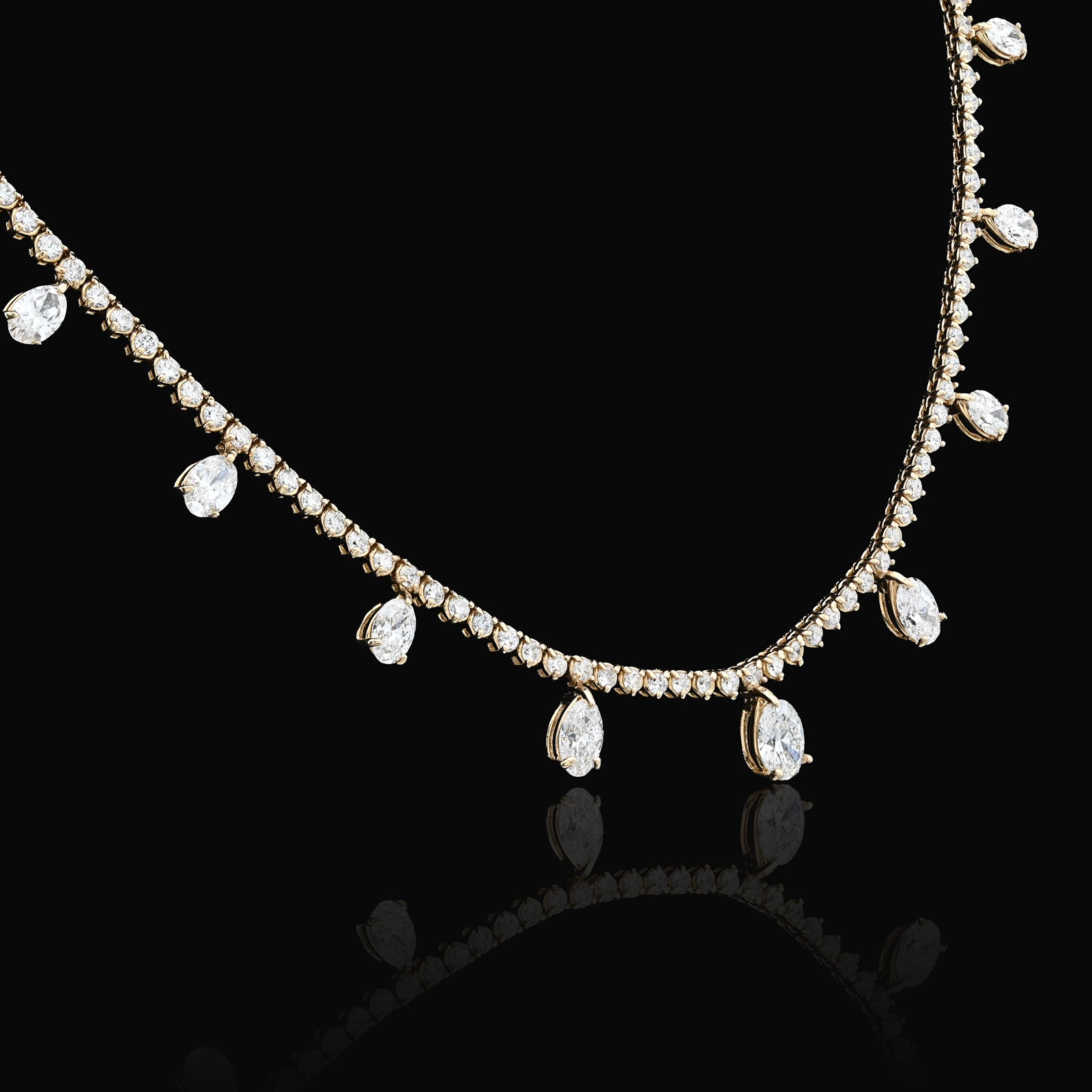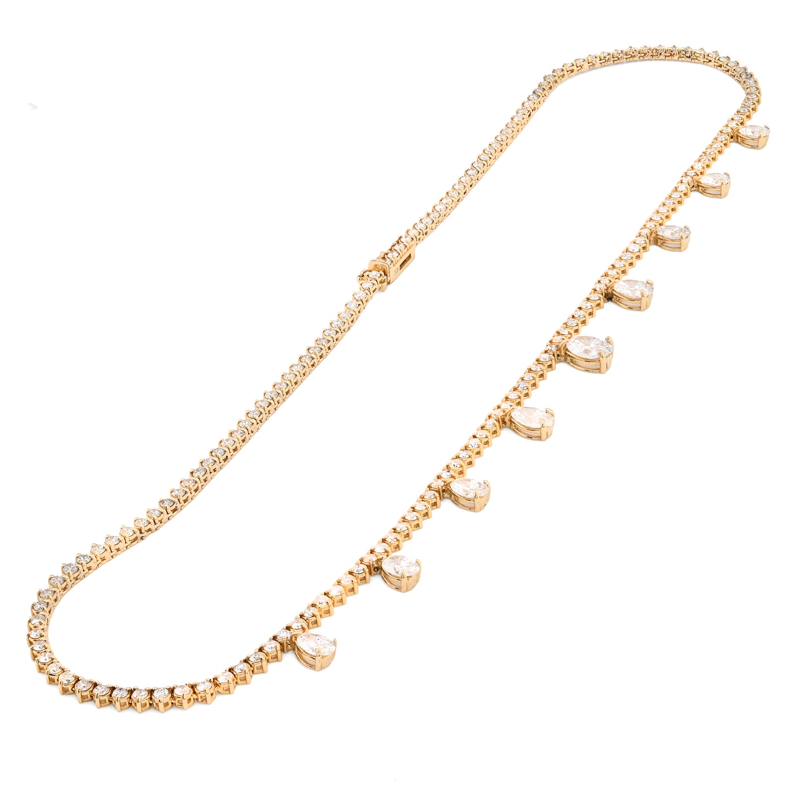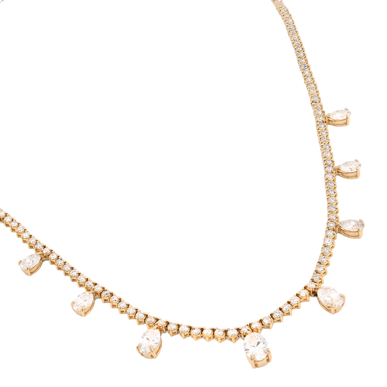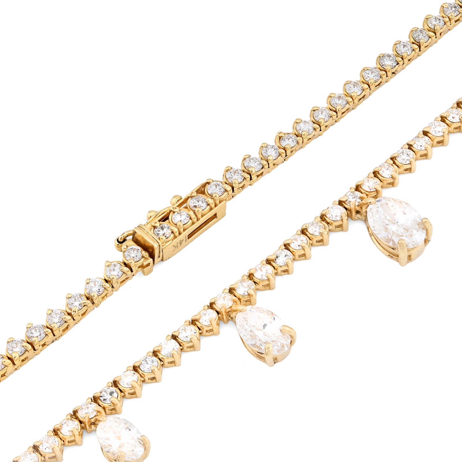 This refined 14k yellow gold tennis necklace showcases an elegant pear-shaped drop design adorned with 9.52 carats of lab diamonds. The delicate 2.9mm chain spans 17 inches, creating a graceful silhouette that complements both casual and formal ensembles. Weighing 18.8 grams, the piece balances substantial quality with wearable comfort. Lab diamonds offer exceptional brilliance and clarity while providing excellent value. Perfect for those seeking timeless sophistication with a contemporary edge, this necklace makes an understated yet impactful statement.