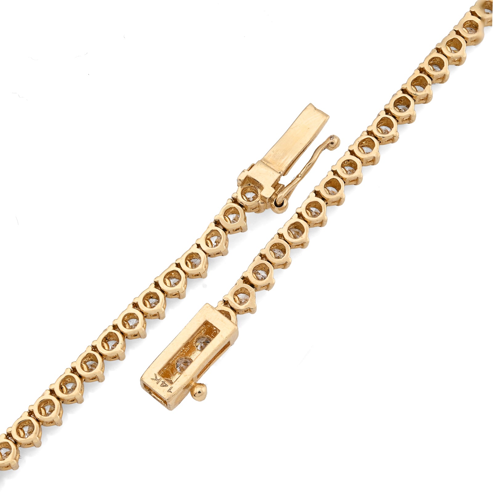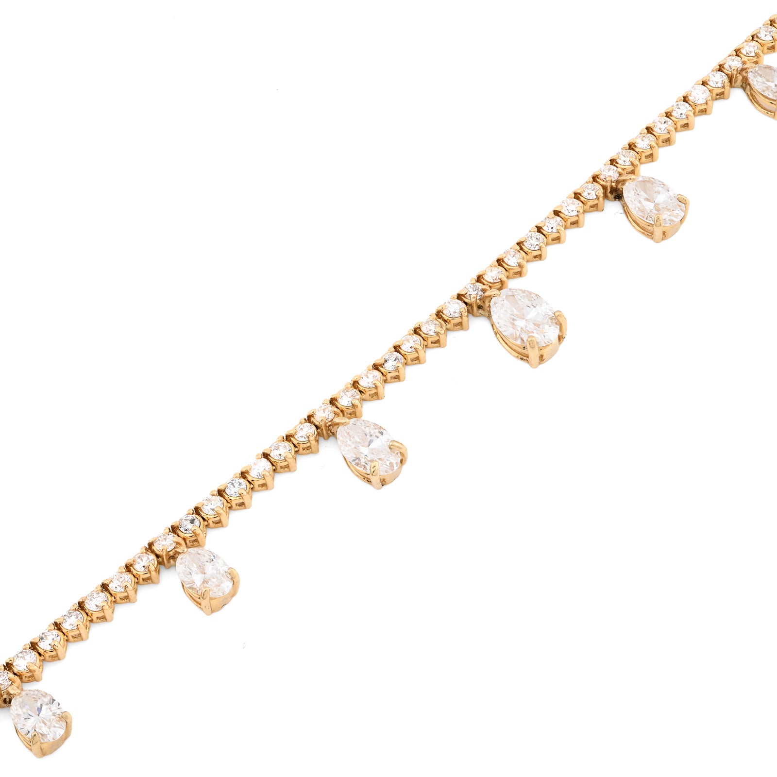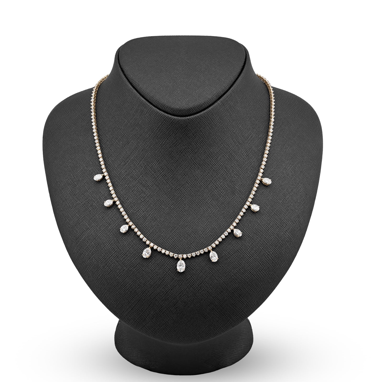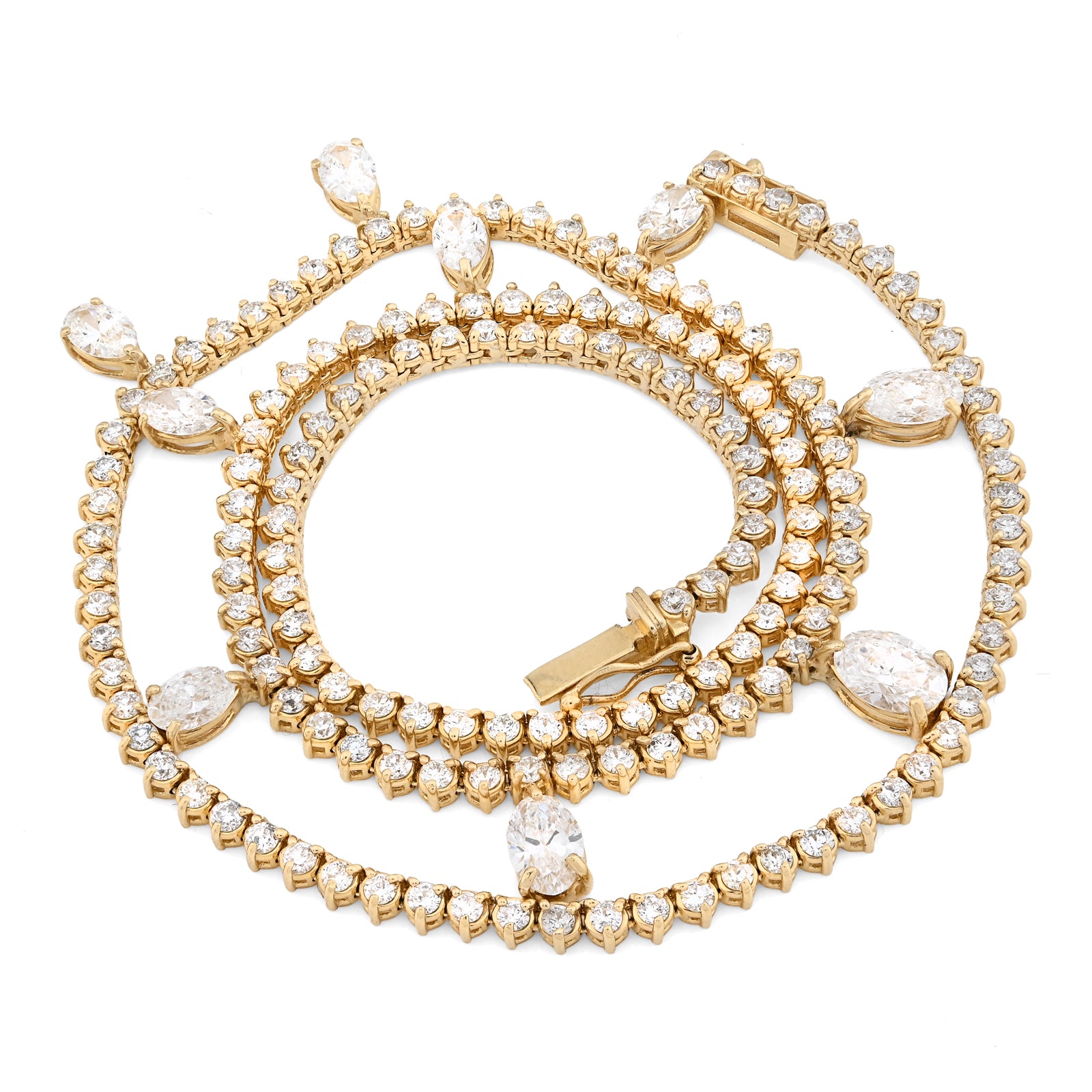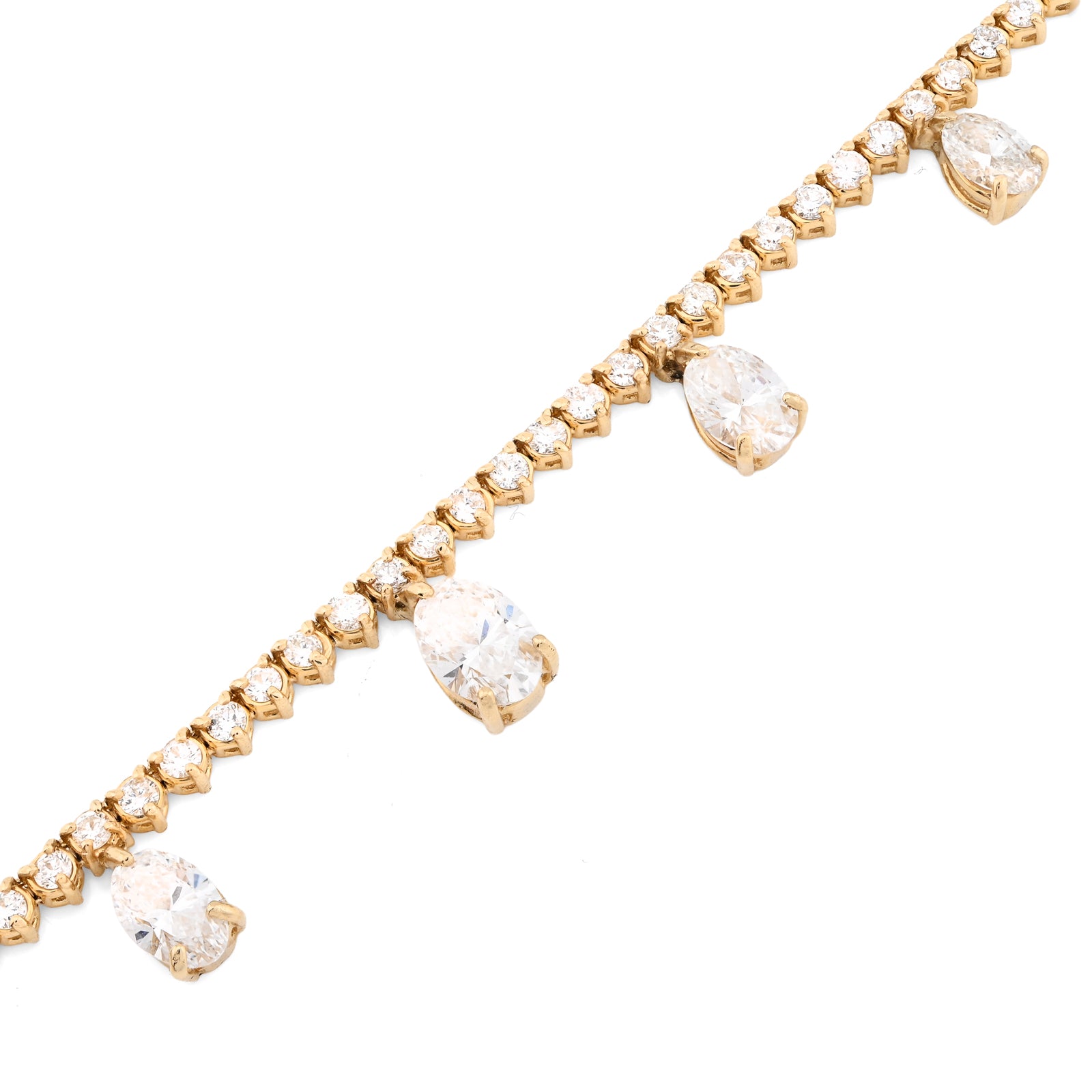 This refined 14k yellow gold tennis necklace showcases an elegant pear-shaped drop design adorned with 9.52 carats of lab diamonds. The delicate 2.9mm chain spans 17 inches, creating a graceful silhouette that complements both casual and formal ensembles. Weighing 18.8 grams, the piece balances substantial quality with wearable comfort. Lab diamonds offer exceptional brilliance and clarity while providing excellent value. Perfect for those seeking timeless sophistication with a contemporary edge, this necklace makes an understated yet impactful statement.