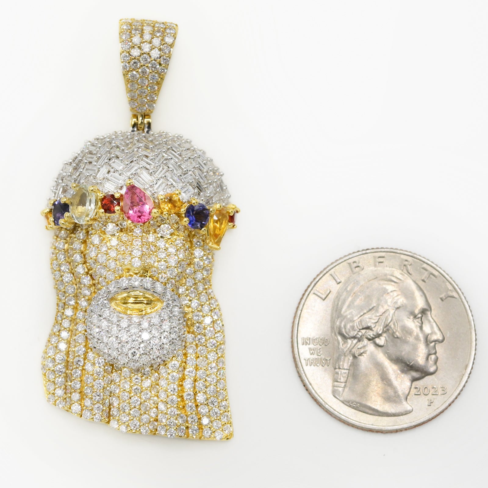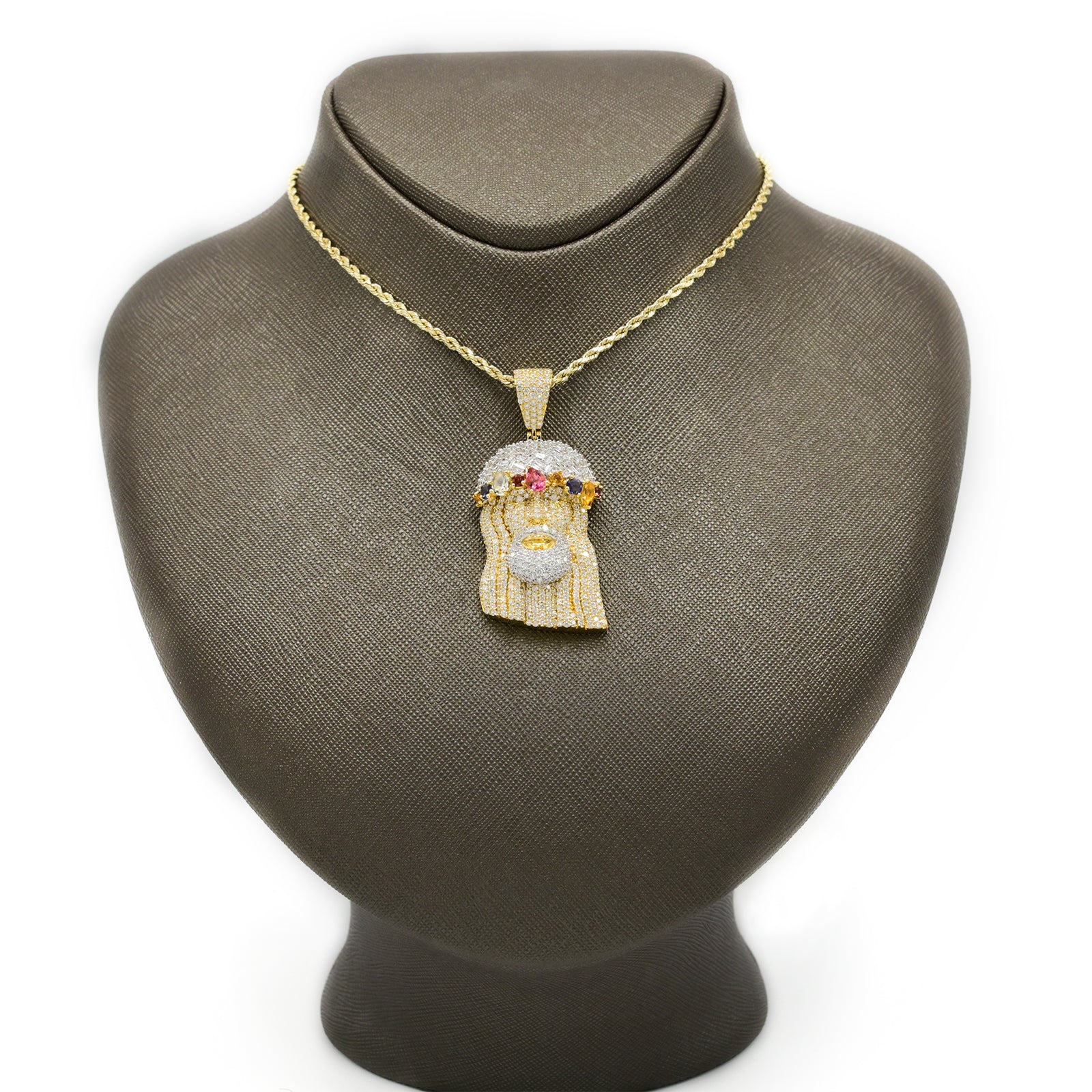 Crafted from 10k yellow gold, this 20mm Jesus Head charm pendant features 5.95 carats of lab-grown diamonds, delivering exceptional brilliance with sustainable appeal. Weighing 12.2 grams, its substantial construction ensures durability while the intricate detailing highlights expert craftsmanship. Ideal for those seeking a meaningful statement piece combining luxury with ethical sourcing.
