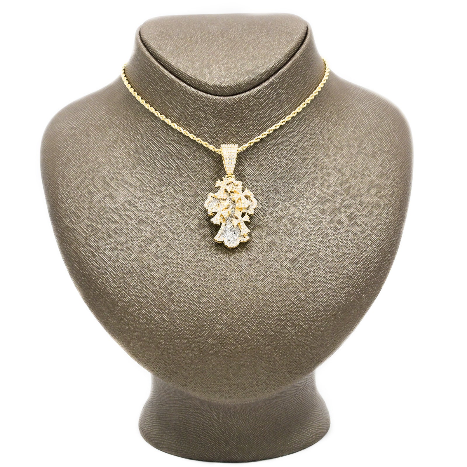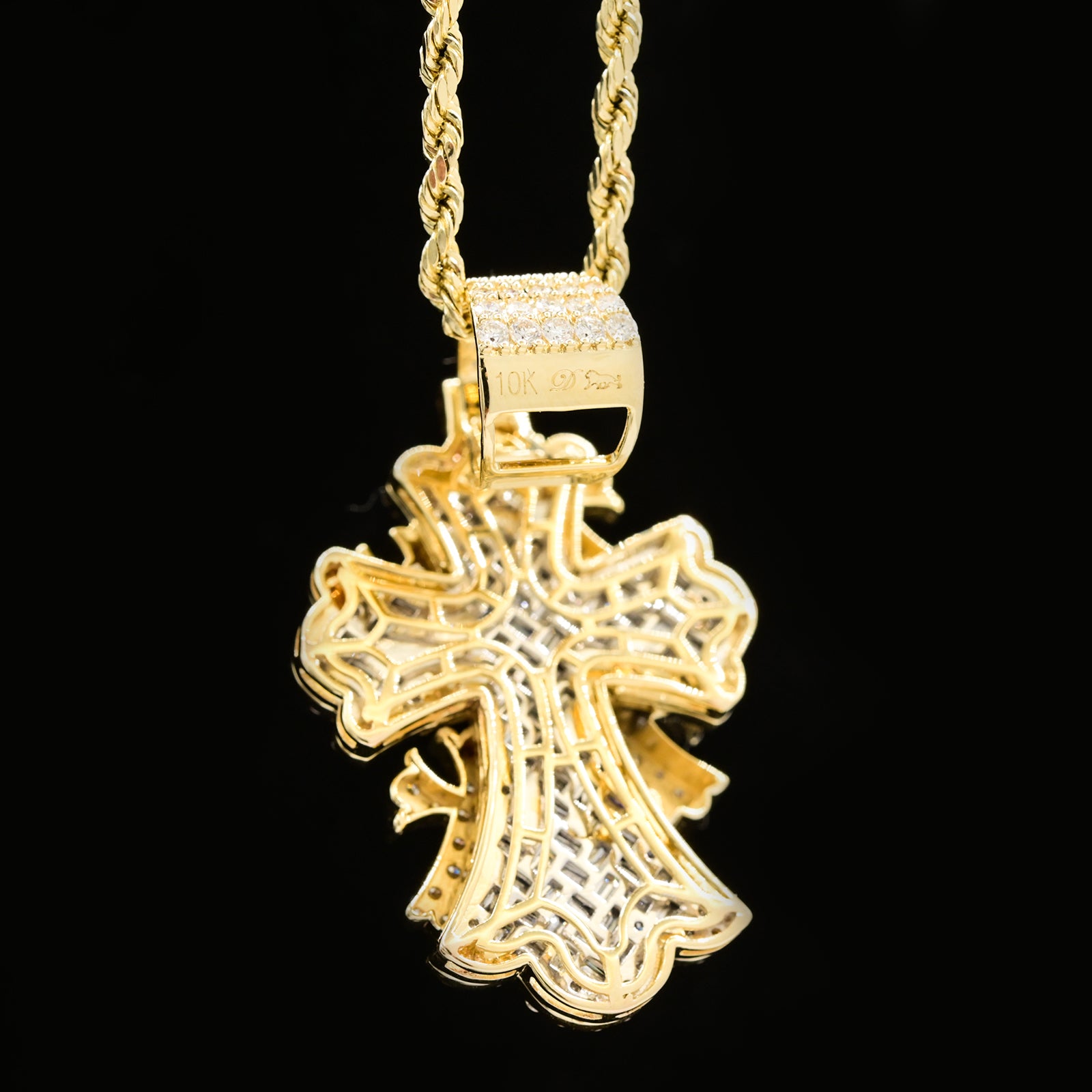 Crafted from 10k yellow gold, this 23mm cross pendant features 3 carats total weight of lab-grown baguette diamonds, offering a sophisticated and ethically sourced sparkle. Weighing 9.7 grams, this piece includes four smaller cross charms, adding dimension and movement to the design. Perfect for those seeking a refined religious symbol with contemporary brilliance and enduring value.