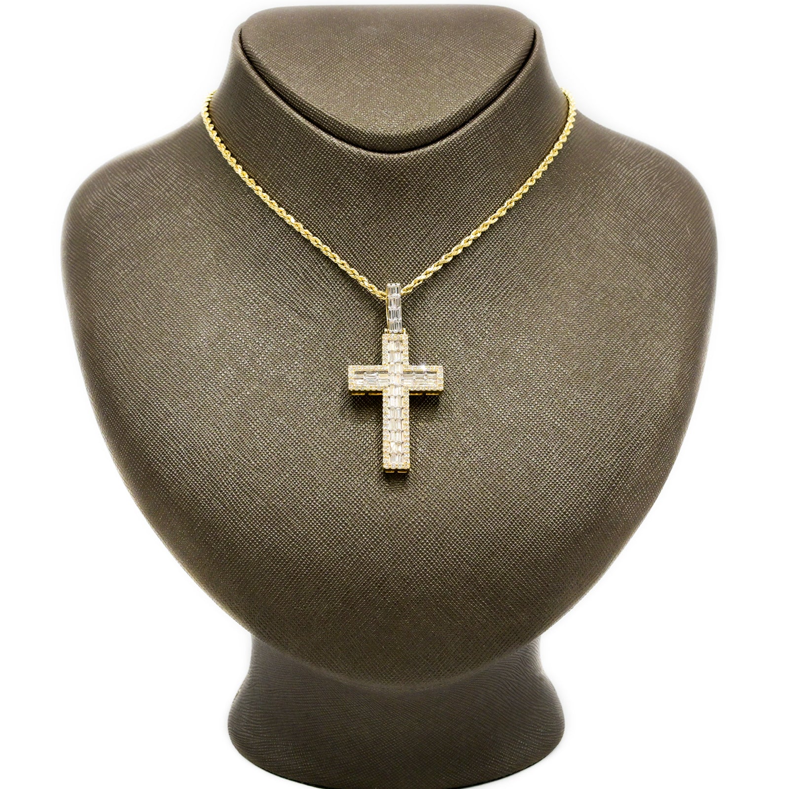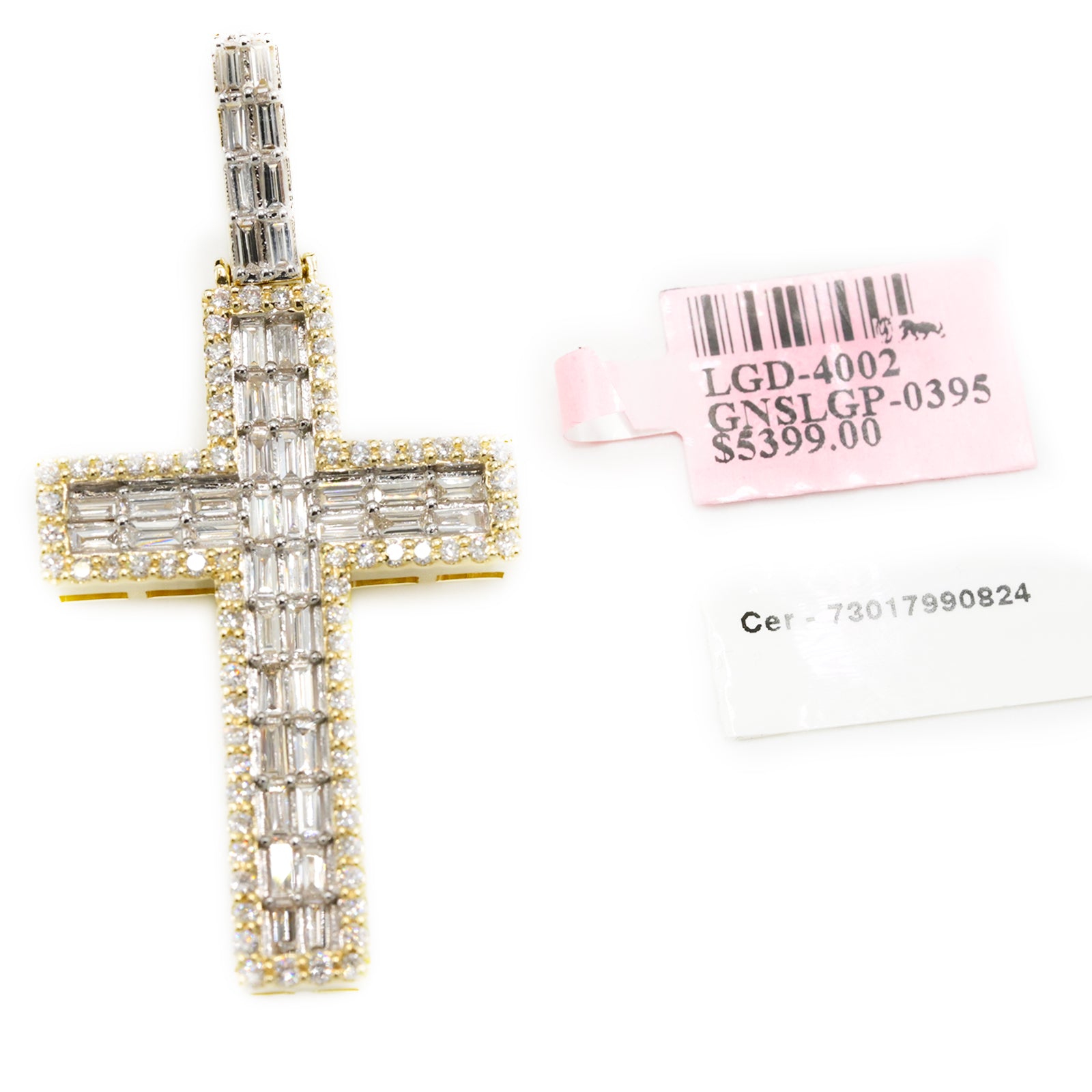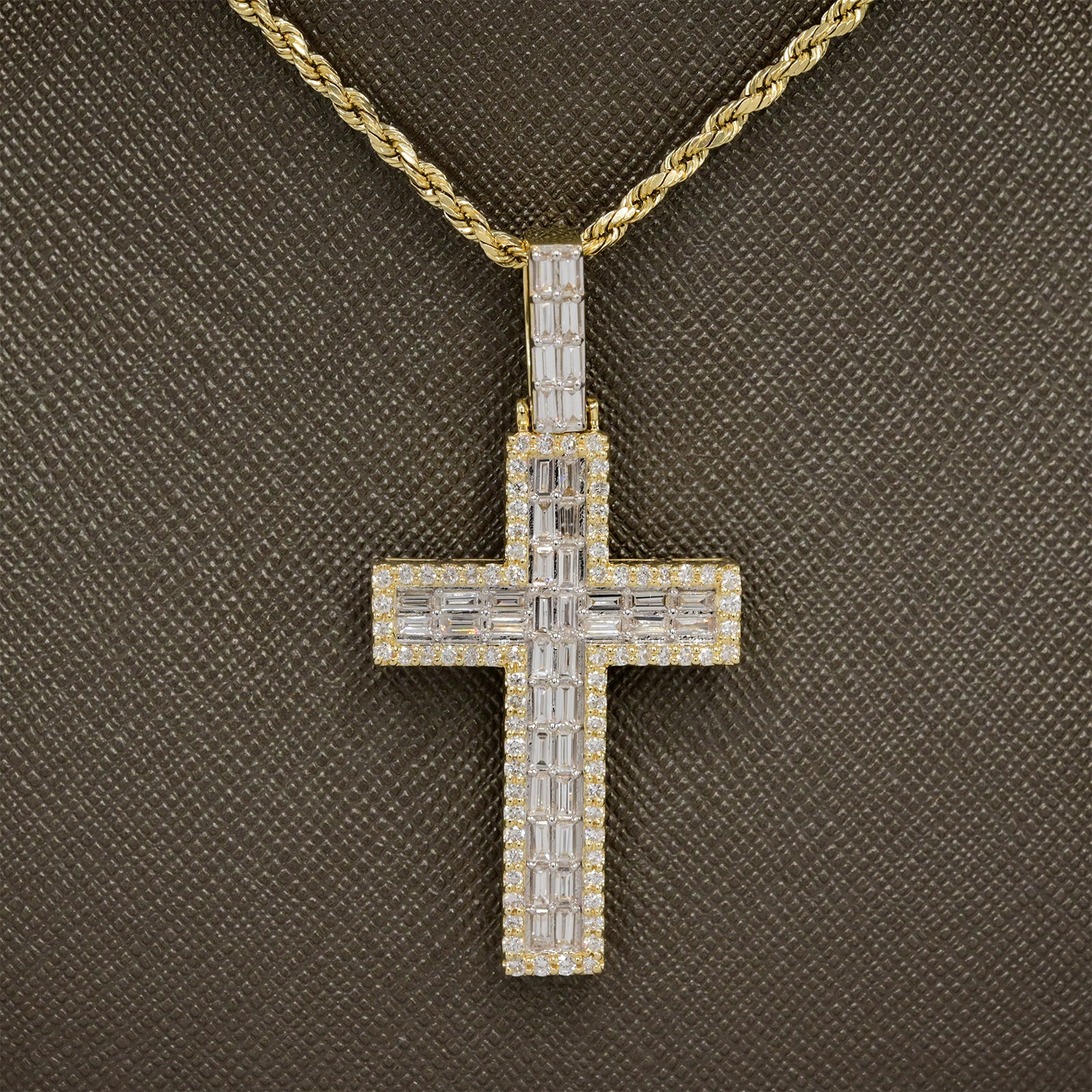 This 25mm cross charm features 1.9 carats total weight of lab-grown baguette diamonds set in 10k yellow gold, weighing 8 grams and crafted in a distinctive two-layer design.