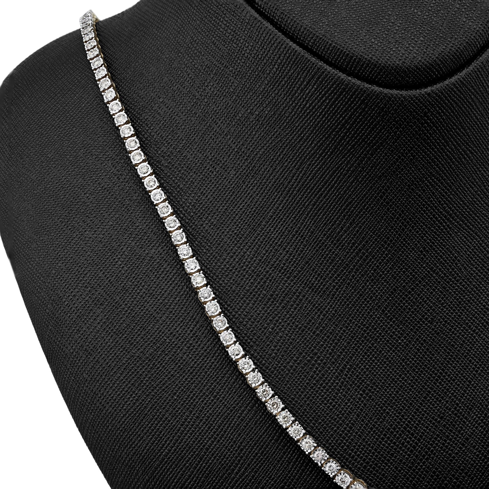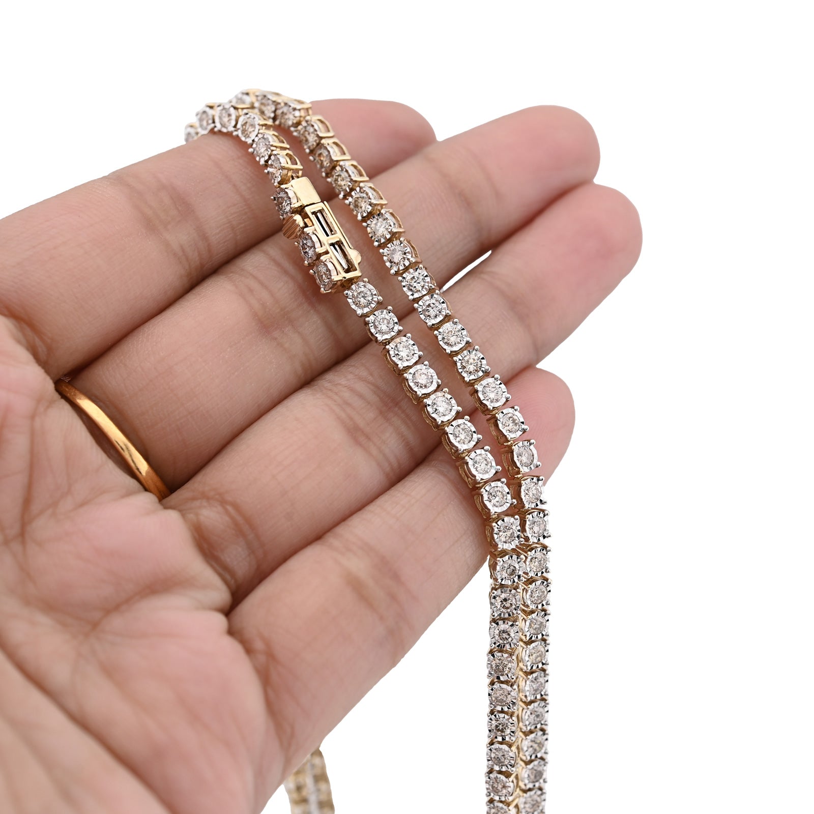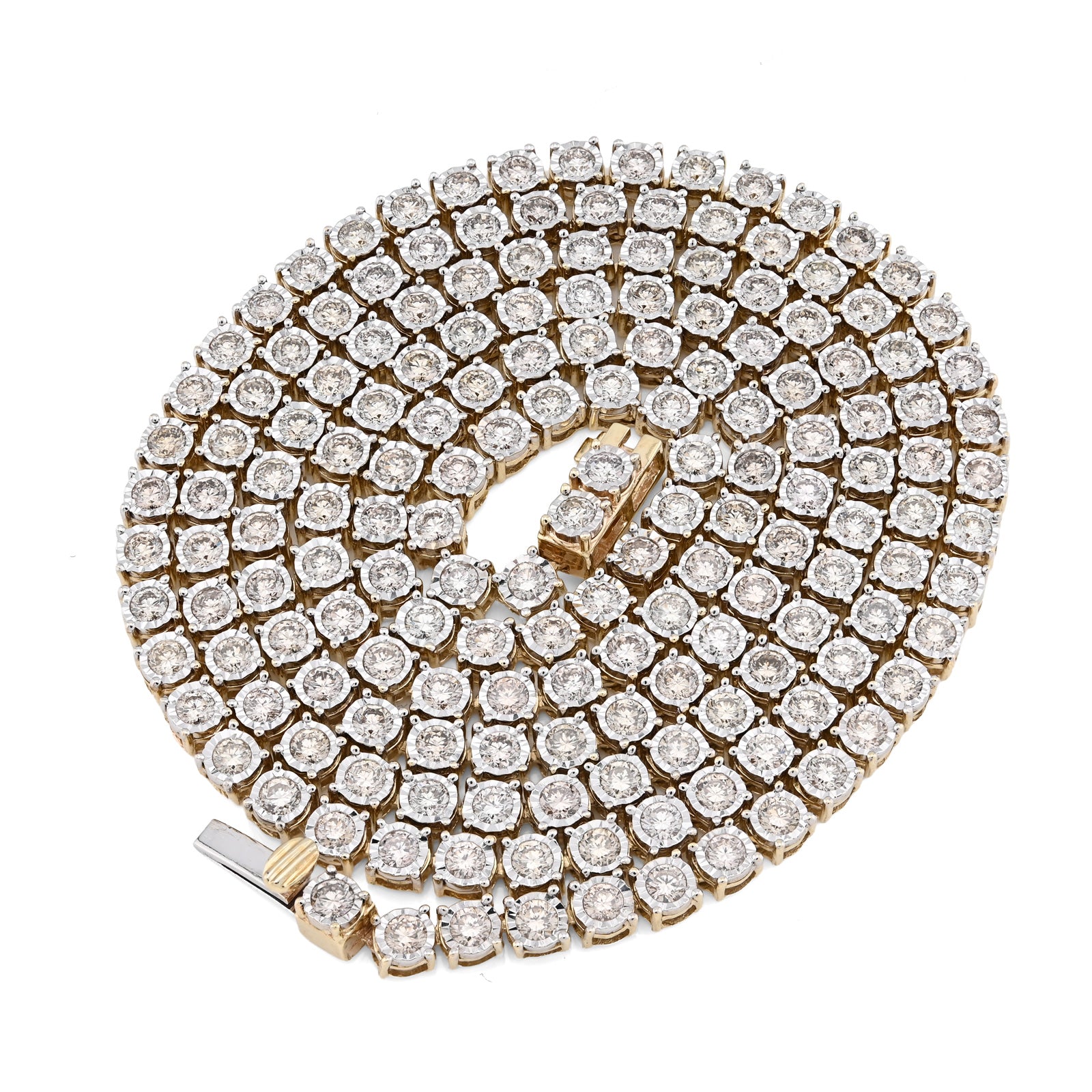 Enchant with this refined 10k yellow gold tennis chain necklace, where optical artistry meets genuine luxury. The delicate 3mm illusion settings create a sophisticated visual effect that amplifies the appearance of brilliance, making 9.50 carats of natural diamonds shimmer with extraordinary radiance. The ingenious illusion design maximizes light reflection through strategic stone placement and setting geometry, delivering impressive sparkle that belies the refined proportions. Weighing 24 grams, this necklace balances substantial presence with comfortable wearability, perfect for extended wear without fatigue. The warm, luminous finish of 10k yellow gold provides an elegant foundation that enhances the diamond settings while developing character over time. The illusion technique appeals to discerning collectors who appreciate sophisticated design innovation and exceptional value. This necklace transcends conventional tennis chains, functioning as a personal statement of refined taste and appreciation for jewelry craftsmanship—equally stunning for special occasions or cherished everyday elegance.