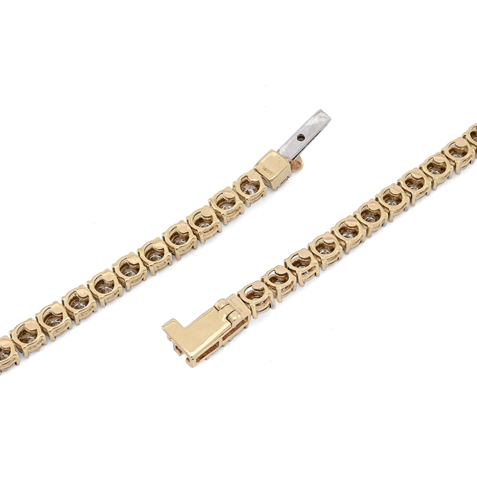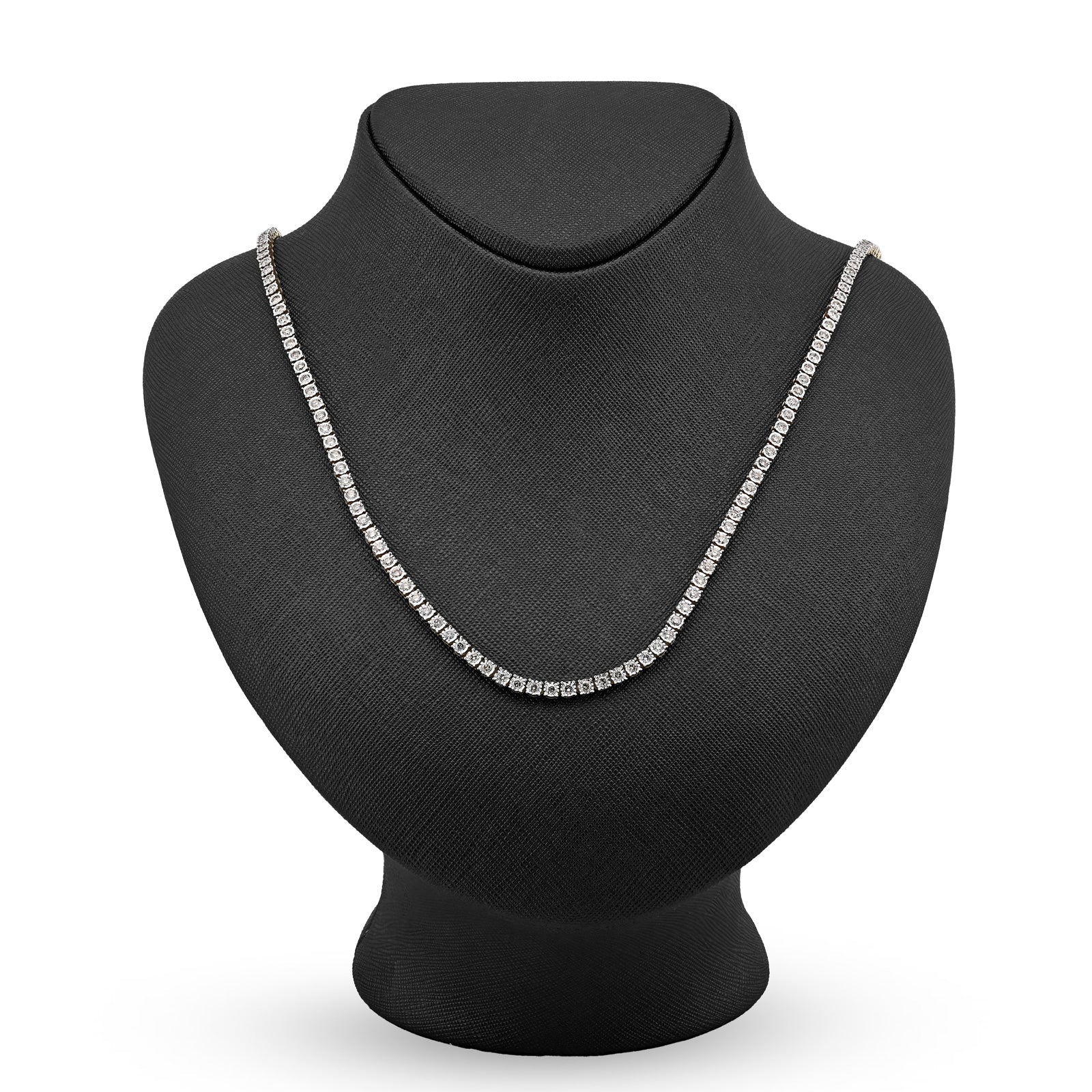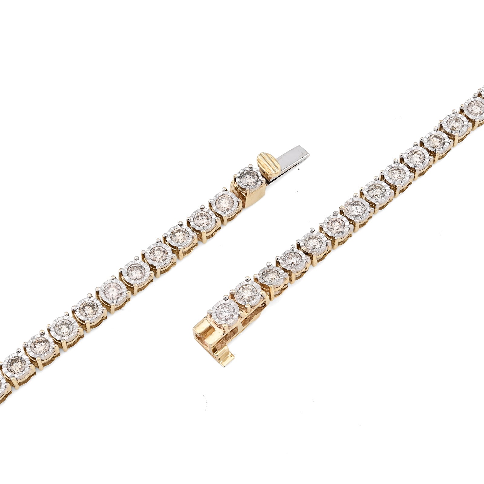 Enchant with this refined 10k yellow gold tennis chain necklace, where optical artistry meets genuine luxury. The delicate 3mm illusion settings create a sophisticated visual effect that amplifies the appearance of brilliance, making 9.50 carats of natural diamonds shimmer with extraordinary radiance. The ingenious illusion design maximizes light reflection through strategic stone placement and setting geometry, delivering impressive sparkle that belies the refined proportions. Weighing 24 grams, this necklace balances substantial presence with comfortable wearability, perfect for extended wear without fatigue. The warm, luminous finish of 10k yellow gold provides an elegant foundation that enhances the diamond settings while developing character over time. The illusion technique appeals to discerning collectors who appreciate sophisticated design innovation and exceptional value. This necklace transcends conventional tennis chains, functioning as a personal statement of refined taste and appreciation for jewelry craftsmanship—equally stunning for special occasions or cherished everyday elegance.