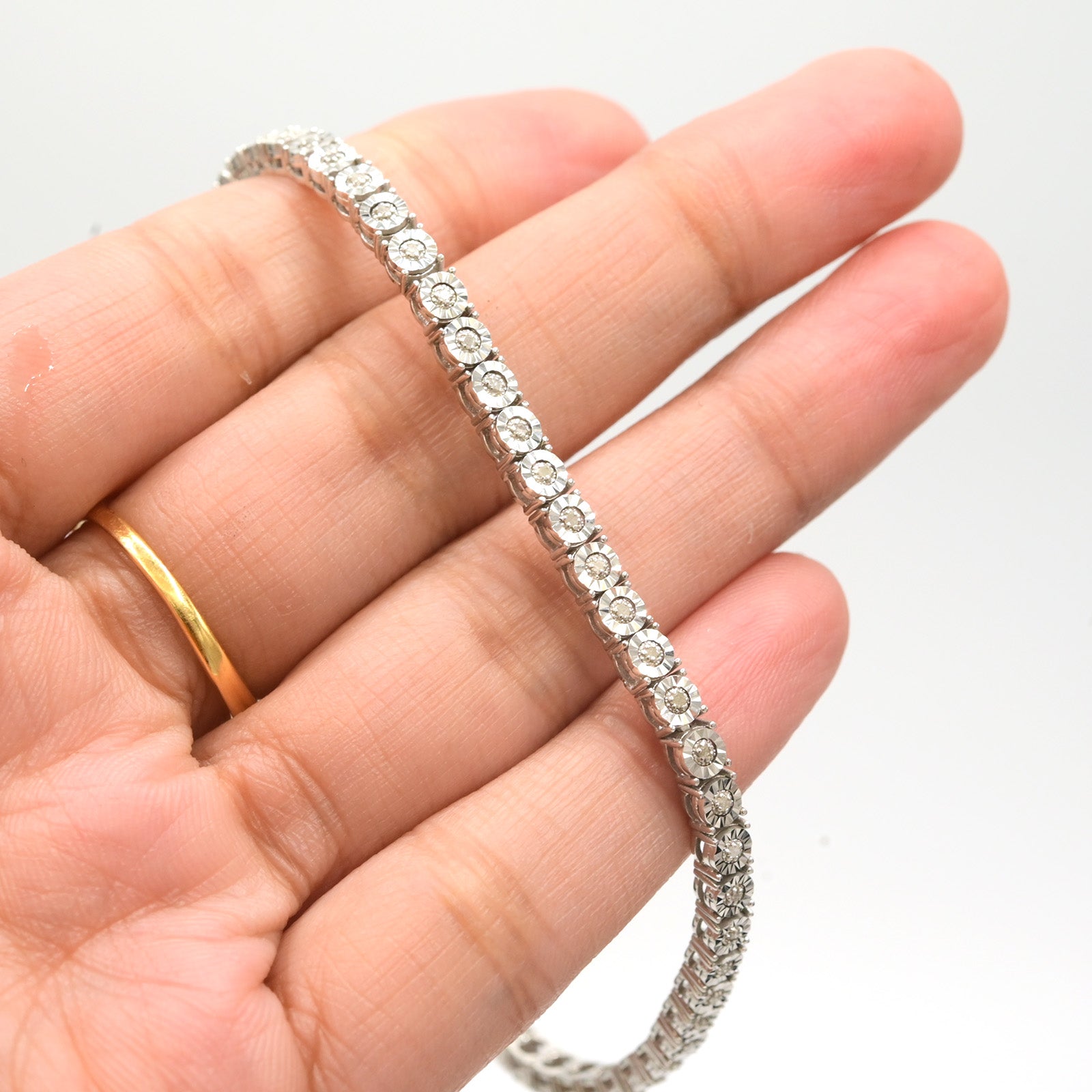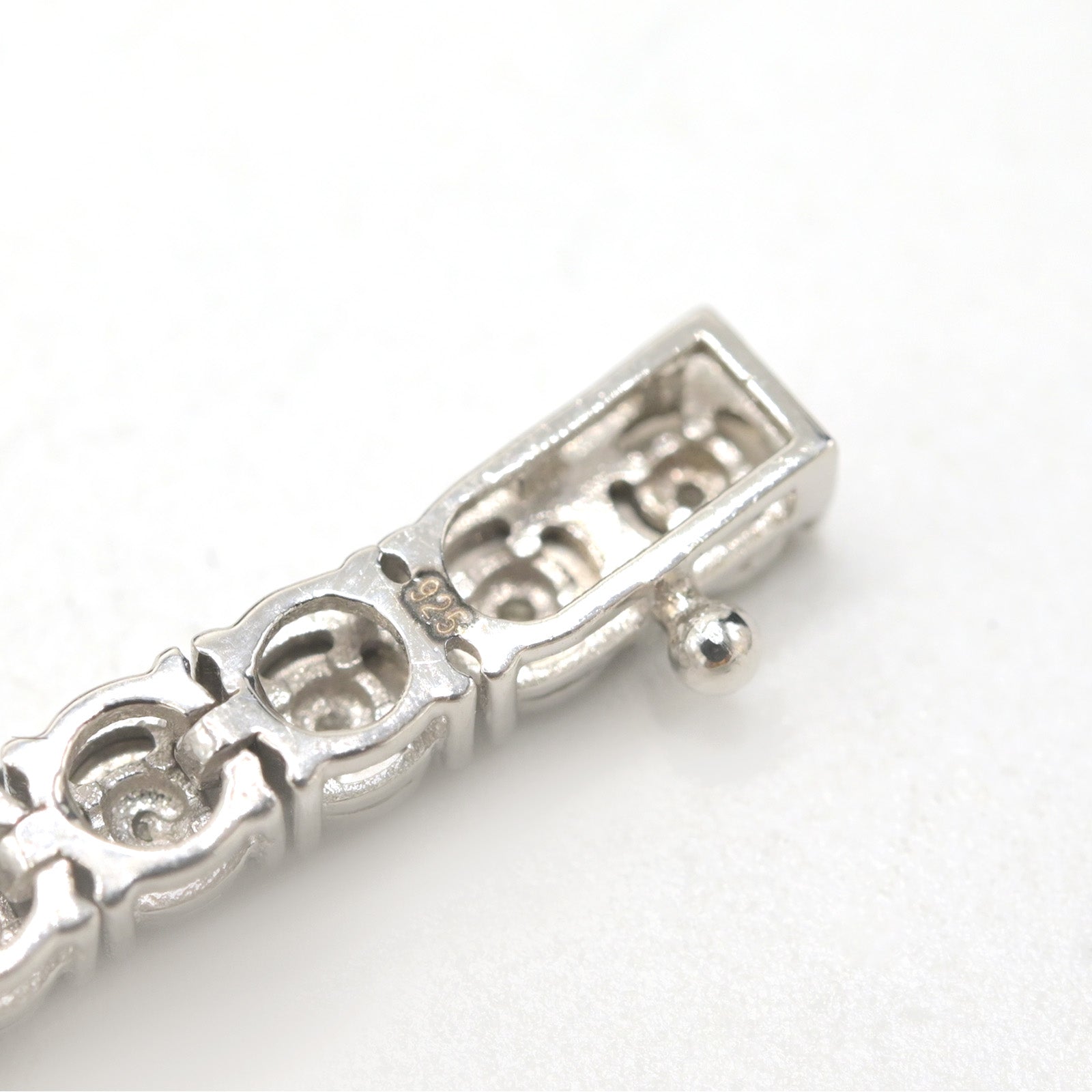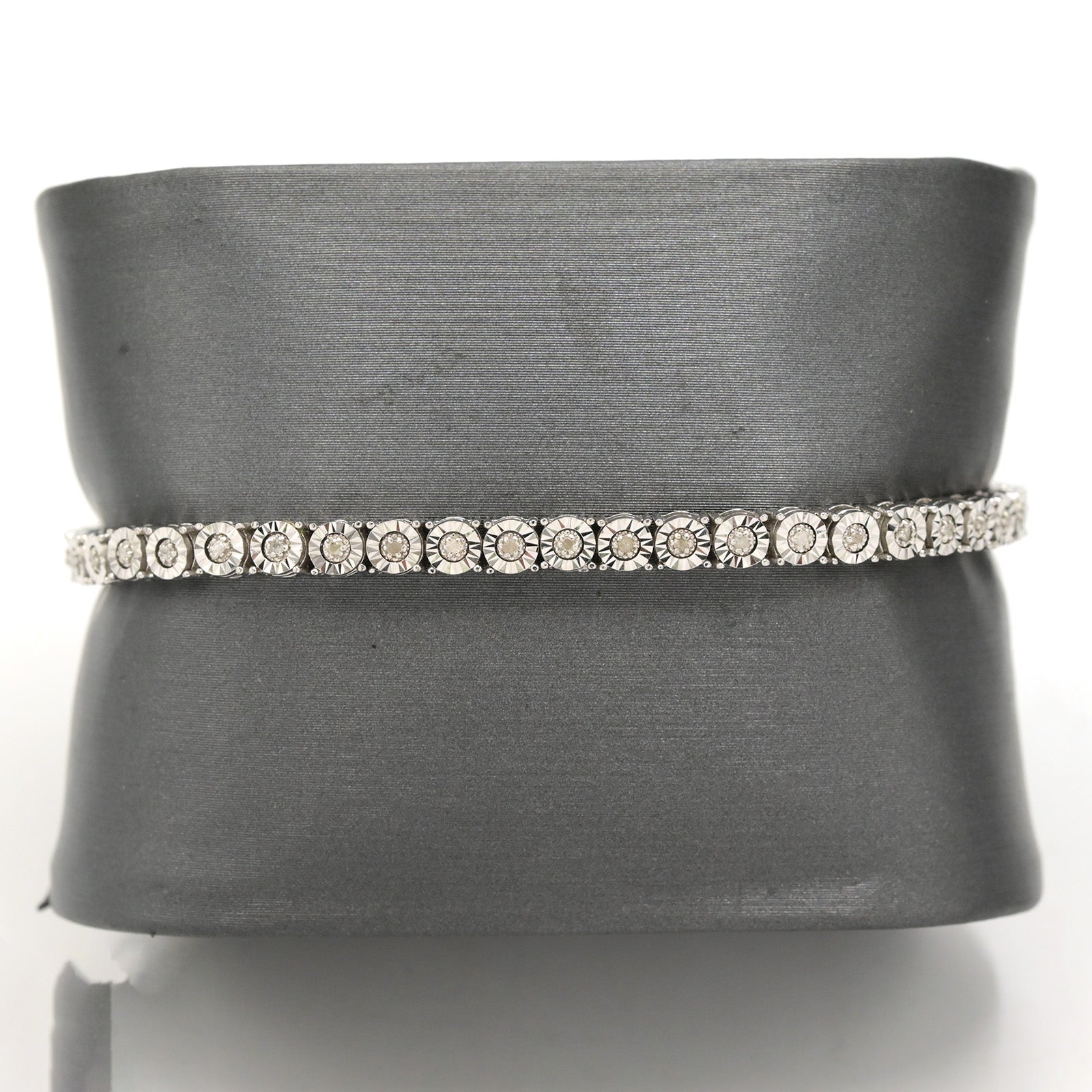 This 8-inch tennis bracelet is crafted from 925 sterling silver, featuring 0.6 carats of natural diamonds and weighing 9.7 grams, offering a sleek and sophisticated design.