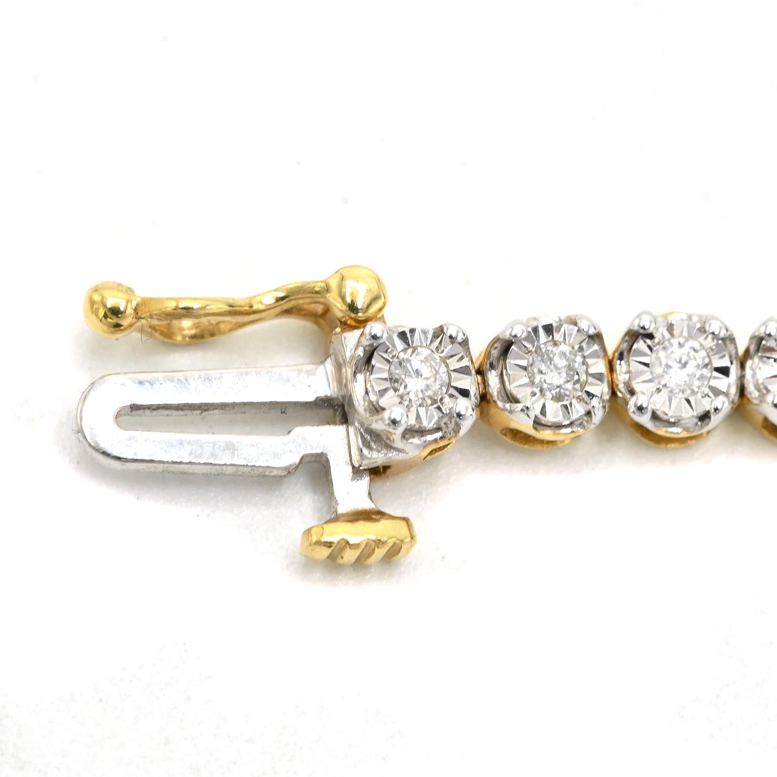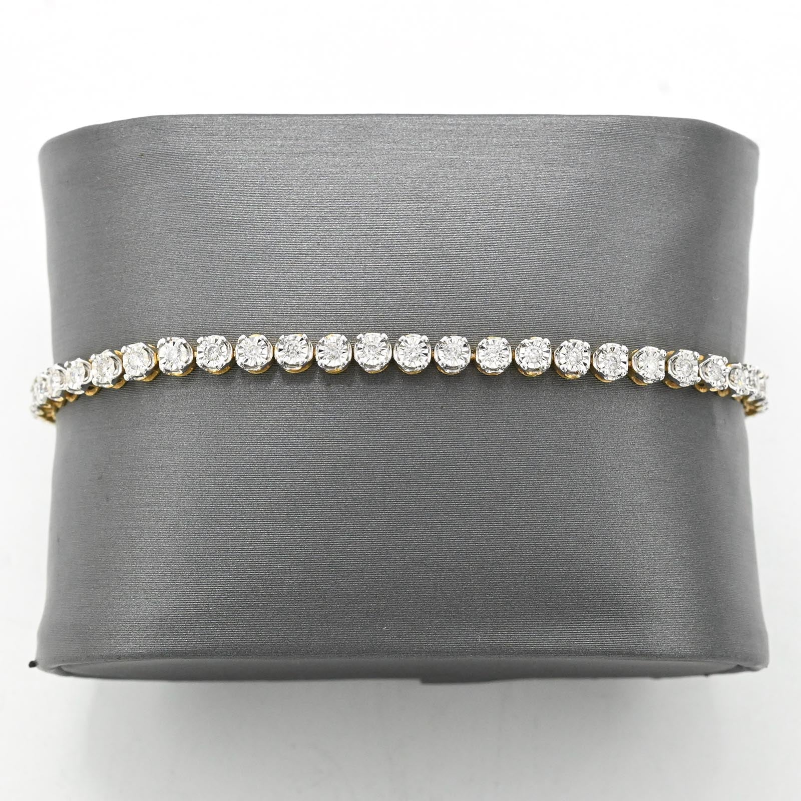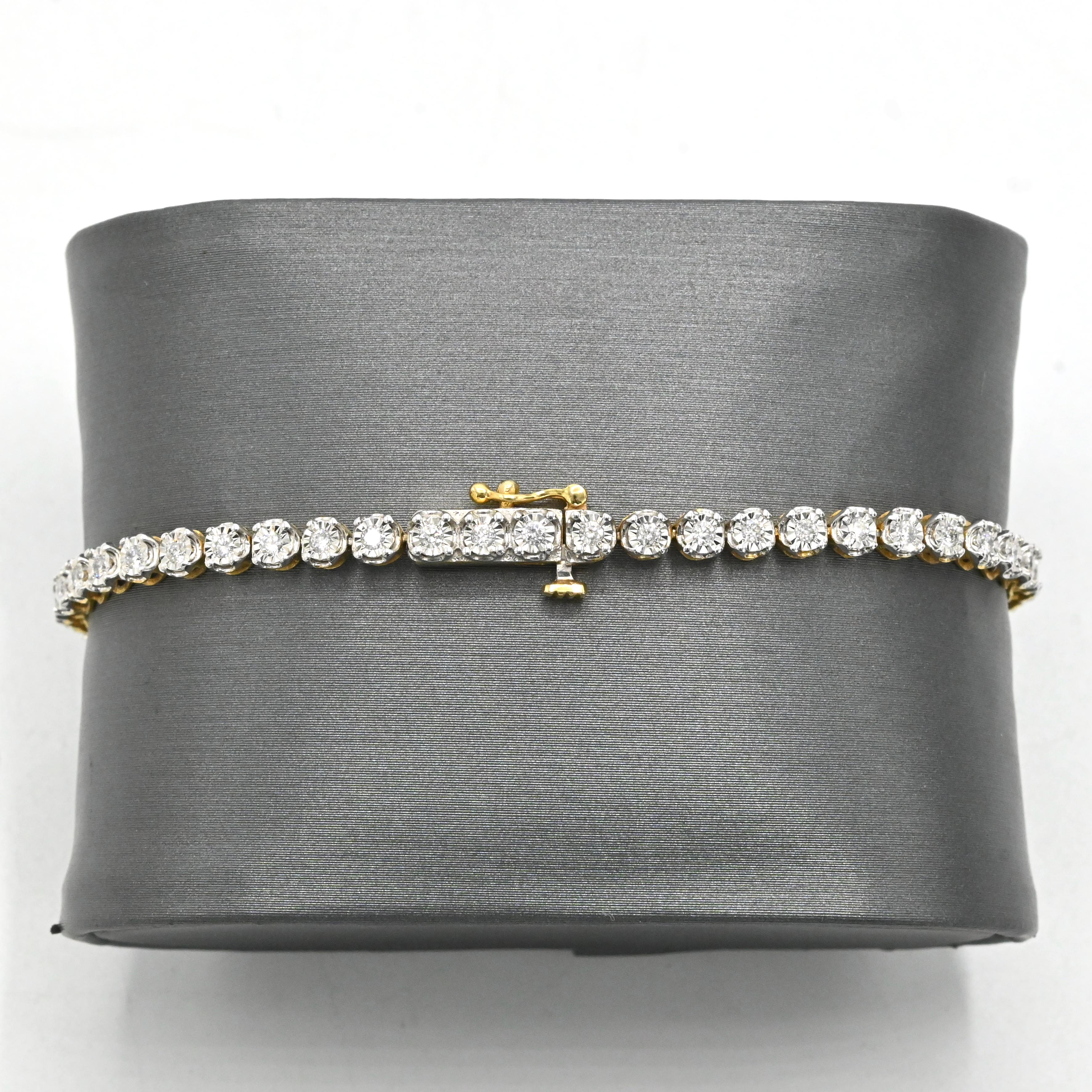 This 7-inch tennis bracelet showcases 4mm links crafted from 10K two-tone gold, seamlessly blending elegance and versatility. Featuring 0.9 carats of real diamonds, it offers a refined sparkle while maintaining a comfortable 5.9-gram weight for everyday wear. Its expert design ensures durability and timeless style, making it an ideal choice for those seeking subtle luxury with lasting quality.