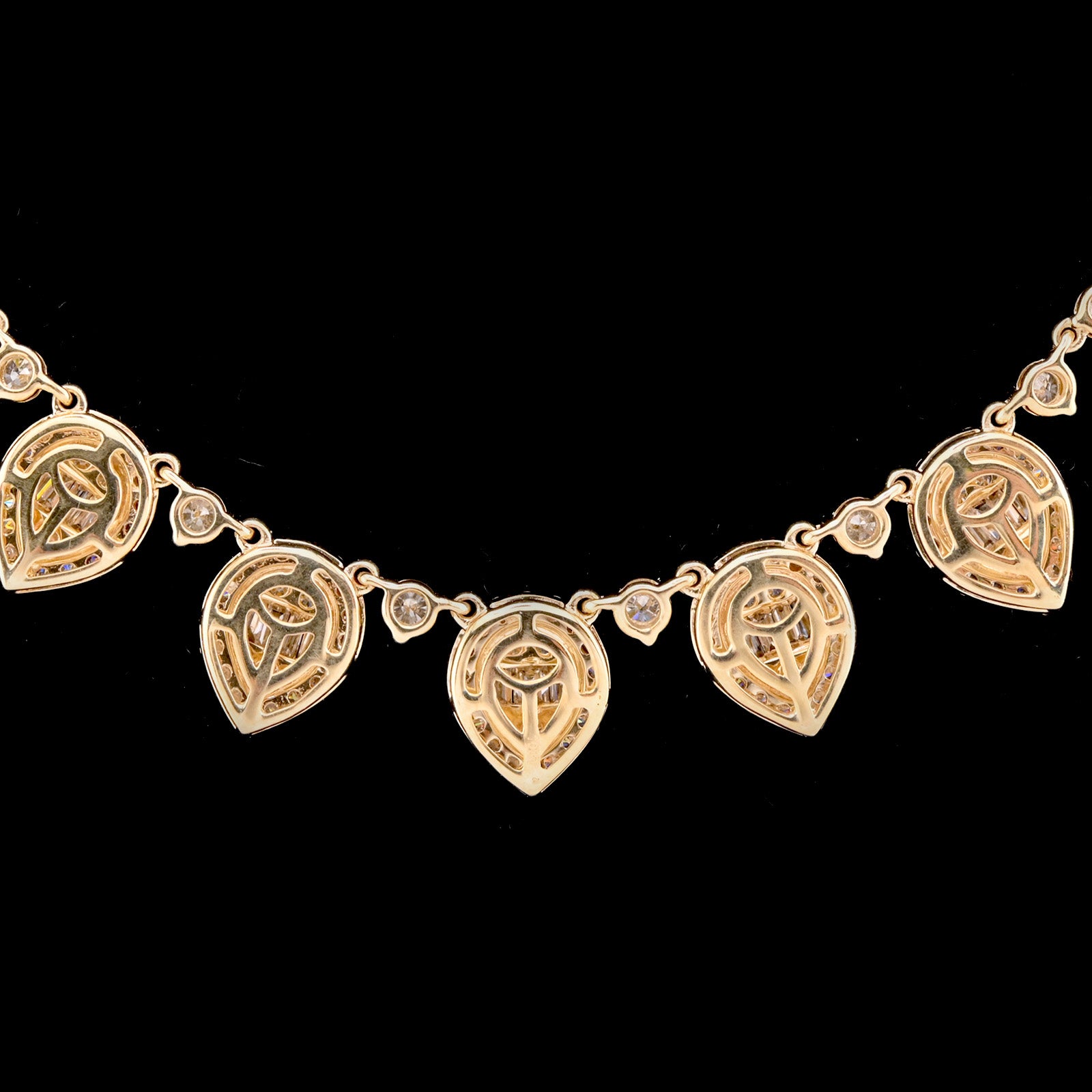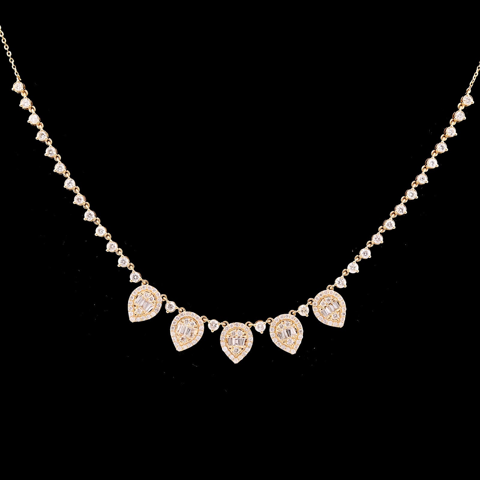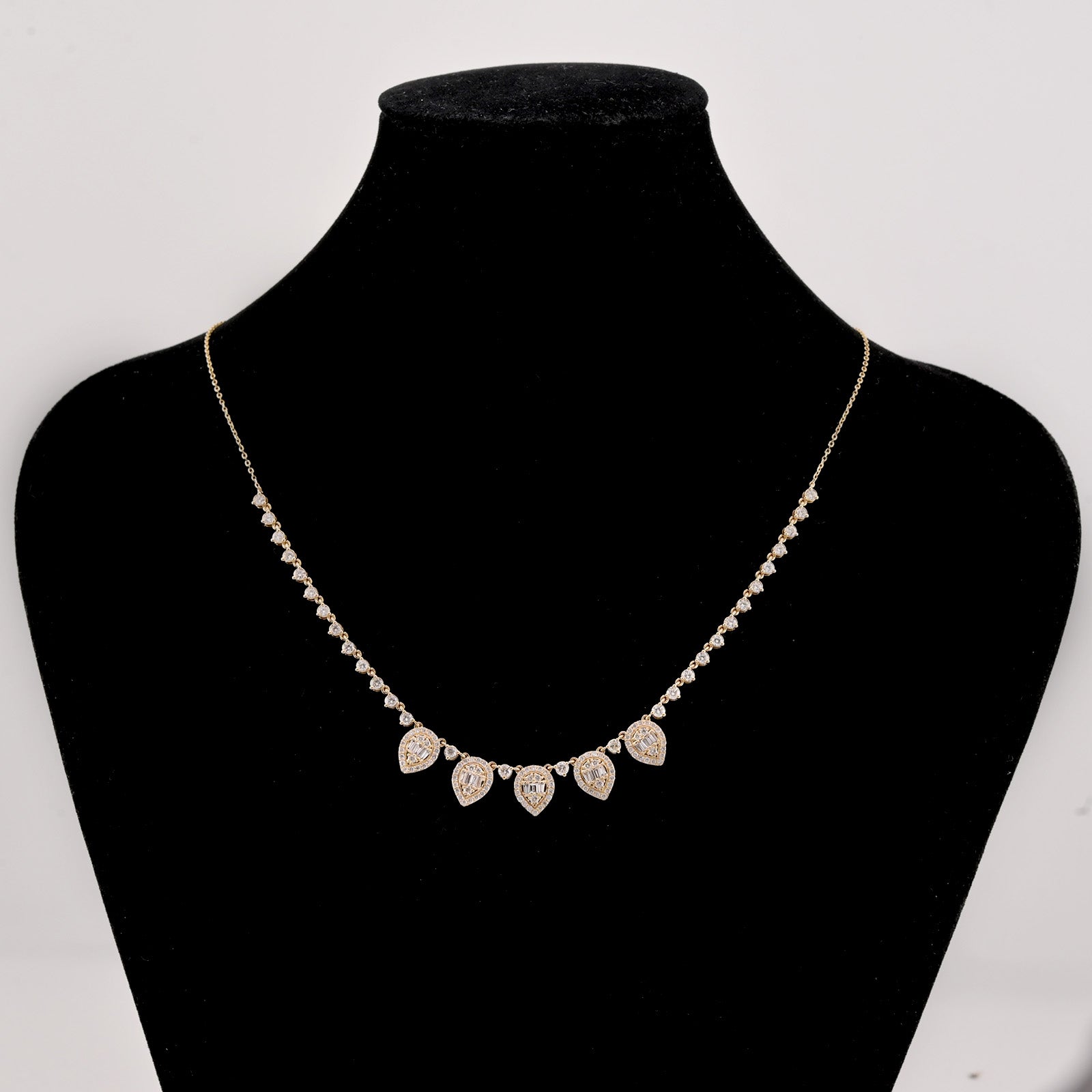 This exquisite 5.4-gram necklace features 10k yellow gold crafted into a refined chain, accentuated by a 2-carat diamond teardrop baguette charm. The diamond’s baguette cut enhances its brilliance, while the tennis-style chain offers a timeless, elegant appeal. Perfect for sophisticated layering or as a standout piece, this necklace combines expert craftsmanship with classic design for lasting luxury.