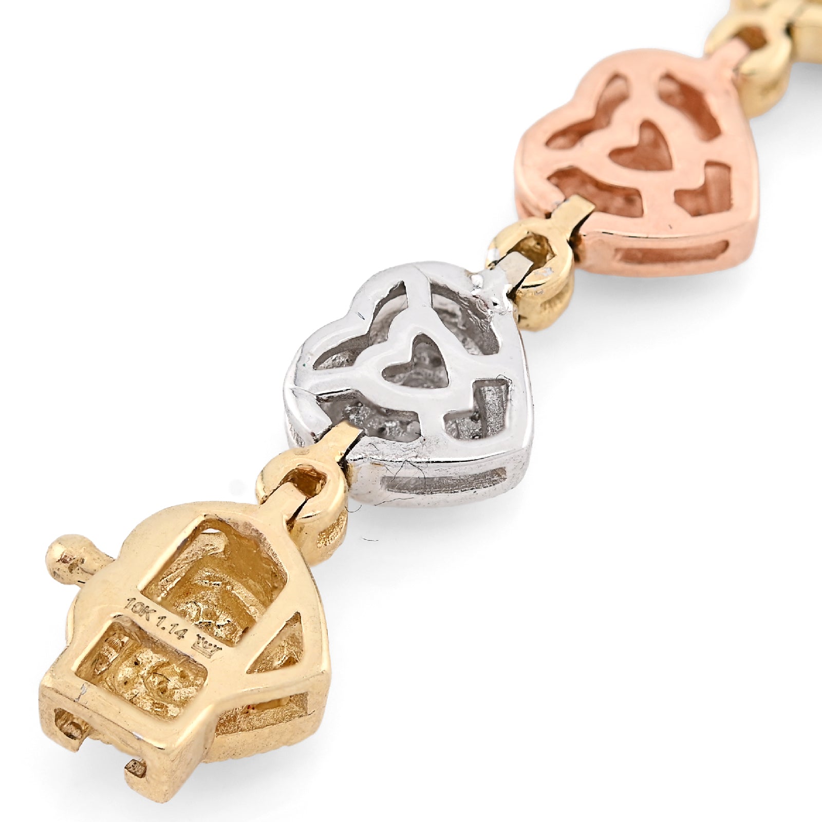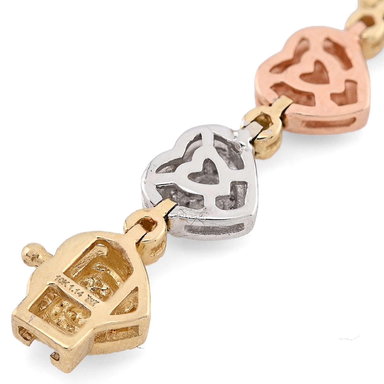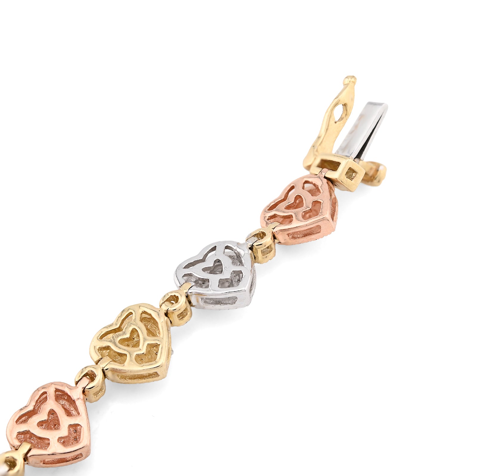 Celebrate individuality with this striking 10k three-tone gold bracelet, where contemporary design meets timeless craftsmanship. The interplay of white, yellow, and rose gold creates a dynamic visual narrative, while 1.15 carats of natural diamonds arranged in heart-shaped settings add romantic sophistication. At 6.5mm wide and weighing 13.6 grams, this bracelet commands attention without overwhelming the wrist. The three-tone composition offers remarkable versatility, complementing both warm and cool-toned jewelry in your collection. Perfect for the modern woman who values distinctive style, this piece transitions seamlessly from professional settings to special occasions, making it a cherished investment in personal expression.