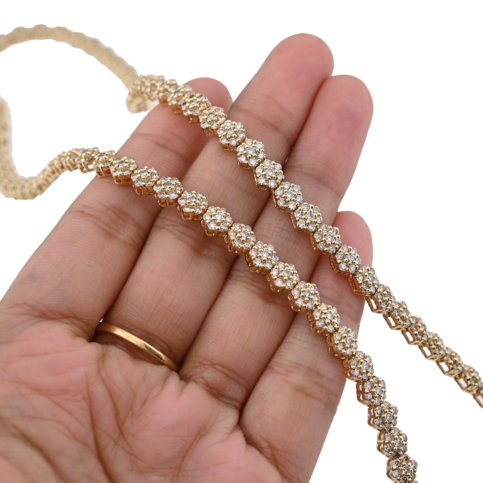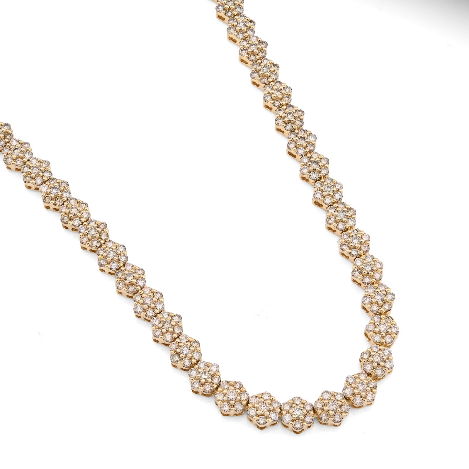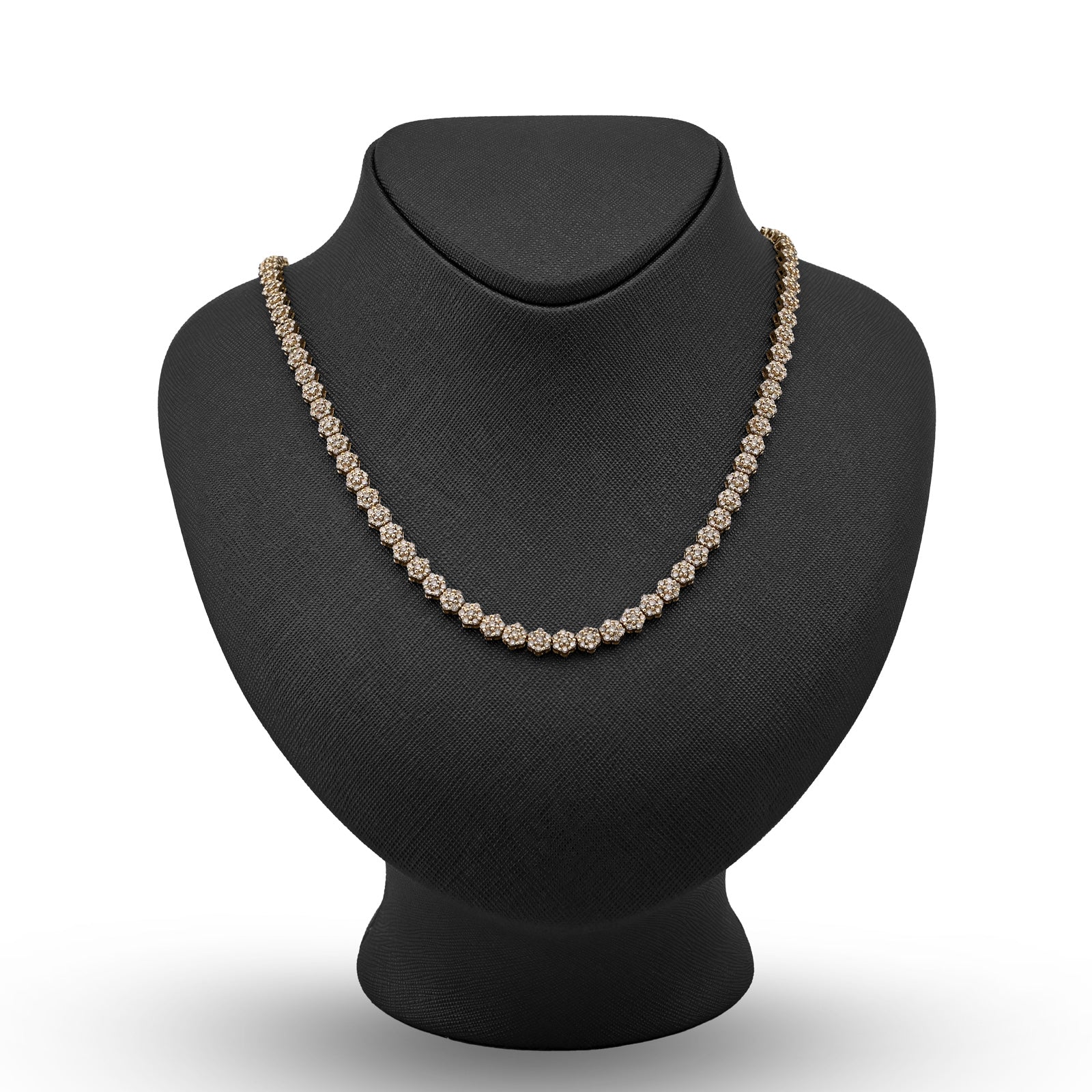 Bloom with unparalleled elegance in this exquisite 10k yellow gold tennis chain, where botanical artistry meets refined luxury. The delicate 6mm flower settings showcase an extraordinary 16.89 carats of natural diamonds, each petal meticulously crafted to capture and reflect light with mesmerizing brilliance. The 22-inch length provides ideal positioning while the substantial 41.6-gram weight affirms authentic craftsmanship and quality construction. The warm, luminous finish of 10k yellow gold creates a sophisticated foundation that enhances the diamond settings beautifully, developing rich patina with time. The flower motif transforms this piece beyond traditional tennis chain design into a wearable garden of light—each setting a miniature masterpiece of precision and artistry. This necklace transcends occasion, equally at home at intimate gatherings or grand celebrations. A transformative investment piece for those who appreciate jewelry that celebrates both natural beauty and exceptional craftsmanship.