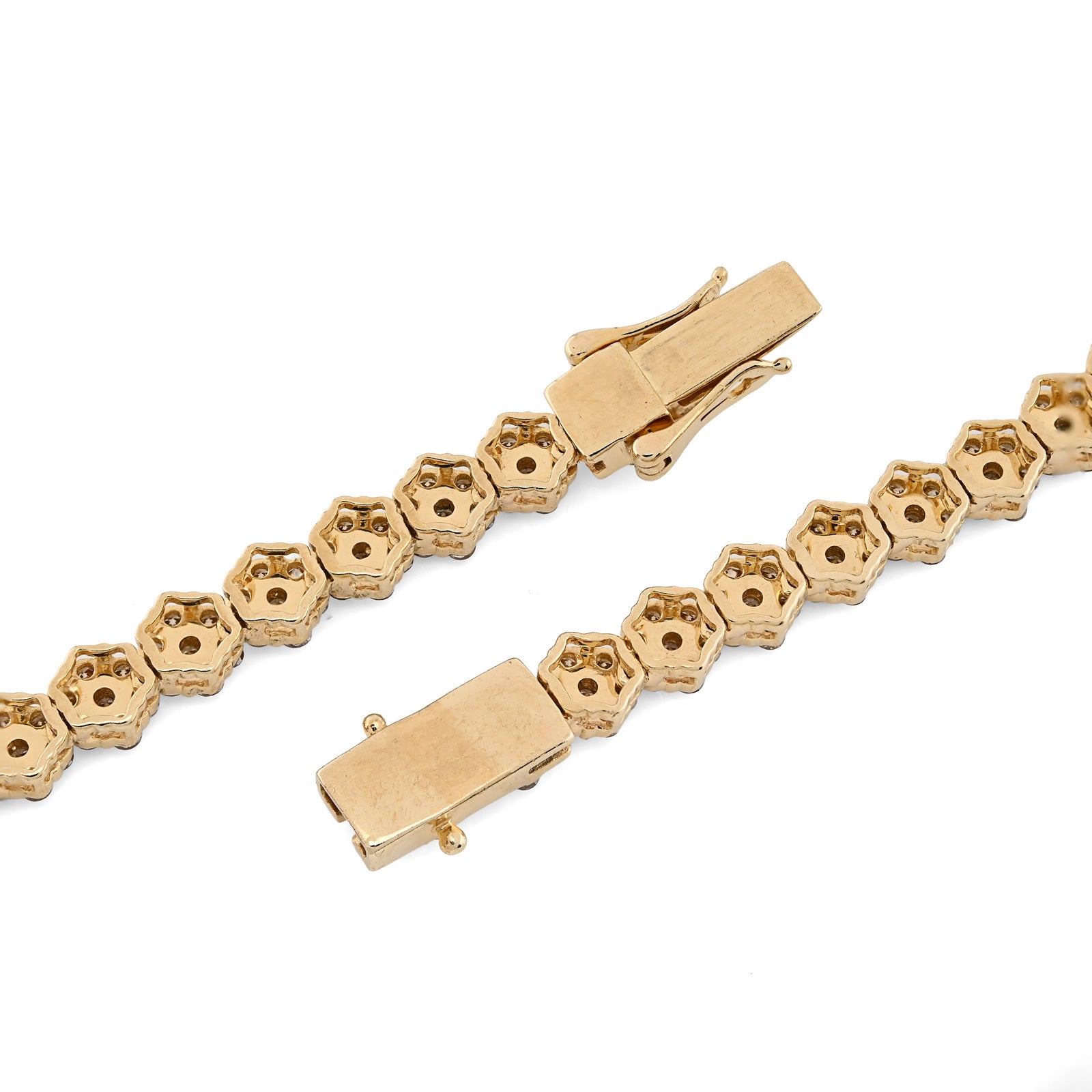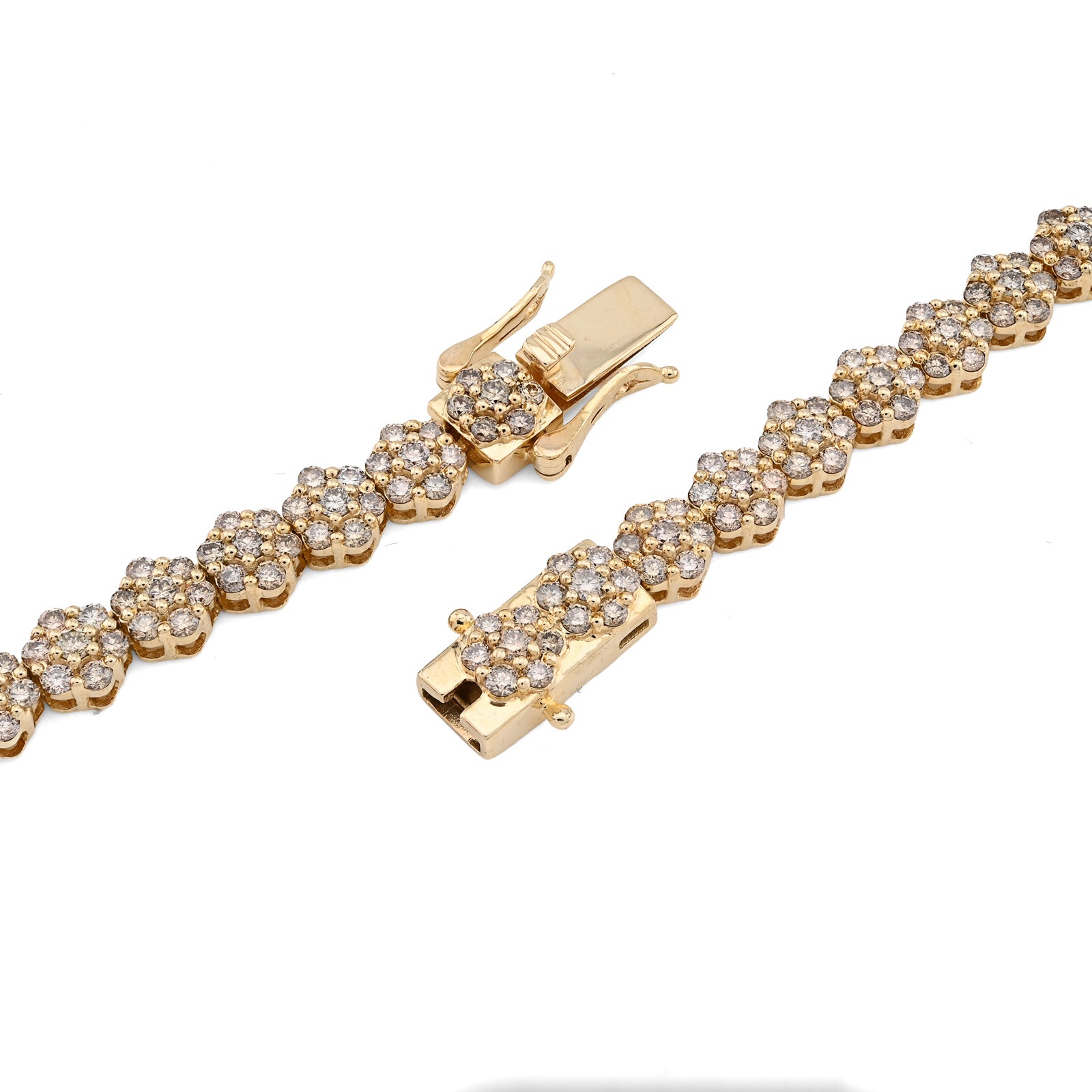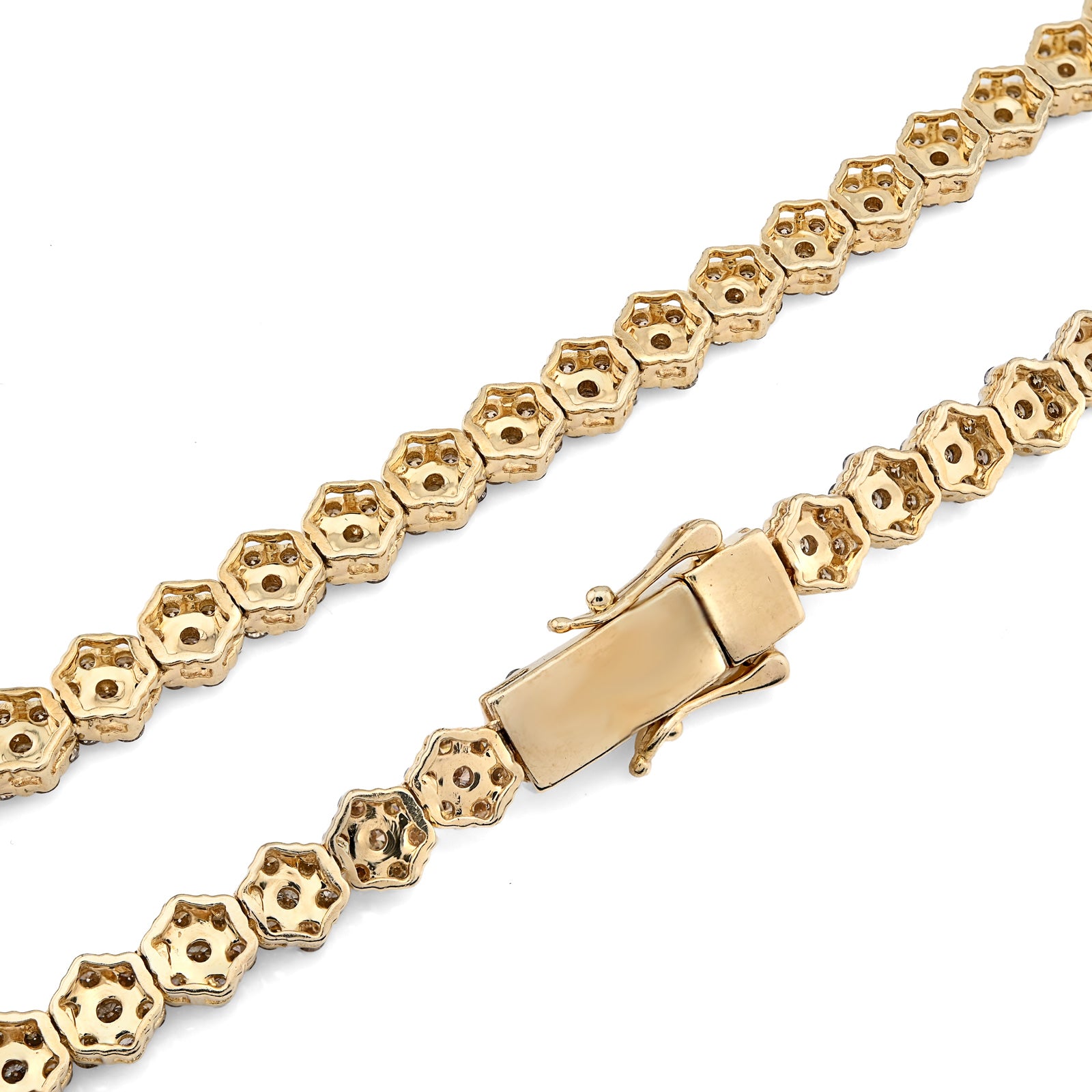 Bloom with unparalleled elegance in this exquisite 10k yellow gold tennis chain, where botanical artistry meets refined luxury. The delicate 6mm flower settings showcase an extraordinary 16.89 carats of natural diamonds, each petal meticulously crafted to capture and reflect light with mesmerizing brilliance. The 22-inch length provides ideal positioning while the substantial 41.6-gram weight affirms authentic craftsmanship and quality construction. The warm, luminous finish of 10k yellow gold creates a sophisticated foundation that enhances the diamond settings beautifully, developing rich patina with time. The flower motif transforms this piece beyond traditional tennis chain design into a wearable garden of light—each setting a miniature masterpiece of precision and artistry. This necklace transcends occasion, equally at home at intimate gatherings or grand celebrations. A transformative investment piece for those who appreciate jewelry that celebrates both natural beauty and exceptional craftsmanship.