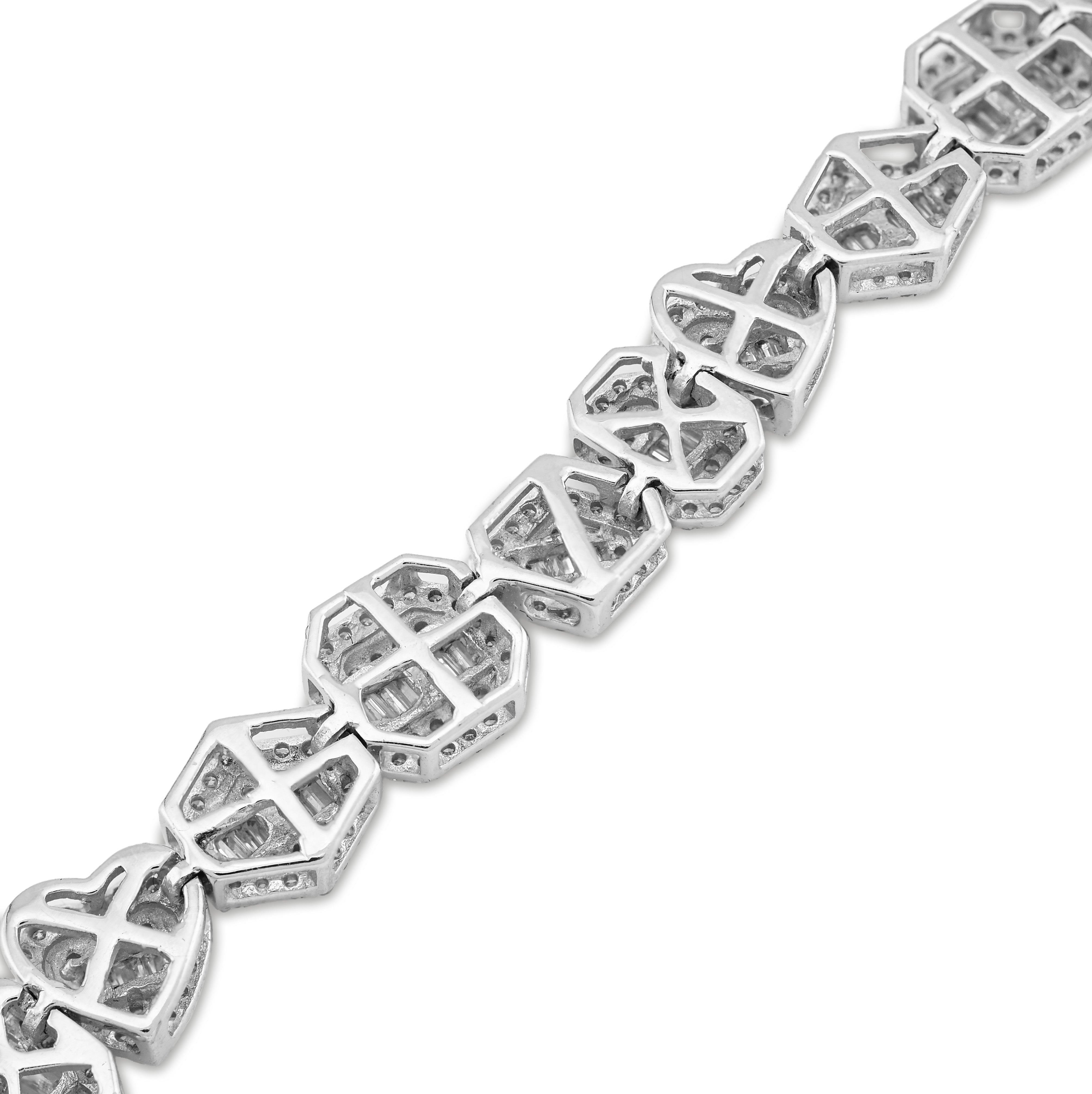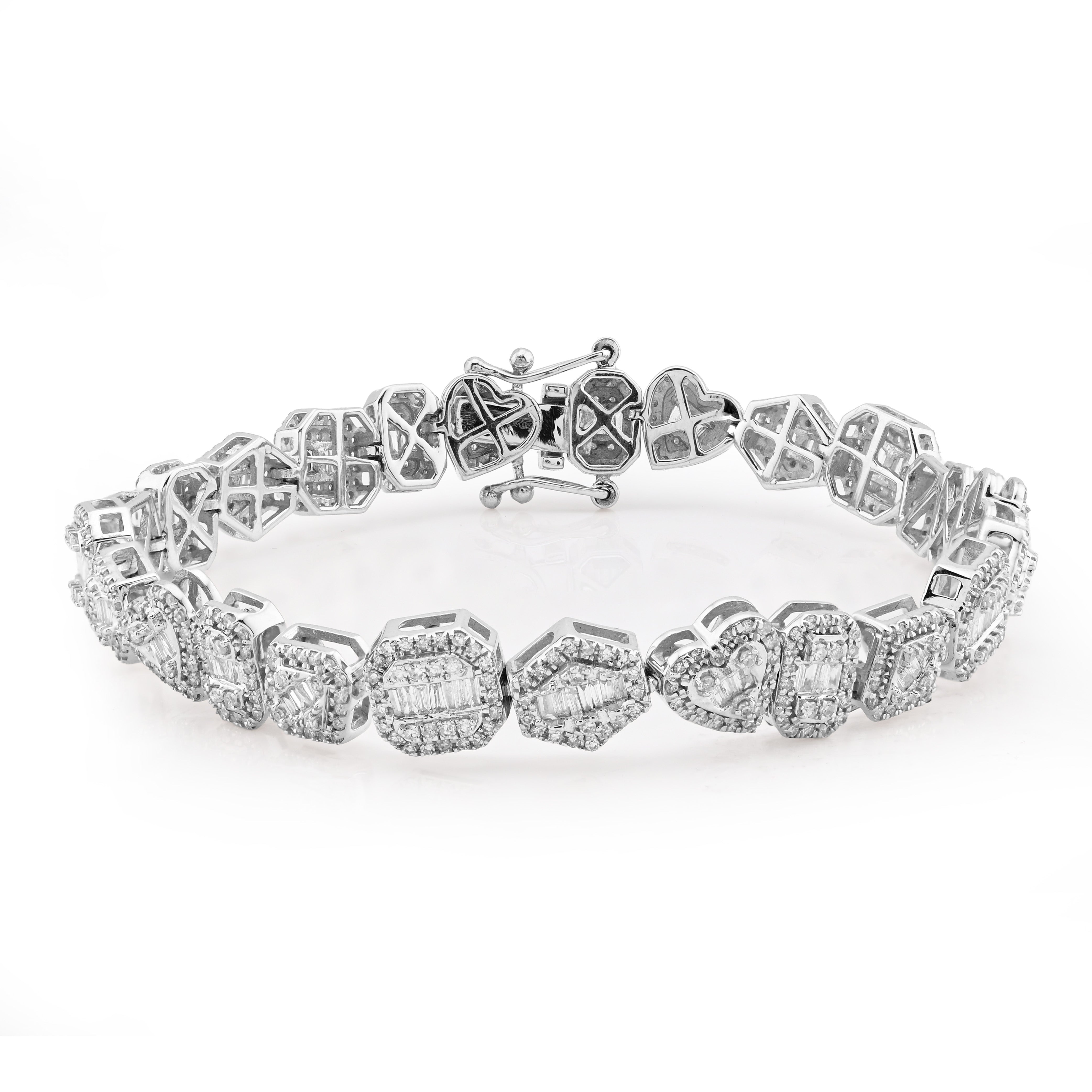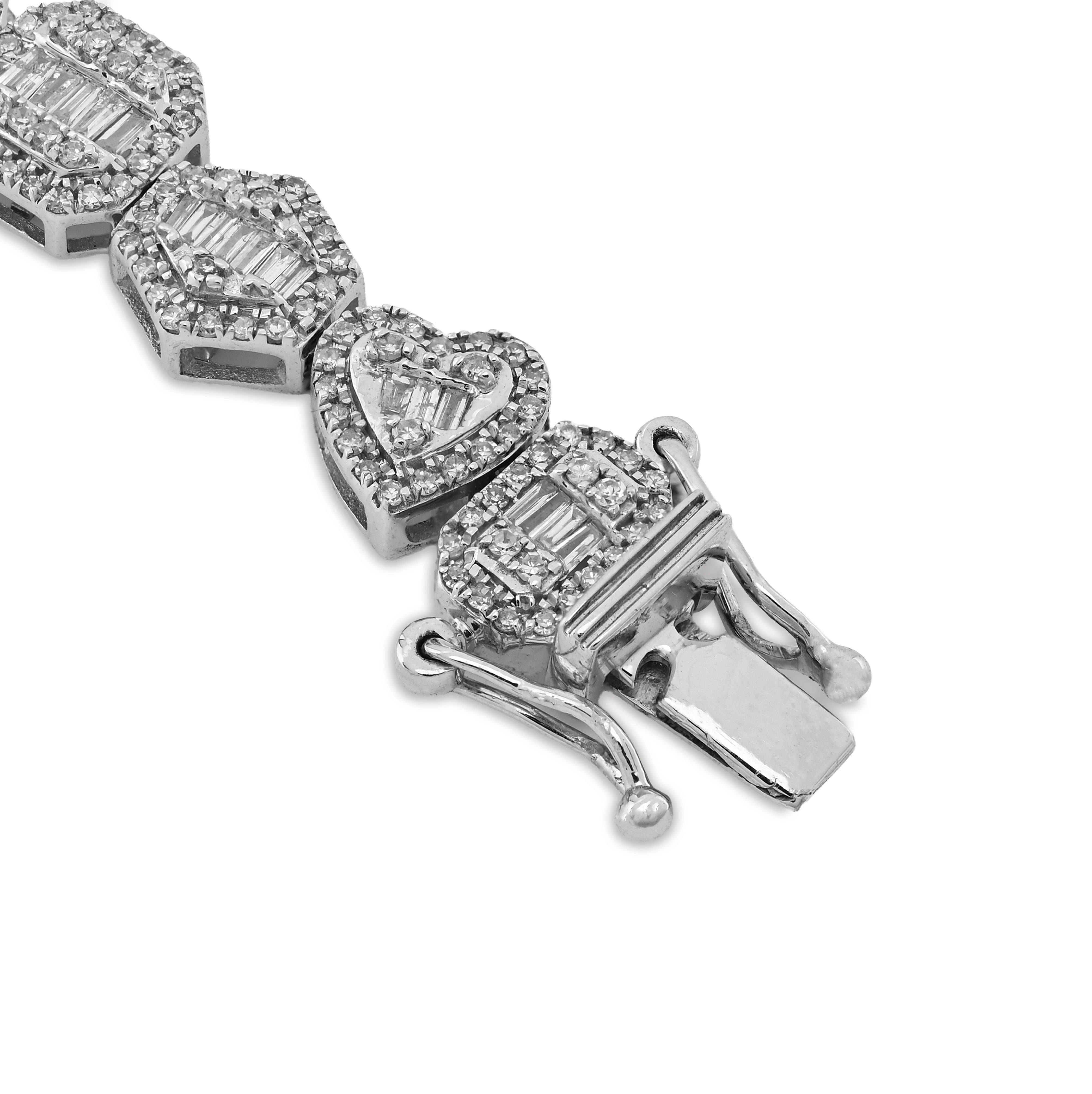 Indulge in the exquisite allure of our 7.5MM 10k White Gold Multi-Shaped Women's Bracelet, a stunning testament to fine craftsmanship and timeless elegance. Weighing 15.4 grams, this magnificent piece gracefully adorns the wrist, showcasing a brilliant array of natural diamonds totaling 2.3 carats, each carefully selected for their captivating white hue and clarity ranging from SI to VS. The intricate design harmonizes with the luxurious 10k white gold, creating a radiant interplay of light that enhances the beauty of every facet. Elevate your jewelry collection with this exceptional bracelet, a perfect reflection of sophistication and refined taste.