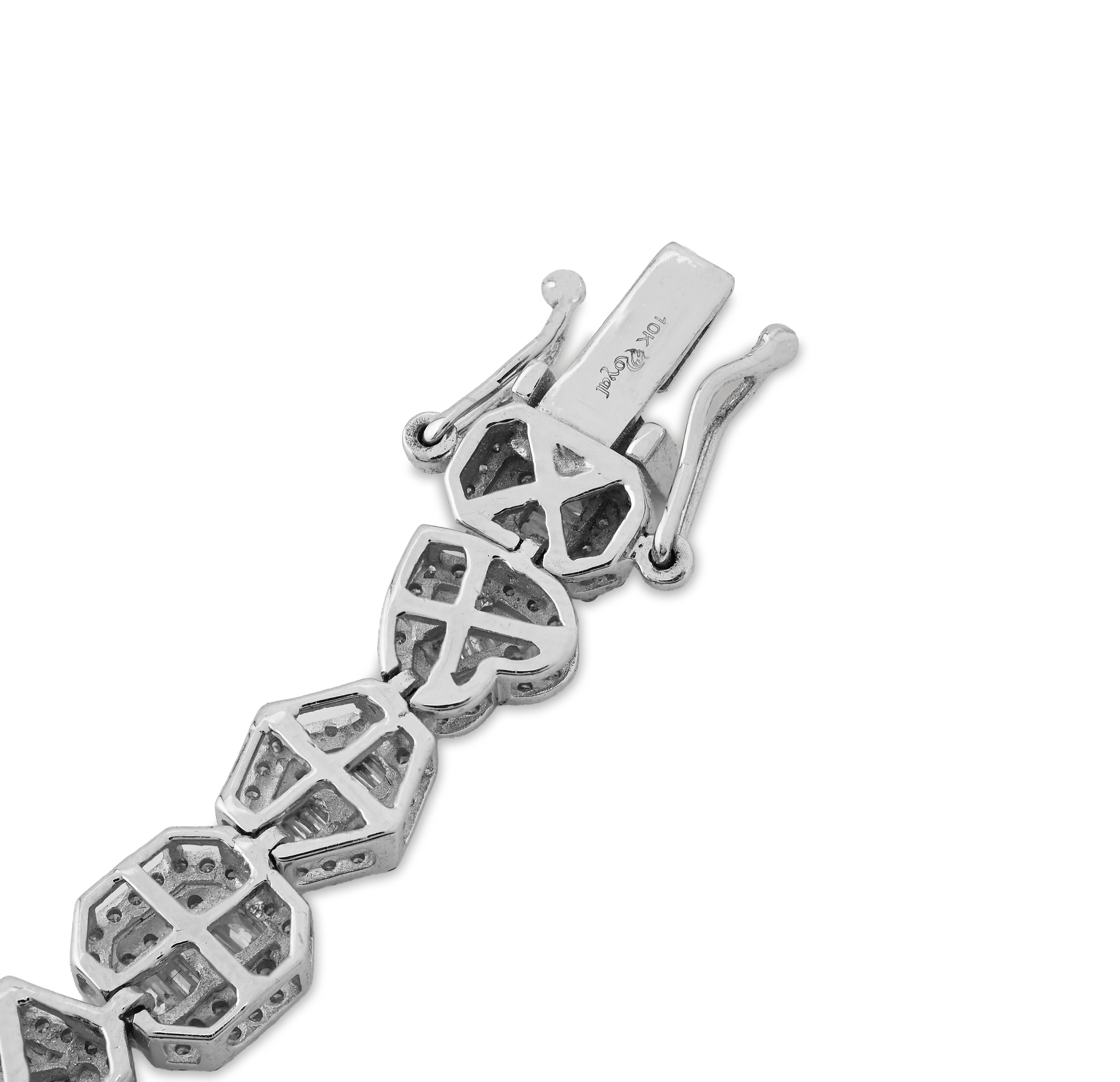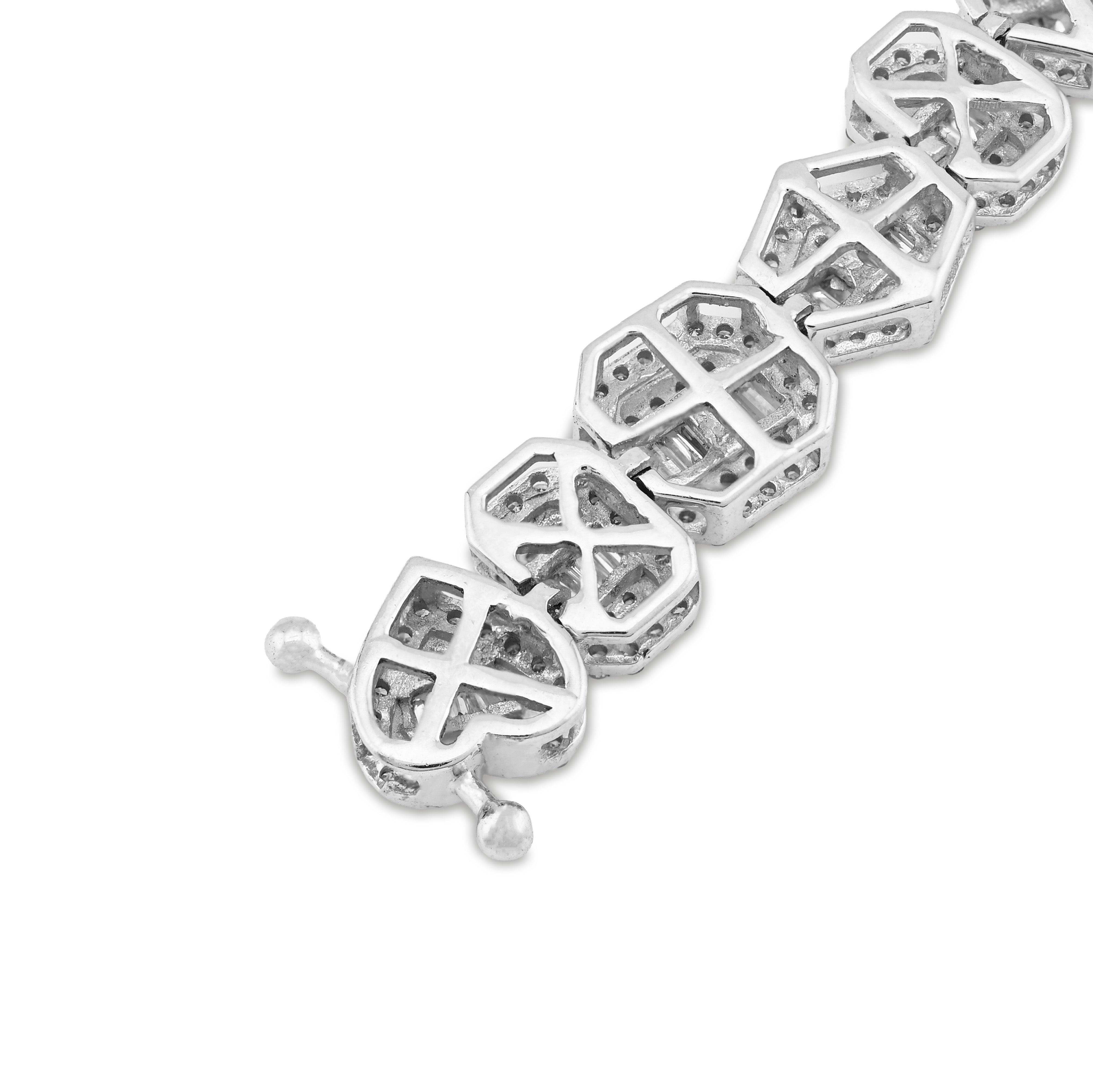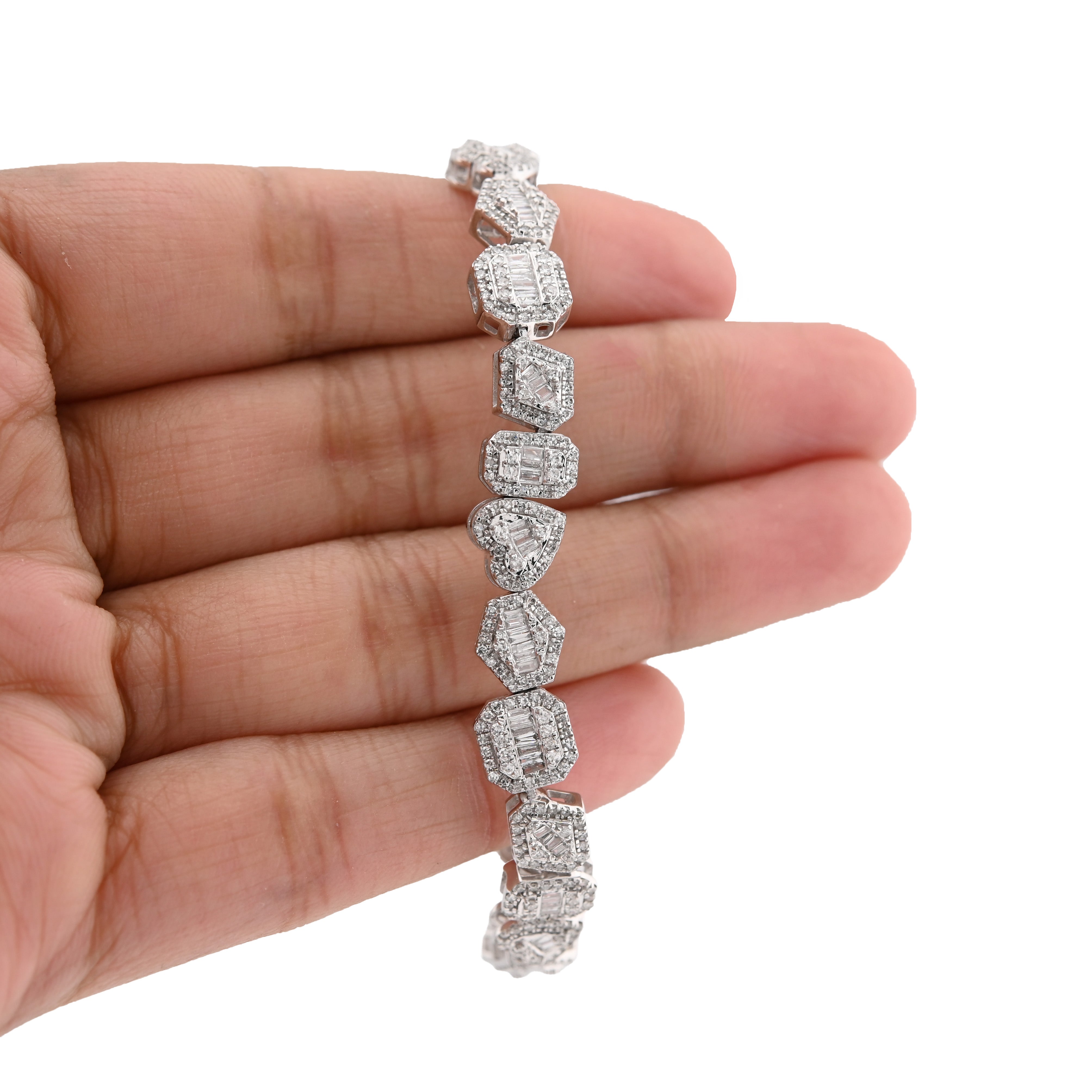 Indulge in the exquisite allure of our 7.5MM 10k White Gold Multi-Shaped Women's Bracelet, a stunning testament to fine craftsmanship and timeless elegance. Weighing 15.4 grams, this magnificent piece gracefully adorns the wrist, showcasing a brilliant array of natural diamonds totaling 2.3 carats, each carefully selected for their captivating white hue and clarity ranging from SI to VS. The intricate design harmonizes with the luxurious 10k white gold, creating a radiant interplay of light that enhances the beauty of every facet. Elevate your jewelry collection with this exceptional bracelet, a perfect reflection of sophistication and refined taste.