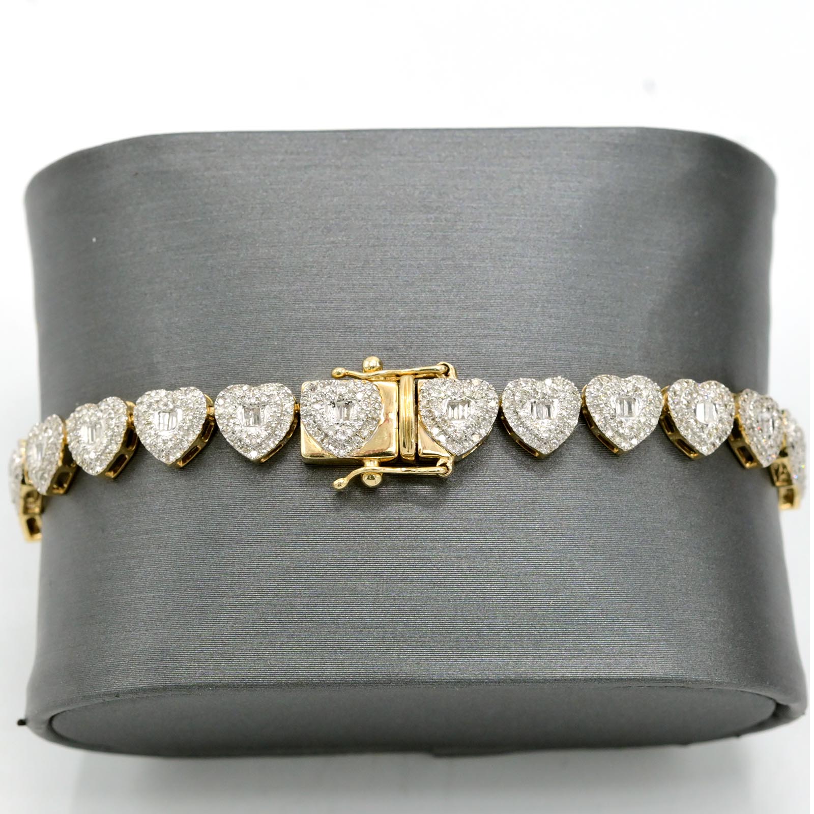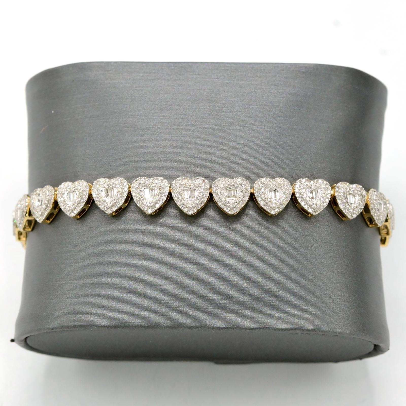 Express affection with this charming 10k yellow gold heart bracelet, a delicate yet meaningful piece for the romantic at heart. Measuring 7mm wide and 7 inches long, this graceful bracelet weighs 10.7 grams and features 2.3 carats of natural baguette diamonds that create linear elegance throughout the design. The geometric precision of baguette cuts combined with the warm yellow gold creates a sophisticated composition that captures light with understated brilliance. Perfect for those seeking a refined bracelet that celebrates love through timeless symbolism and premium diamond craftsmanship.