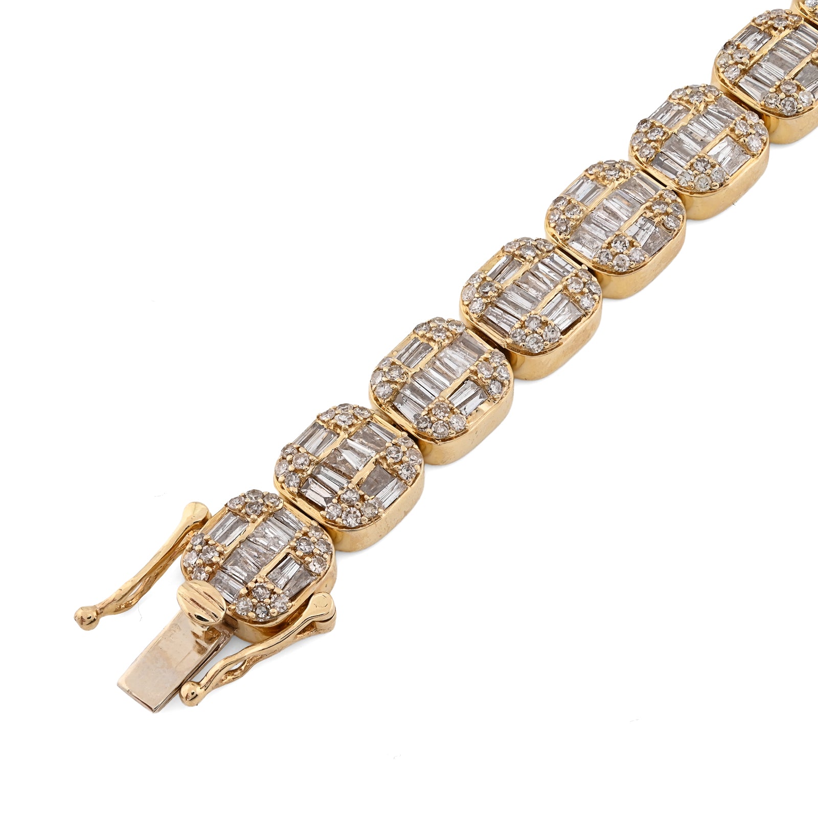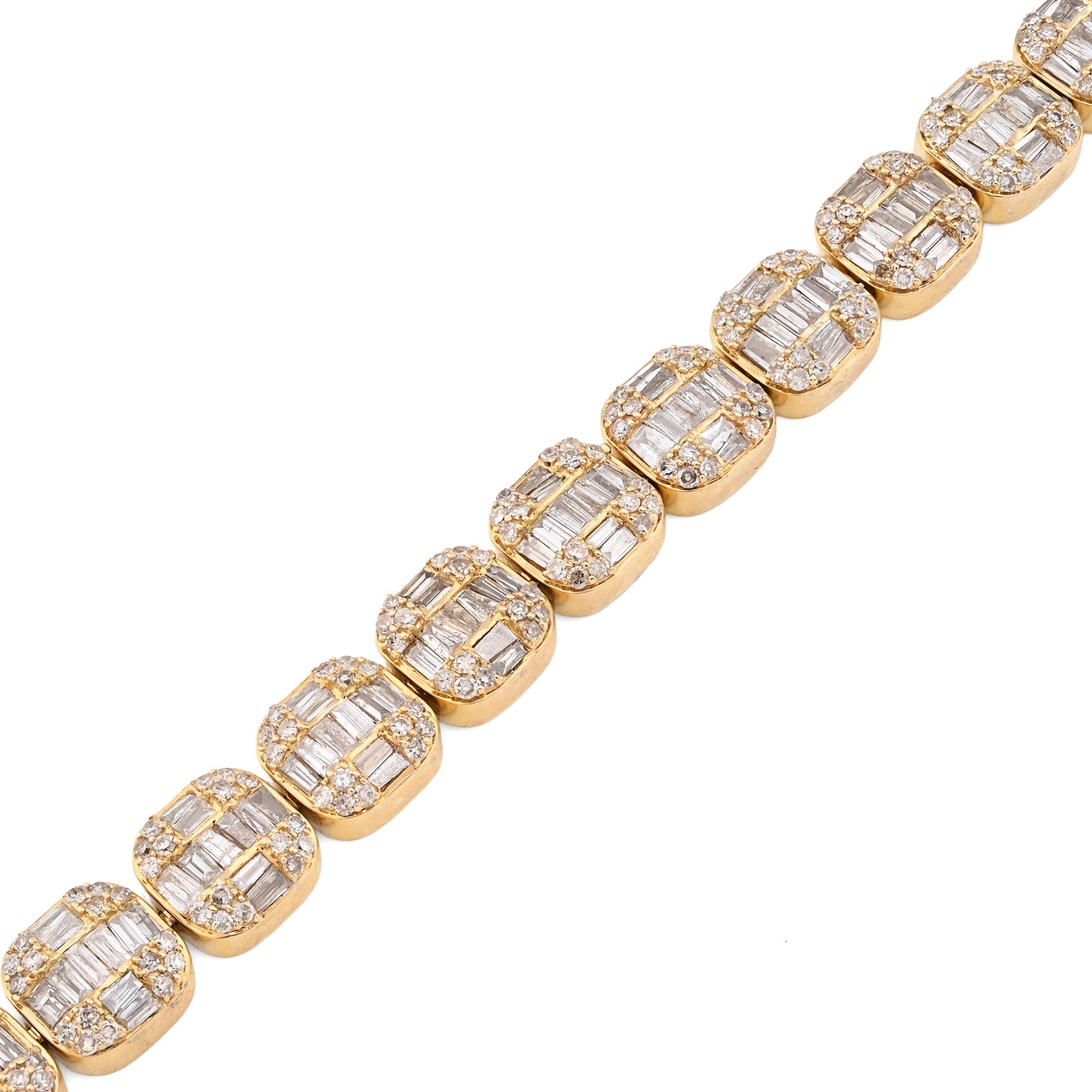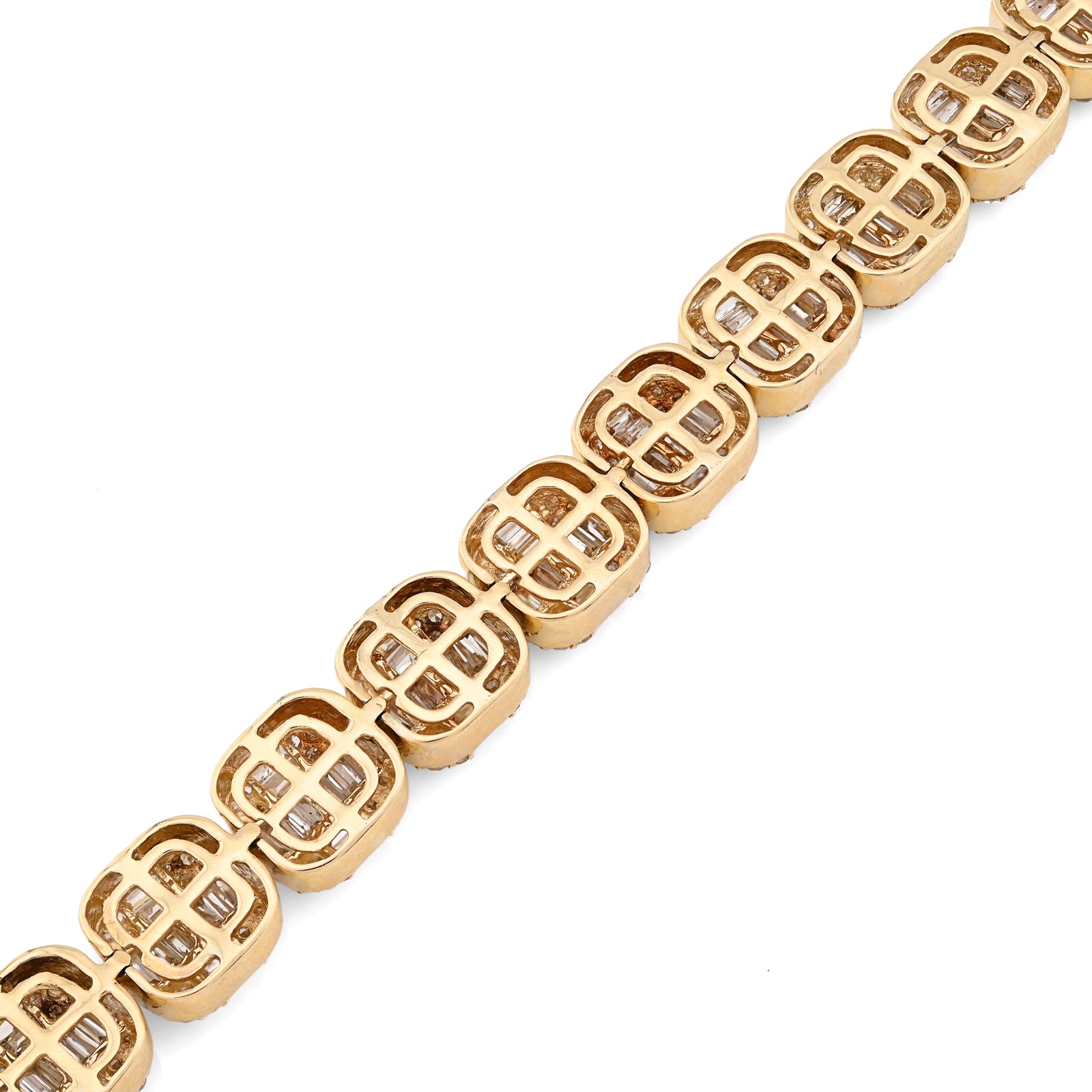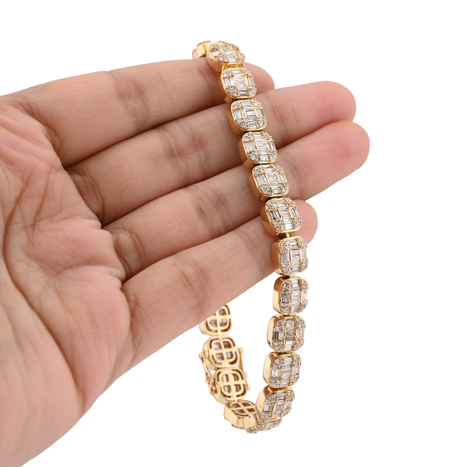 Indulge in uncompromising luxury with this exceptional 8.25MM square tennis bracelet in 10k gold. Showcasing an impressive 7.82 carats of natural diamonds in both round and baguette cuts, the stones are meticulously arranged to create a harmonious interplay of light and brilliance. The substantial 19.9-gram weight reflects superior craftsmanship and lasting durability, while the square link design offers architectural elegance with contemporary flair. This is a statement piece for the discerning collector—one that commands admiration and celebrates a commitment to quality. Whether marking a milestone or simply honoring your refined taste, this bracelet represents the pinnacle of diamond jewelry artistry.