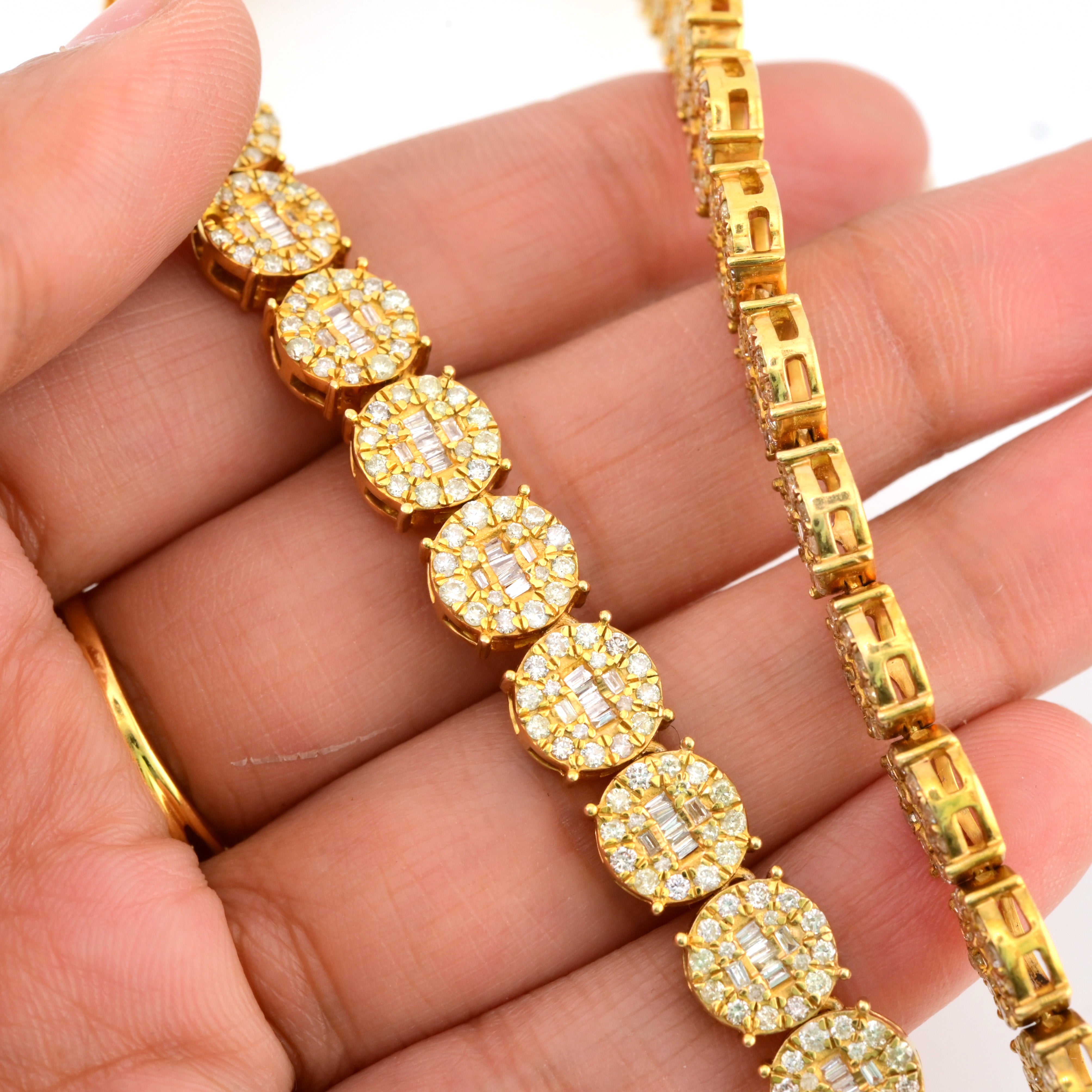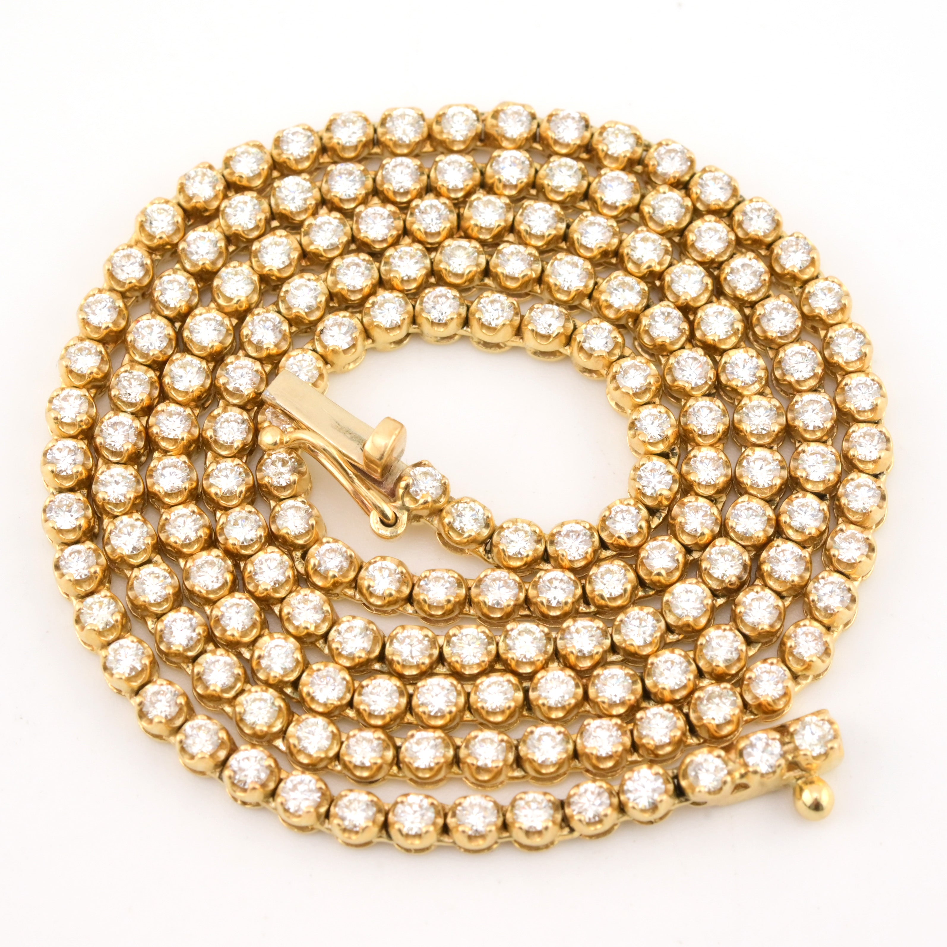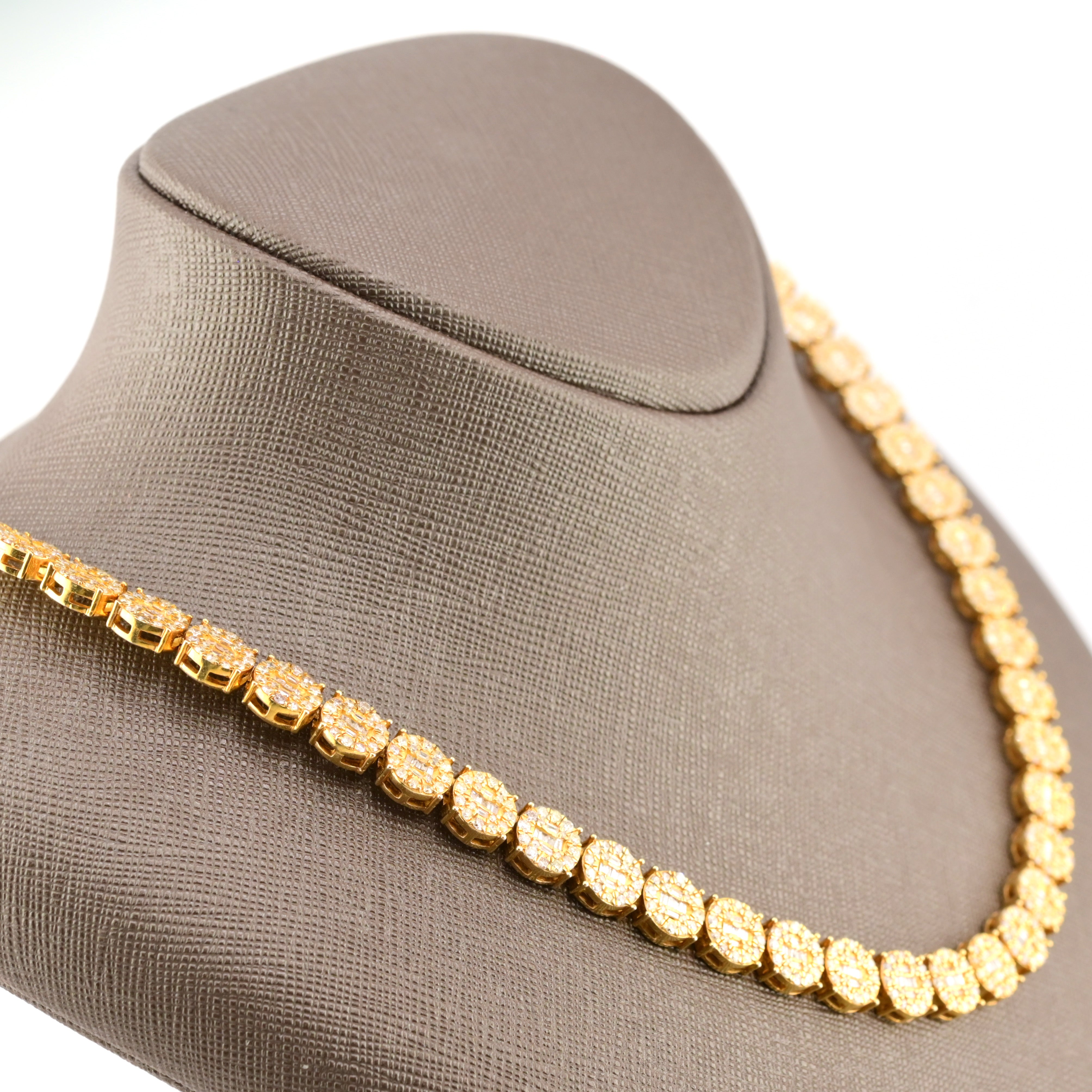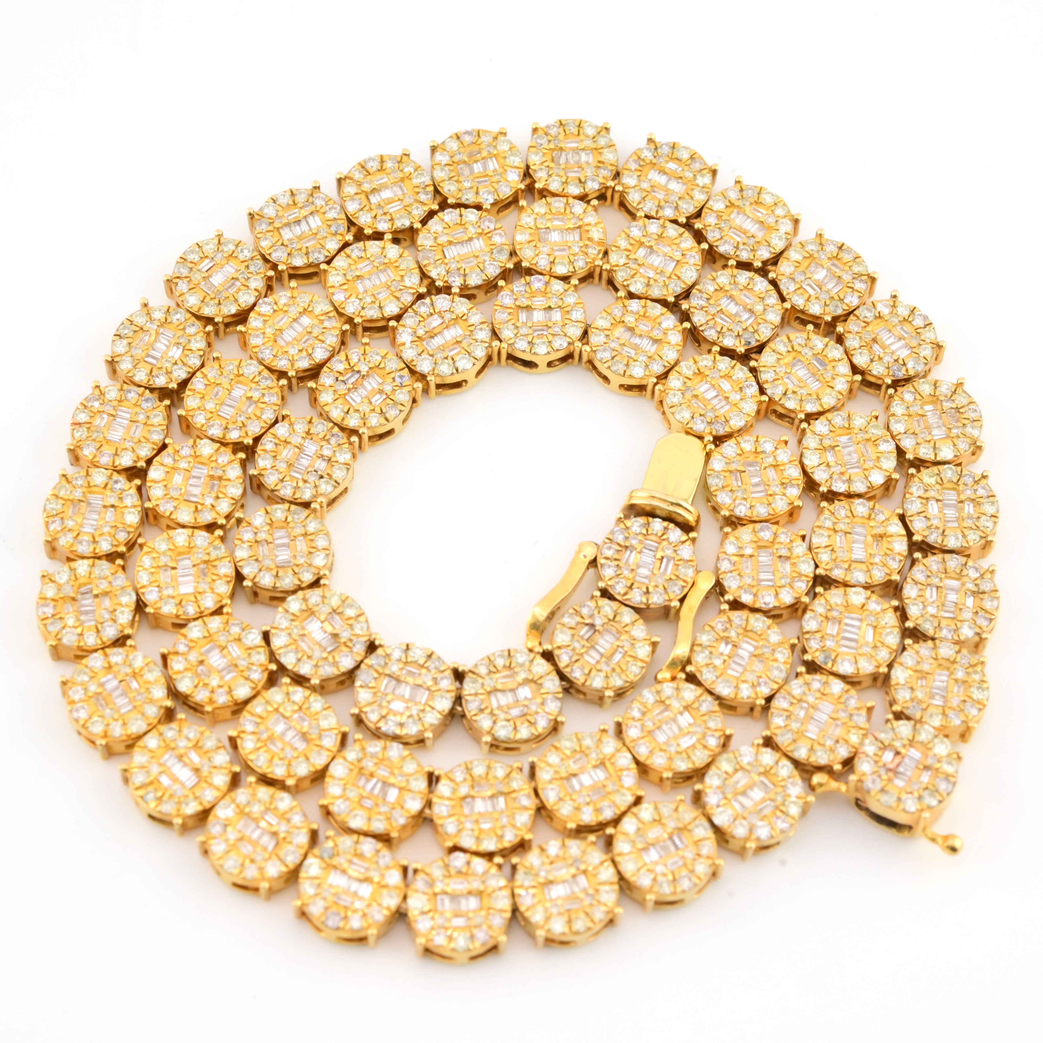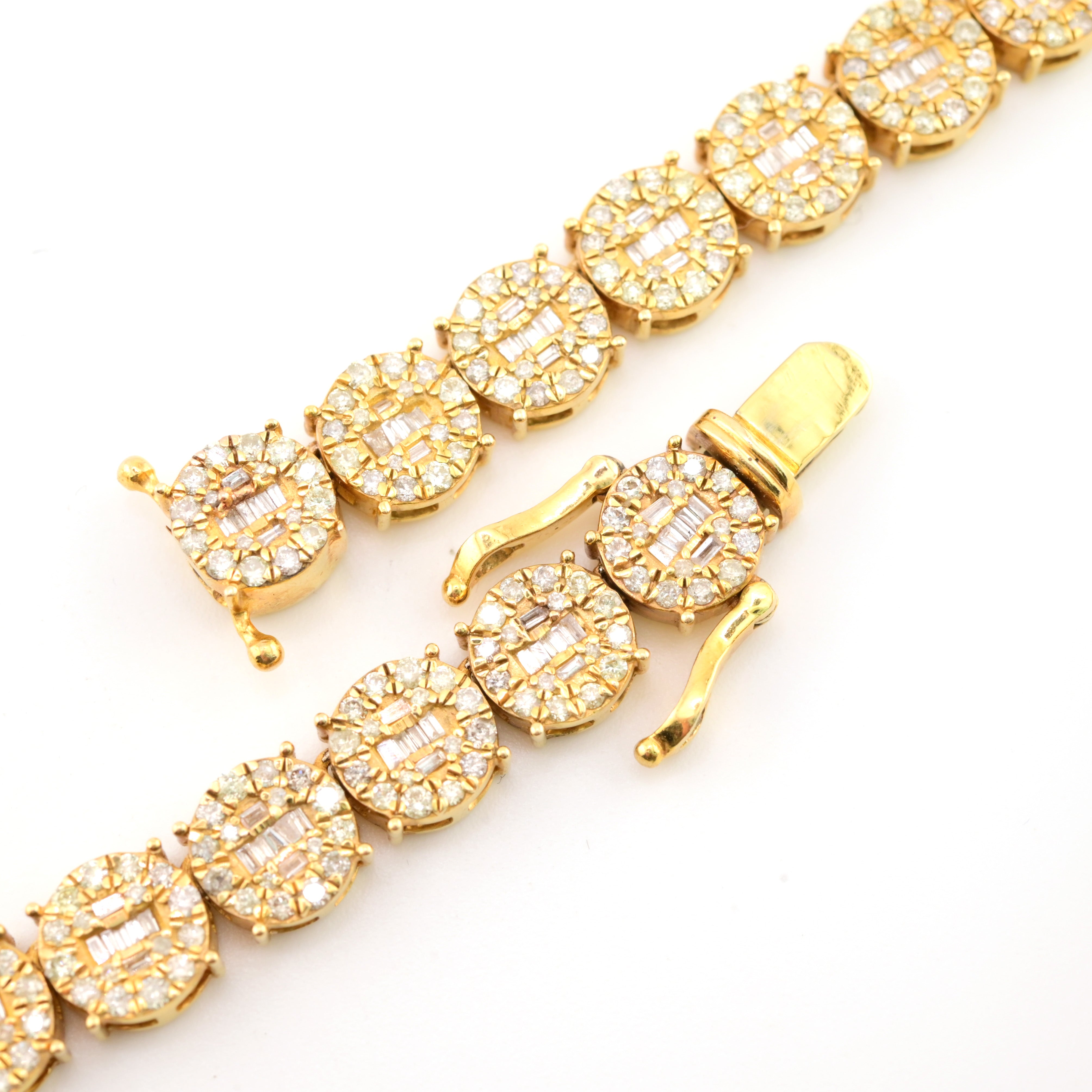 Experience dynamic elegance with this exceptional 10k yellow gold tennis chain, combining 18 carats of round and baguette diamonds in a versatile 8mm design. At 20 inches and weighing 58.3 grams, this necklace strikes an impressive balance between substantial presence and refined aesthetics. The mixed diamond cuts create captivating visual interest—round stones deliver classic brilliance while baguettes contribute geometric sophistication. The warm yellow gold amplifies the diamonds' luminosity, creating a harmonious composition of light and luxury. Ideal for those who appreciate nuanced design and exceptional craftsmanship, this chain seamlessly transitions from boardroom to evening events. A distinguished investment piece that celebrates both contemporary artistry and timeless elegance.