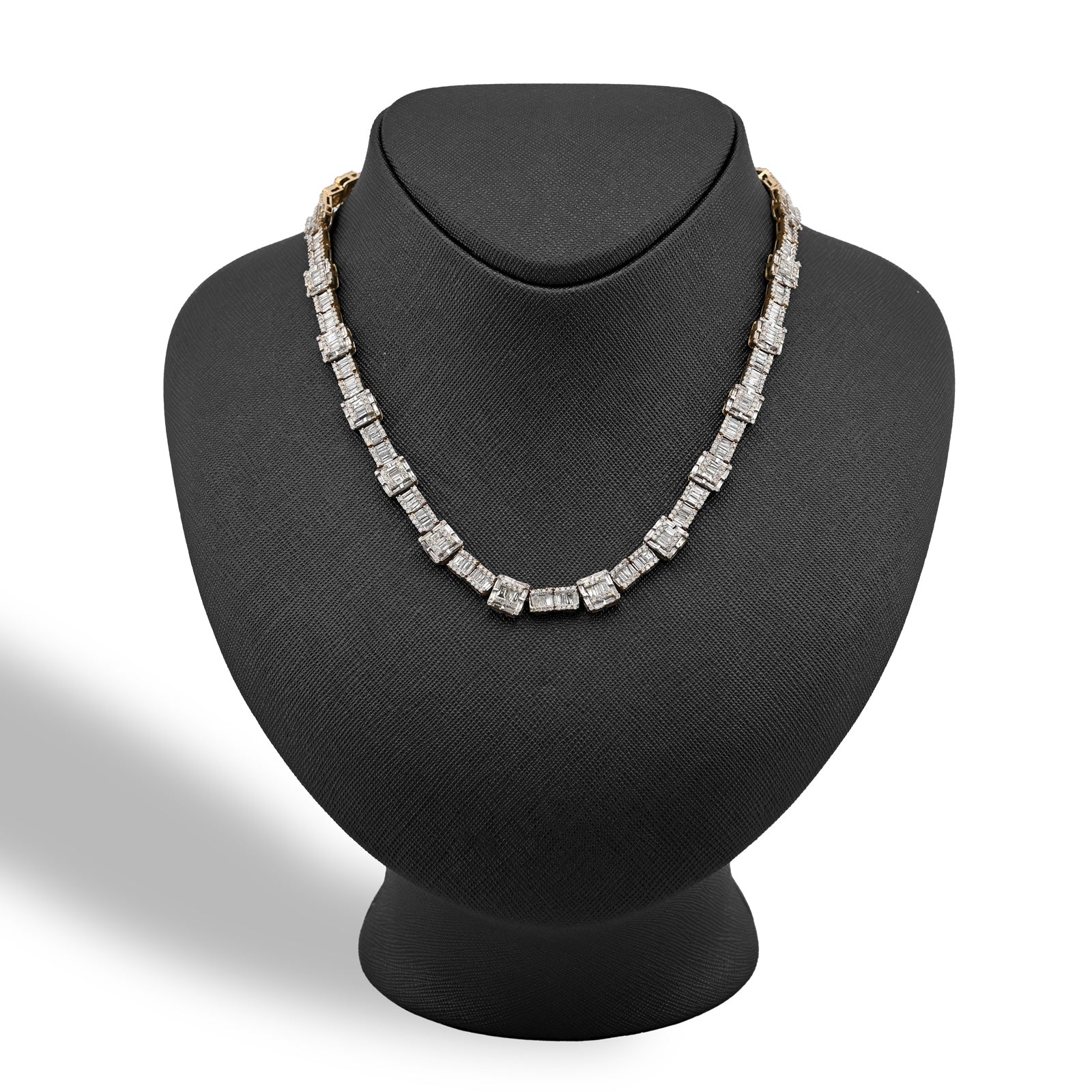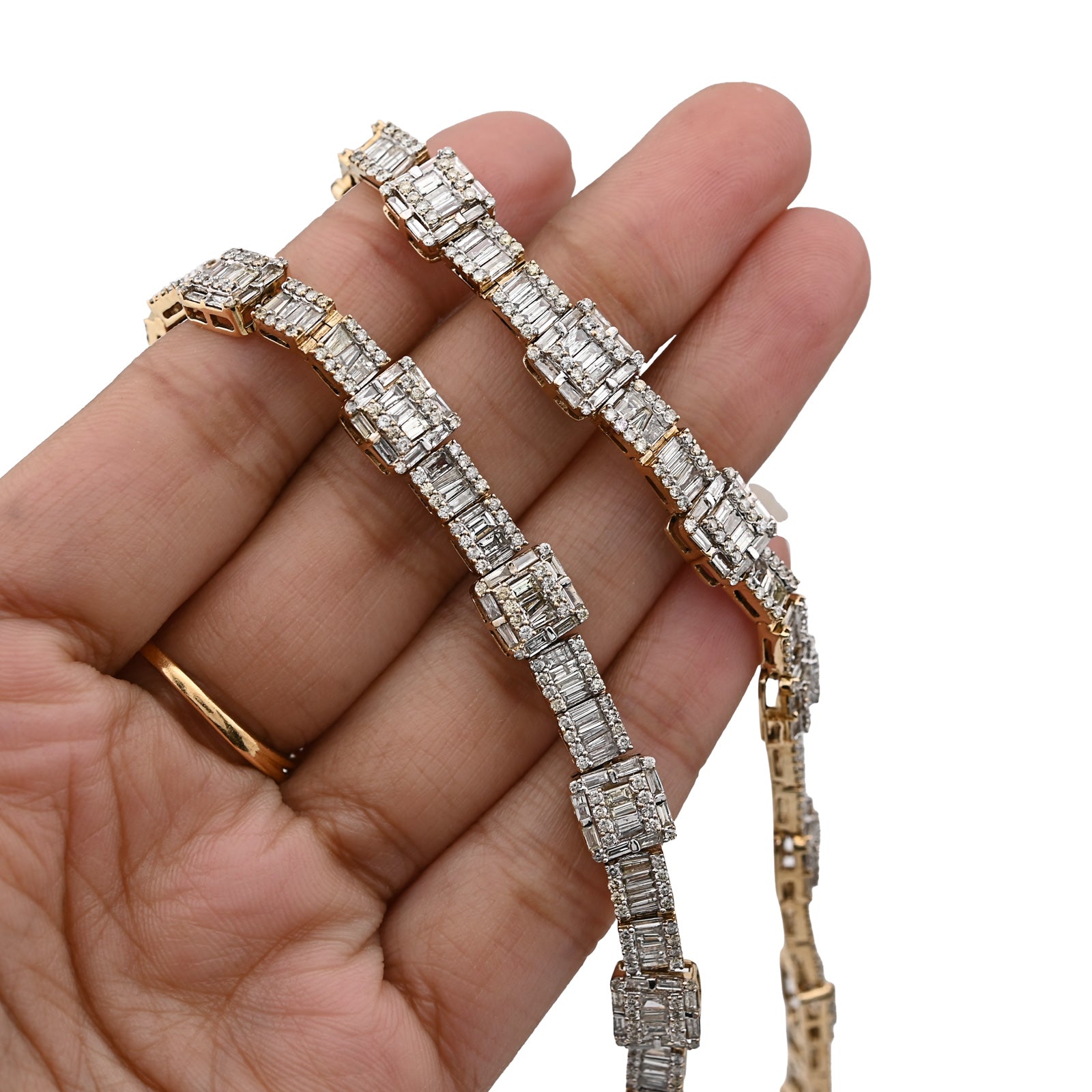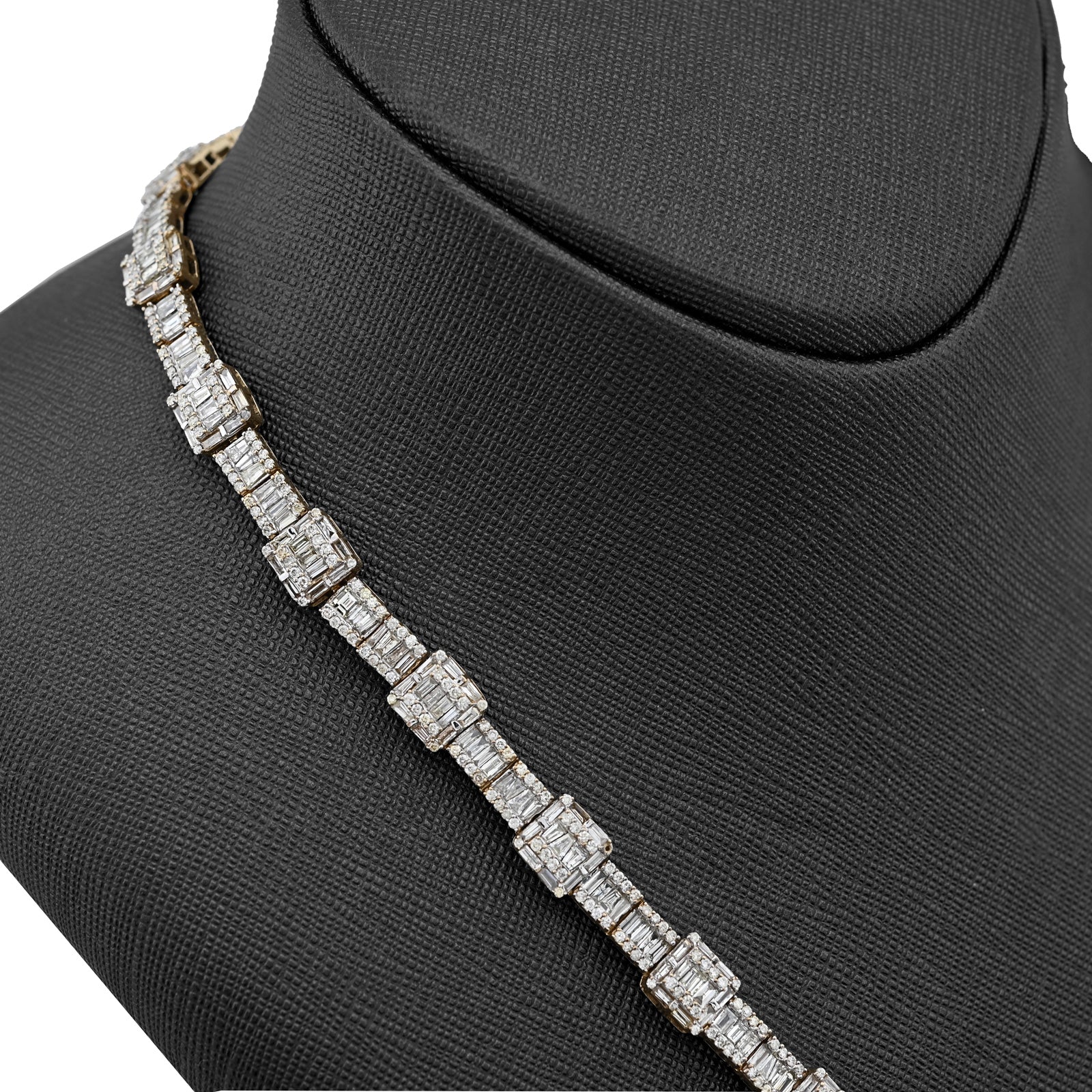 Illuminate your presence with this resplendent 10k yellow gold tennis chain, an uncompromising celebration of diamond luxury. The impressive 8mm halo clusters feature a harmonious blend of baguette and round diamonds totaling 22 carats, creating an extraordinary symphony of light and brilliance. Each cluster is meticulously designed with halo settings that amplify sparkle and create dimensional depth, transforming the necklace into a continuous cascade of radiance. The substantial 50-gram weight affirms exceptional craftsmanship and quality materials, delivering commanding presence that speaks to authenticity and refinement. The warm, luminous finish of 10k yellow gold provides an elegant foundation that complements the diamond settings while developing rich character with time. The mixed diamond shapes create sophisticated visual complexity, appealing to discerning collectors who appreciate intricate design details. This necklace transcends conventional jewelry, serving as a definitive statement piece for those who embrace uncompromising luxury and timeless elegance.