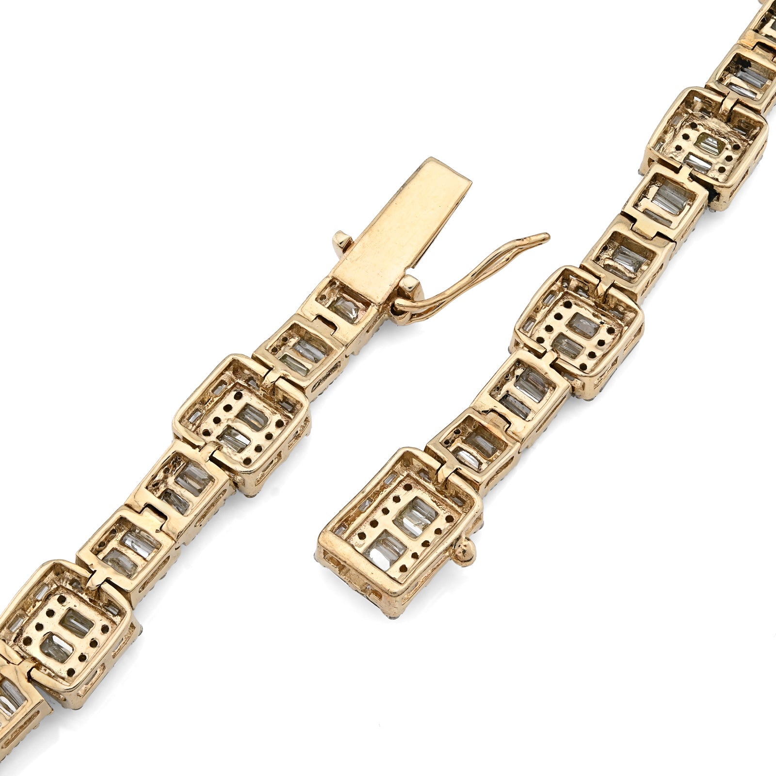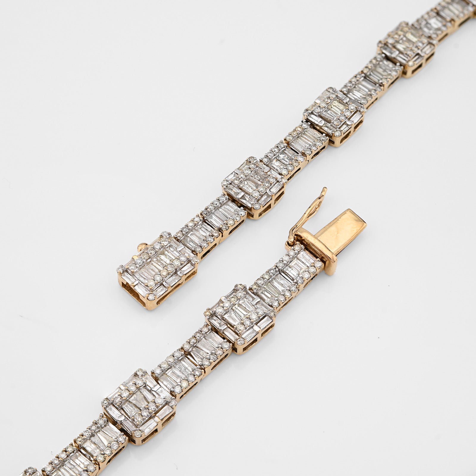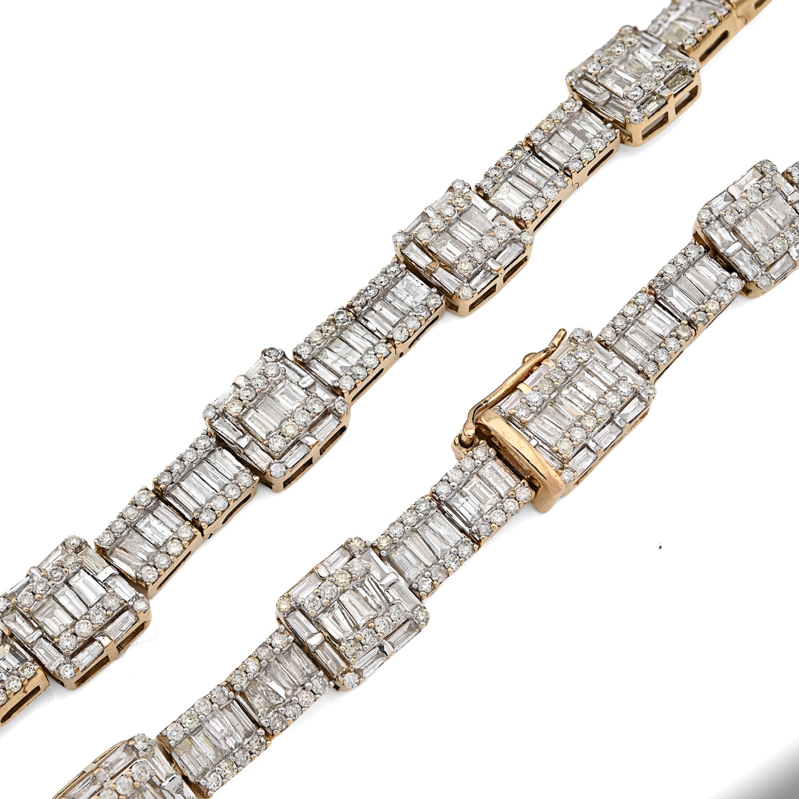 Illuminate your presence with this resplendent 10k yellow gold tennis chain, an uncompromising celebration of diamond luxury. The impressive 8mm halo clusters feature a harmonious blend of baguette and round diamonds totaling 22 carats, creating an extraordinary symphony of light and brilliance. Each cluster is meticulously designed with halo settings that amplify sparkle and create dimensional depth, transforming the necklace into a continuous cascade of radiance. The substantial 50-gram weight affirms exceptional craftsmanship and quality materials, delivering commanding presence that speaks to authenticity and refinement. The warm, luminous finish of 10k yellow gold provides an elegant foundation that complements the diamond settings while developing rich character with time. The mixed diamond shapes create sophisticated visual complexity, appealing to discerning collectors who appreciate intricate design details. This necklace transcends conventional jewelry, serving as a definitive statement piece for those who embrace uncompromising luxury and timeless elegance.