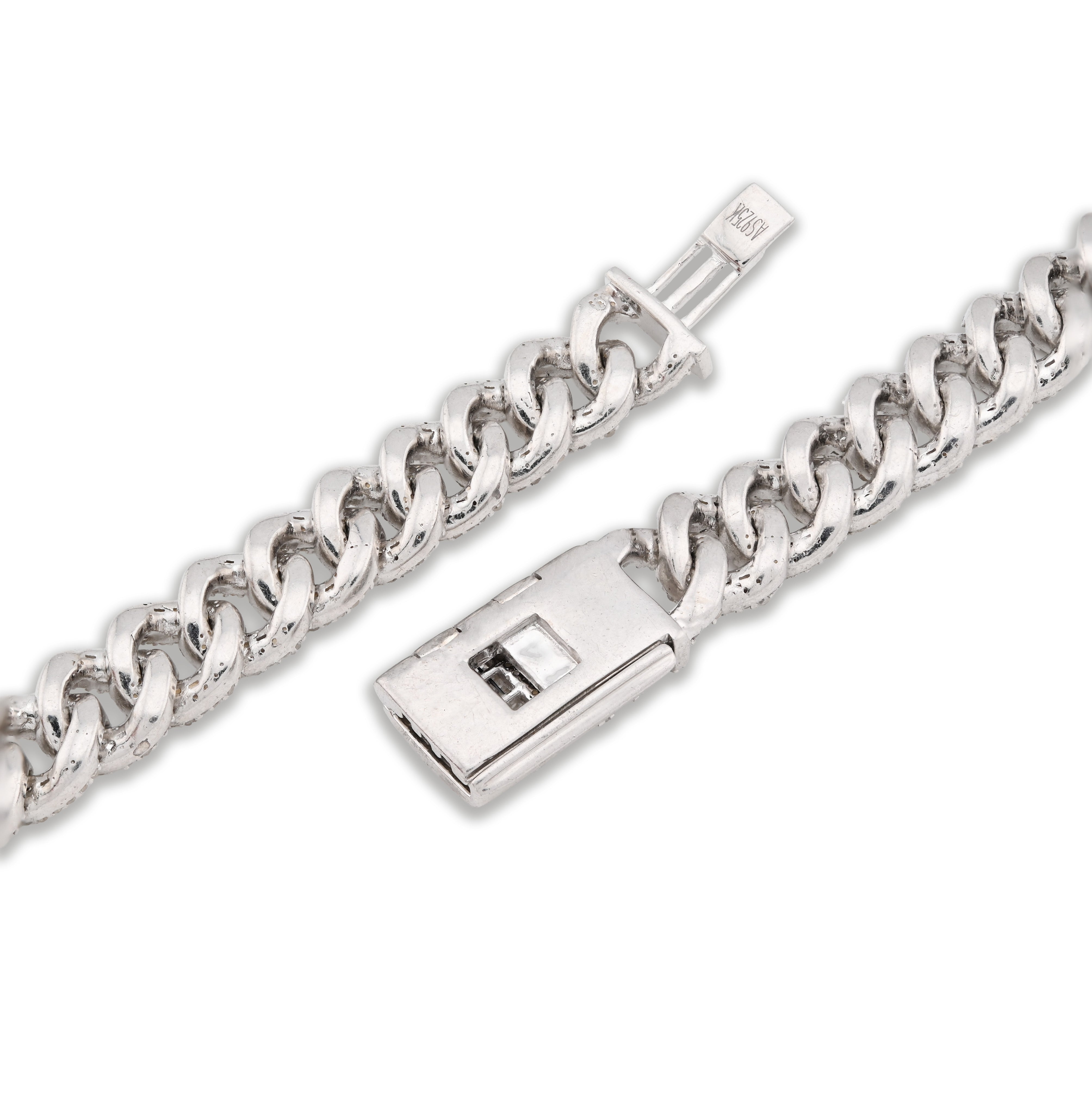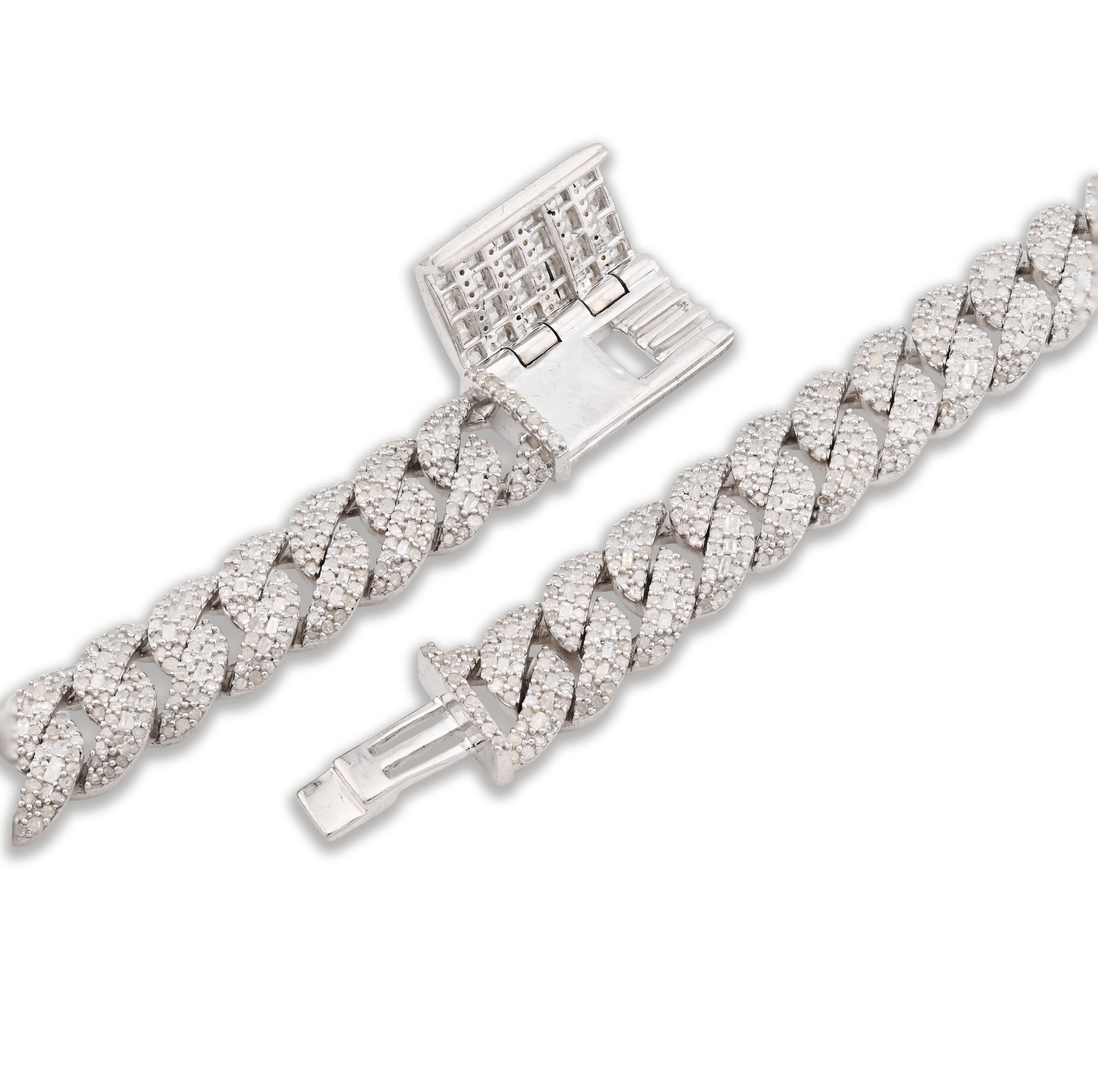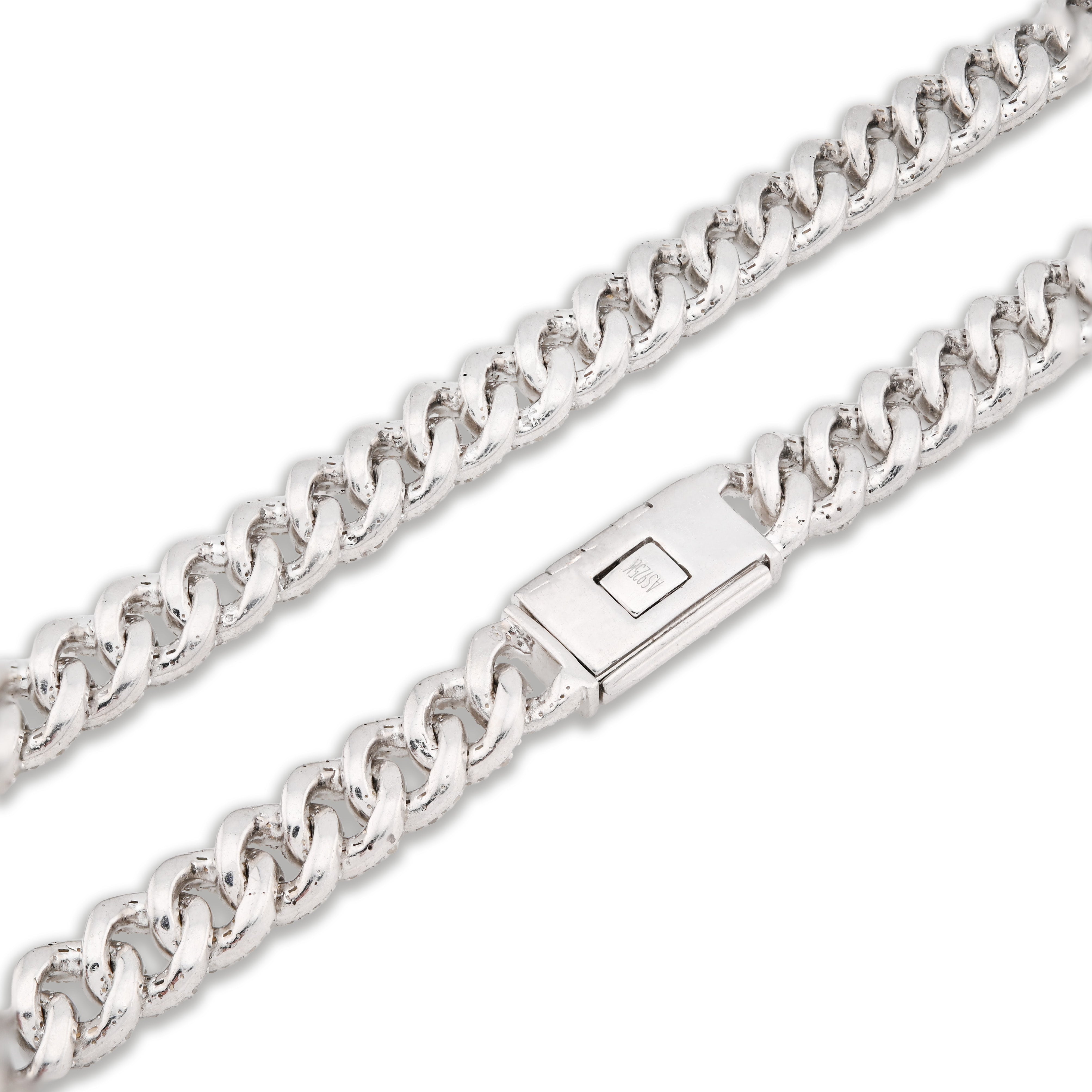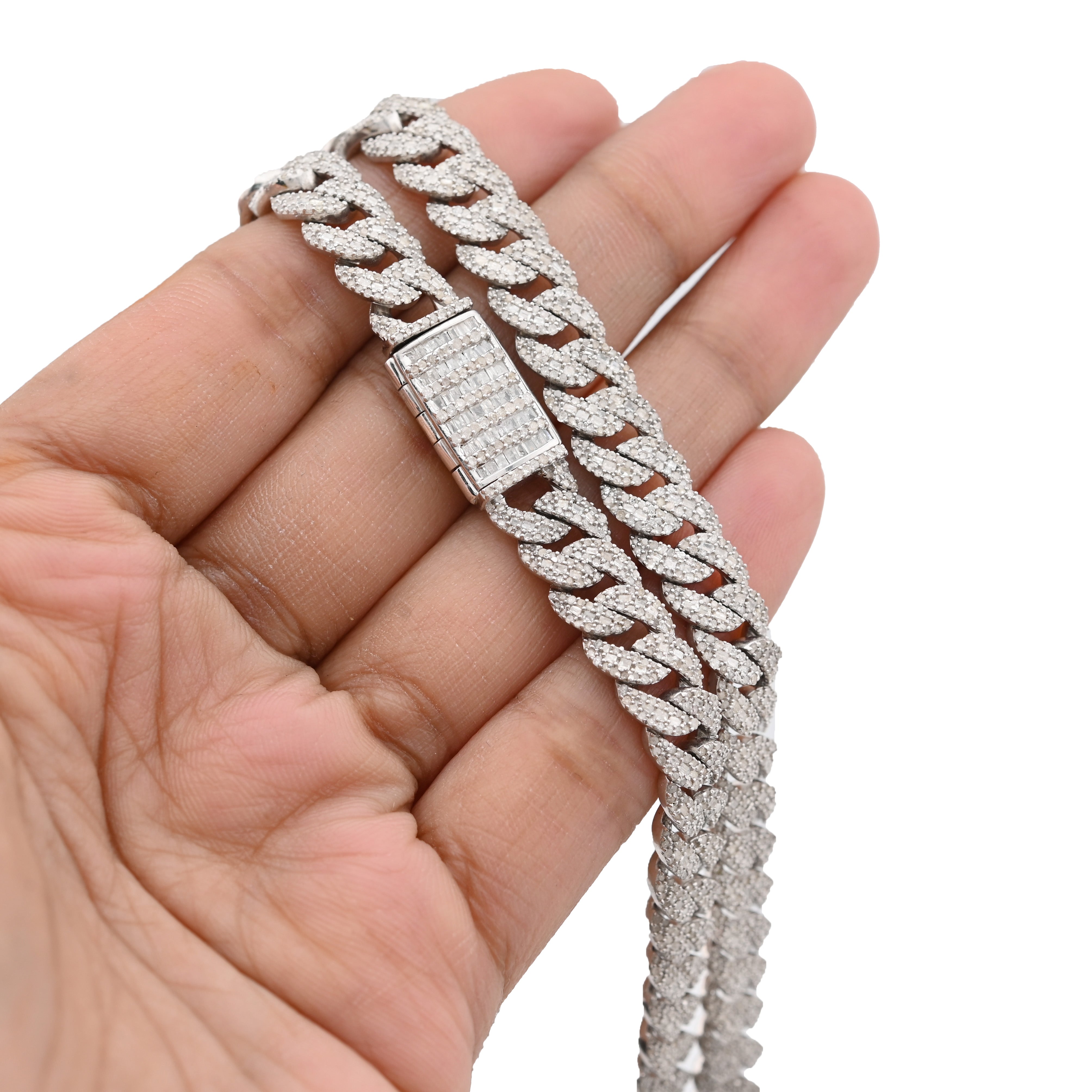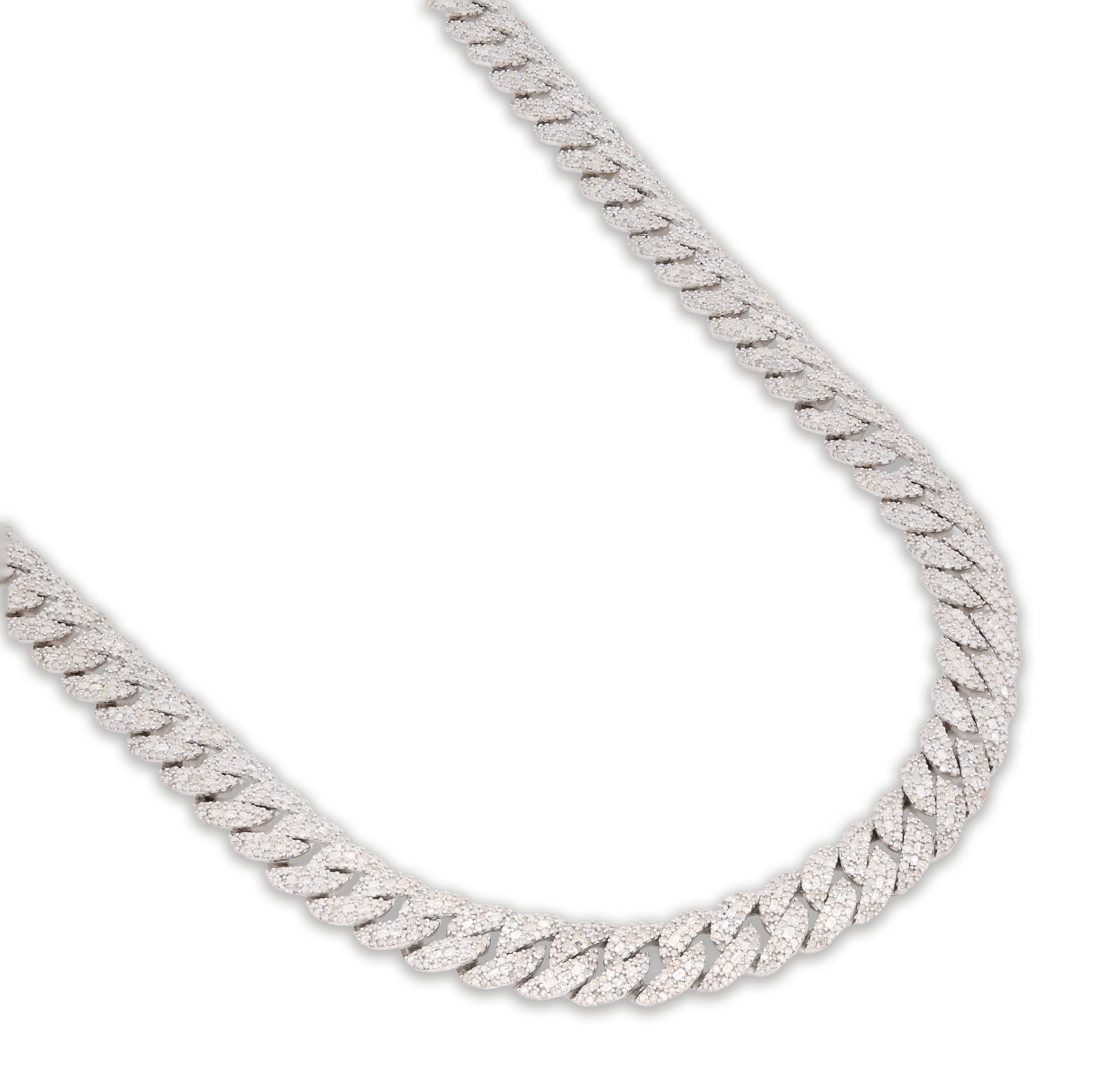Radiate luxury with this spectacular iced-out Cuban link chain in sterling silver. Featuring 11.67 carats of pure diamonds meticulously set throughout the 8mm links, this 22-inch necklace creates an extraordinary sparkle that commands attention. Weighing 72.6 grams, the piece offers substantial heft and presence befitting its diamond-laden design. Sterling silver provides a brilliant backdrop that amplifies diamond brilliance while offering timeless durability. The classic Cuban link silhouette combined with full diamond coverage creates an unmistakably opulent aesthetic. An exceptional choice for those who appreciate uncompromising craftsmanship and show-stopping elegance.