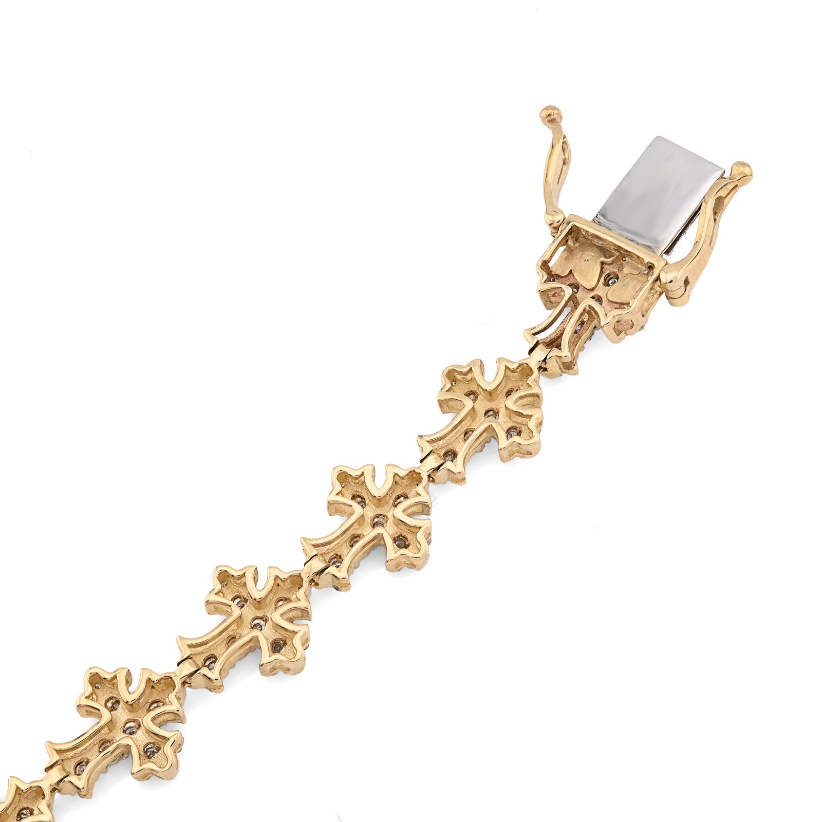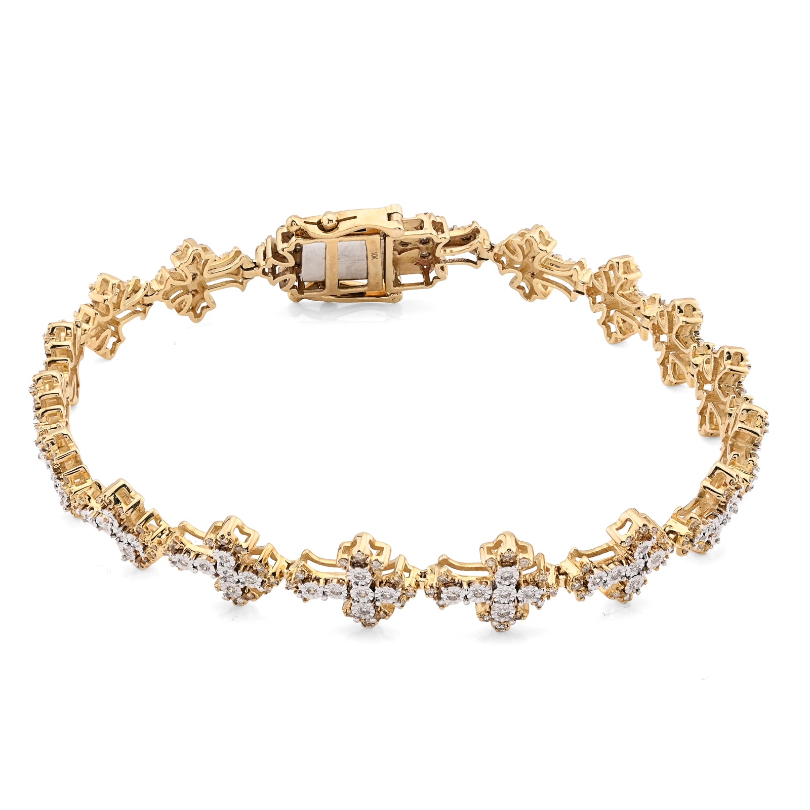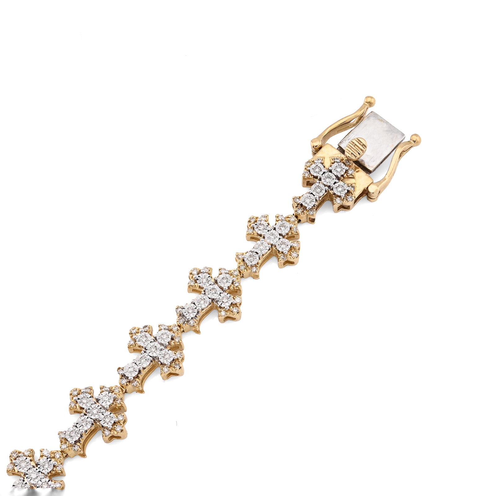 This distinguished 9.4MM cross link bracelet in 10k yellow gold merges spiritual symbolism with contemporary luxury. Adorned with 3.5 carats of natural diamonds thoughtfully integrated throughout the design, each stone catches light with remarkable clarity and brilliance. The 14-gram weight provides substantial presence without excess, while the cross link motif adds meaningful dimension to the piece. Measuring 8 inches, it offers a comfortable fit that works beautifully on its own or paired with complementary pieces. Perfect for those seeking jewelry that reflects both personal values and refined aesthetic sensibility, this bracelet transcends trends with timeless appeal.