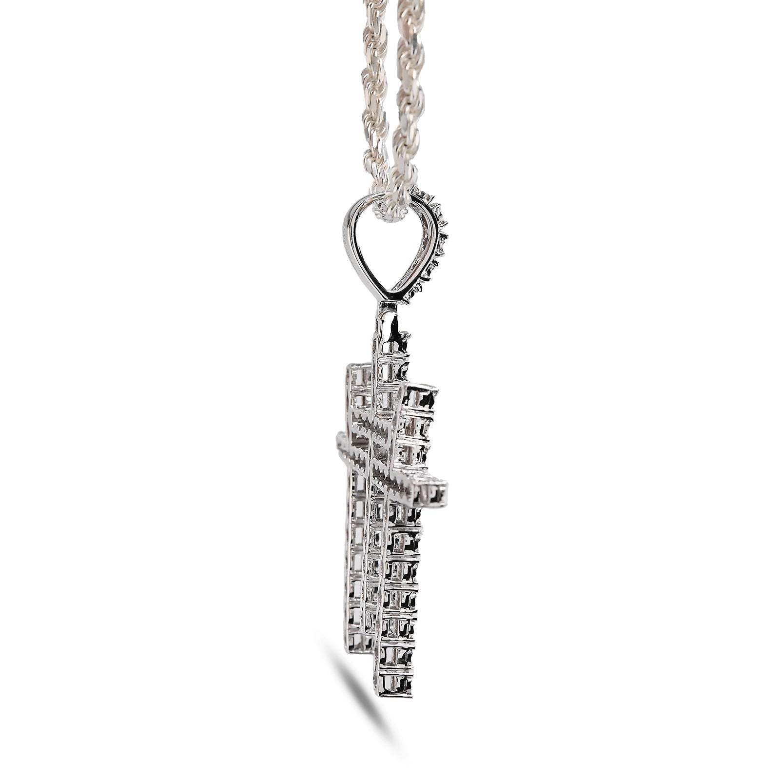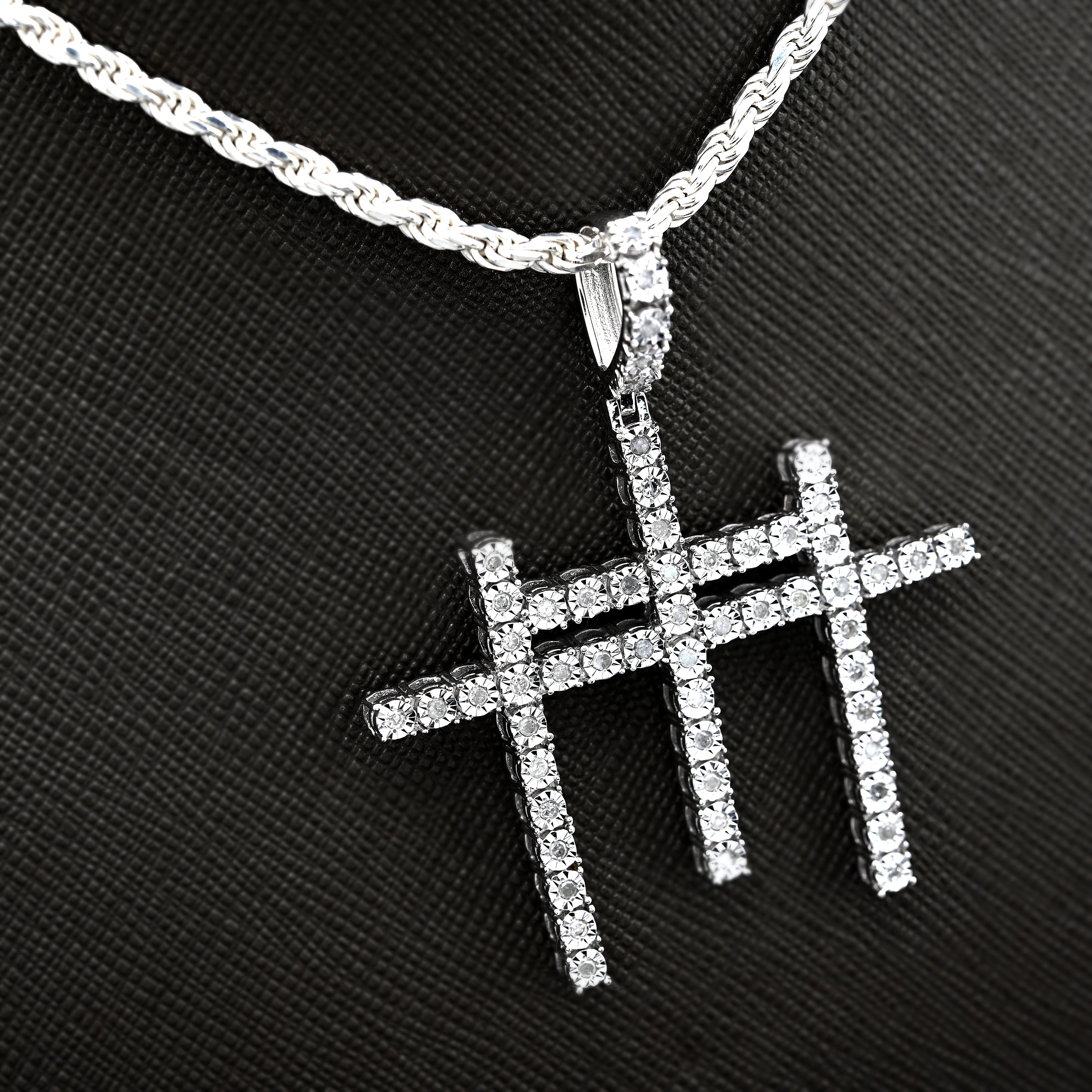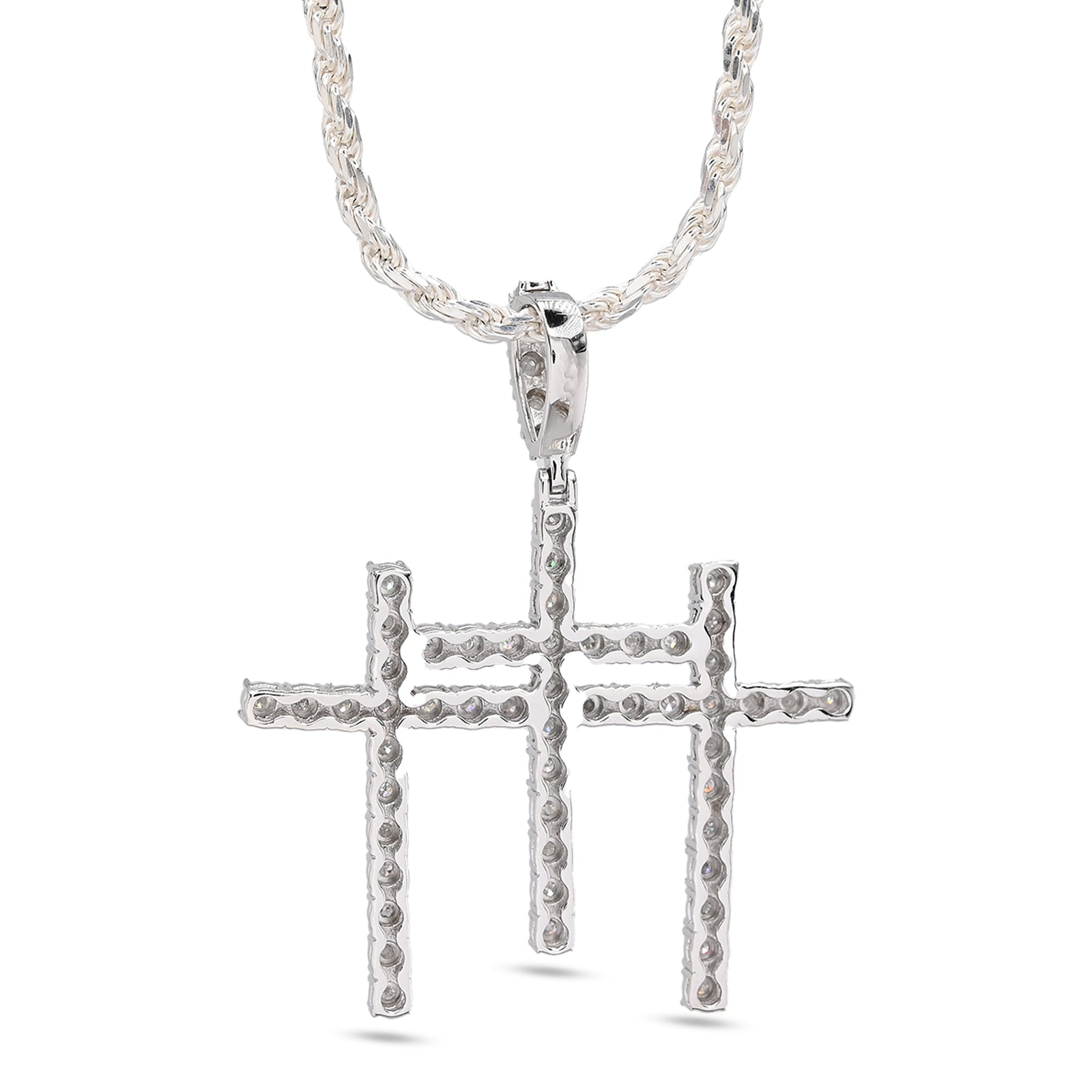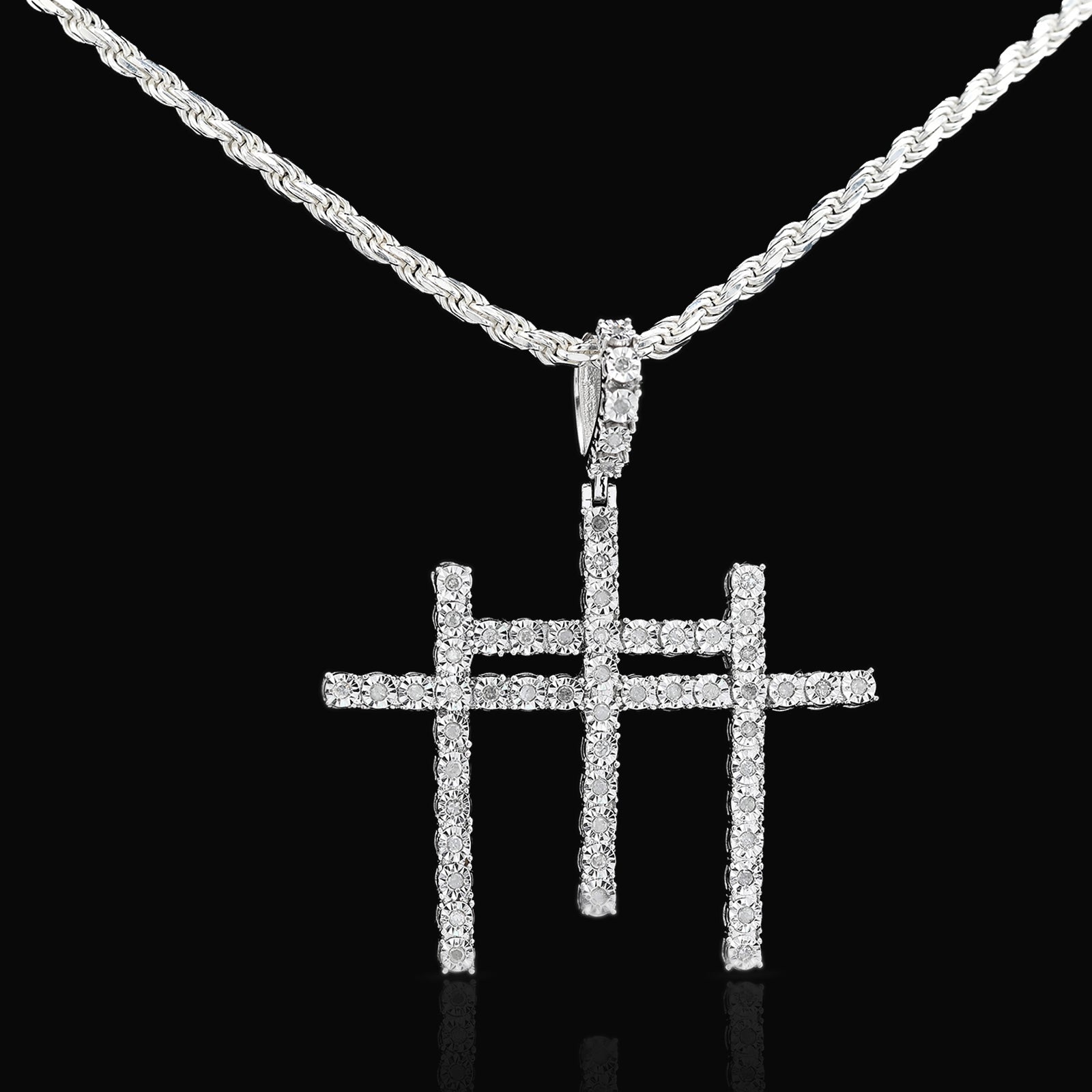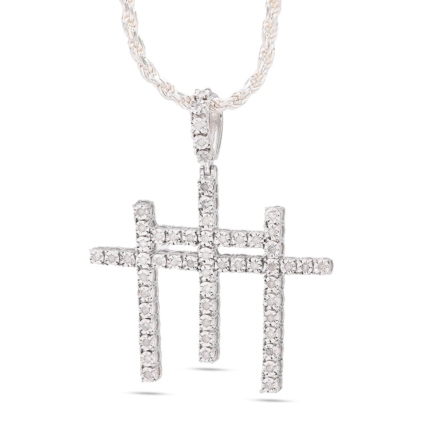 This striking 925 sterling silver pendant features three interlocking crosses adorned with 0.55 carats of natural diamonds, creating a meaningful religious symbol with refined elegance. Weighing 7.7 grams, the piece offers substantial presence while maintaining comfortable wearability. The natural diamond accents catch light beautifully, adding sparkle to this devotional charm. Perfect for men seeking to express their faith through distinctive jewelry, this pendant pairs seamlessly with chains or leather cords for a personalized look that transcends everyday wear.