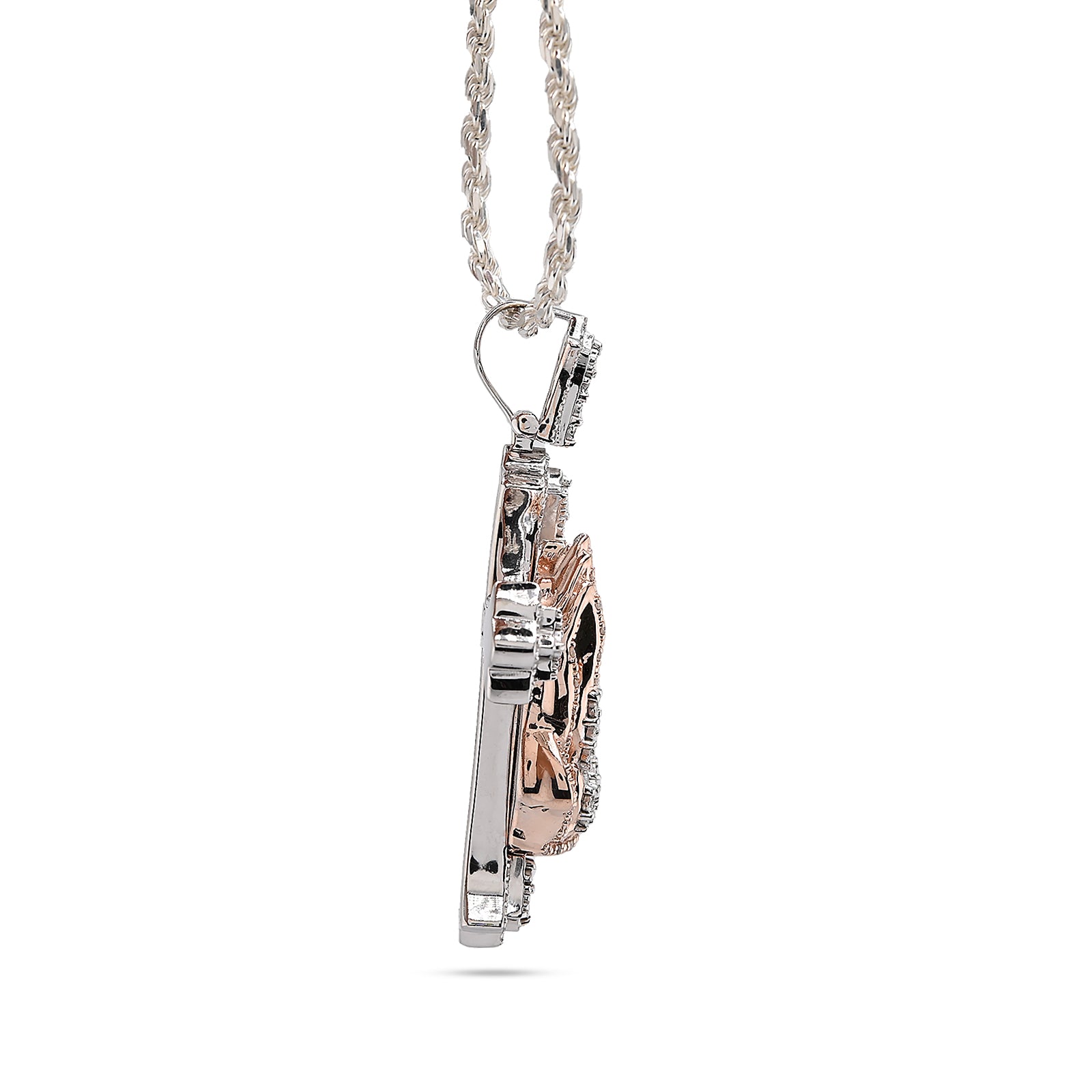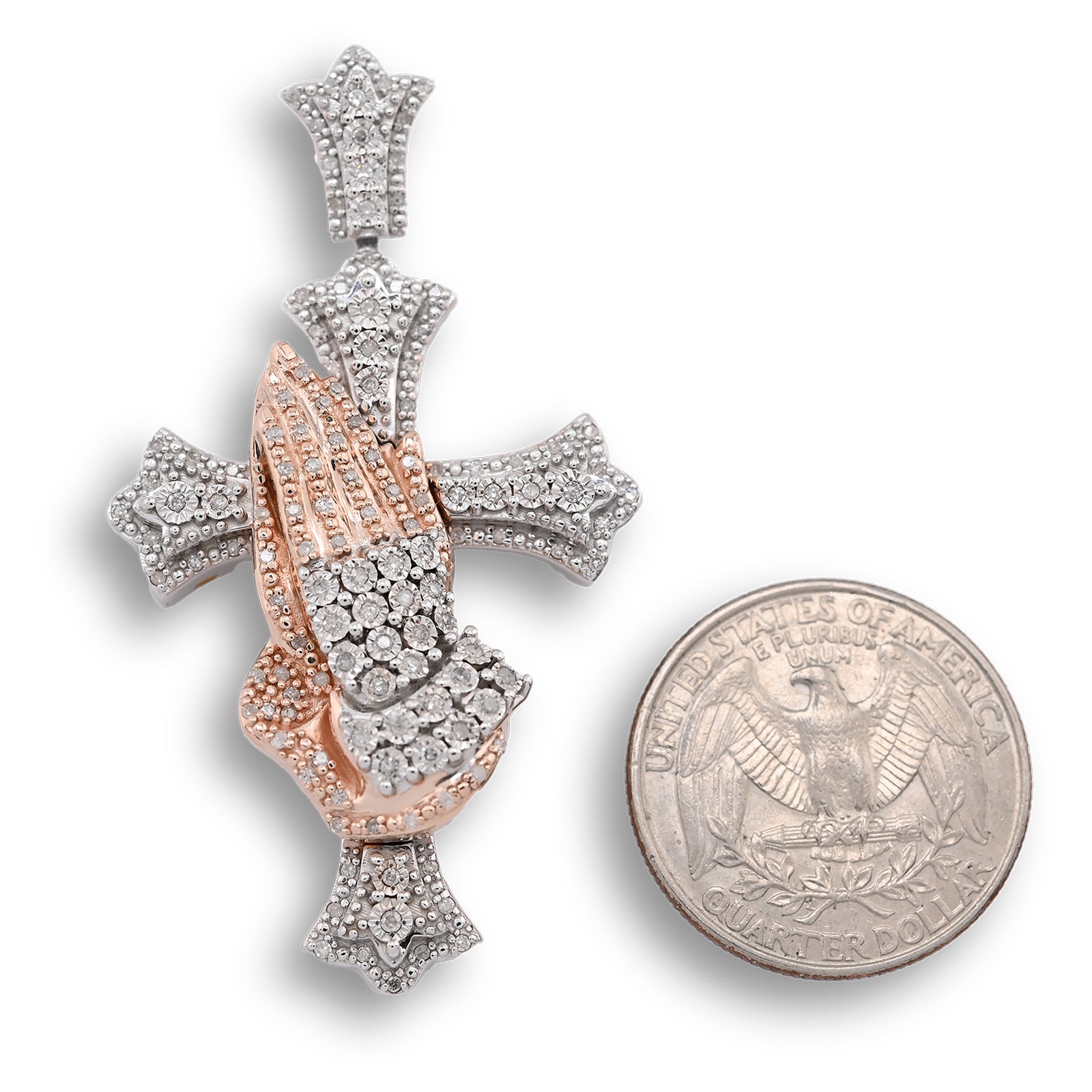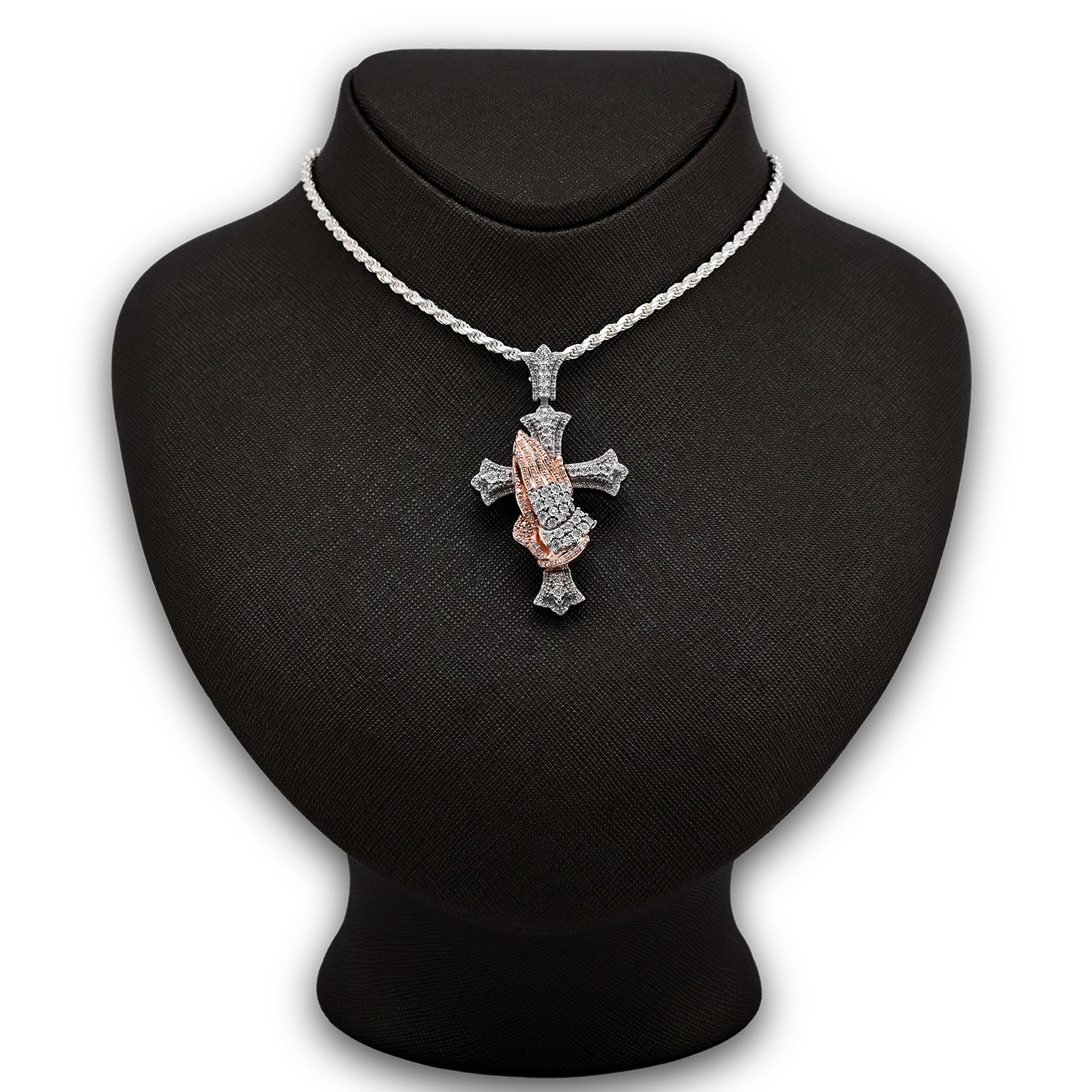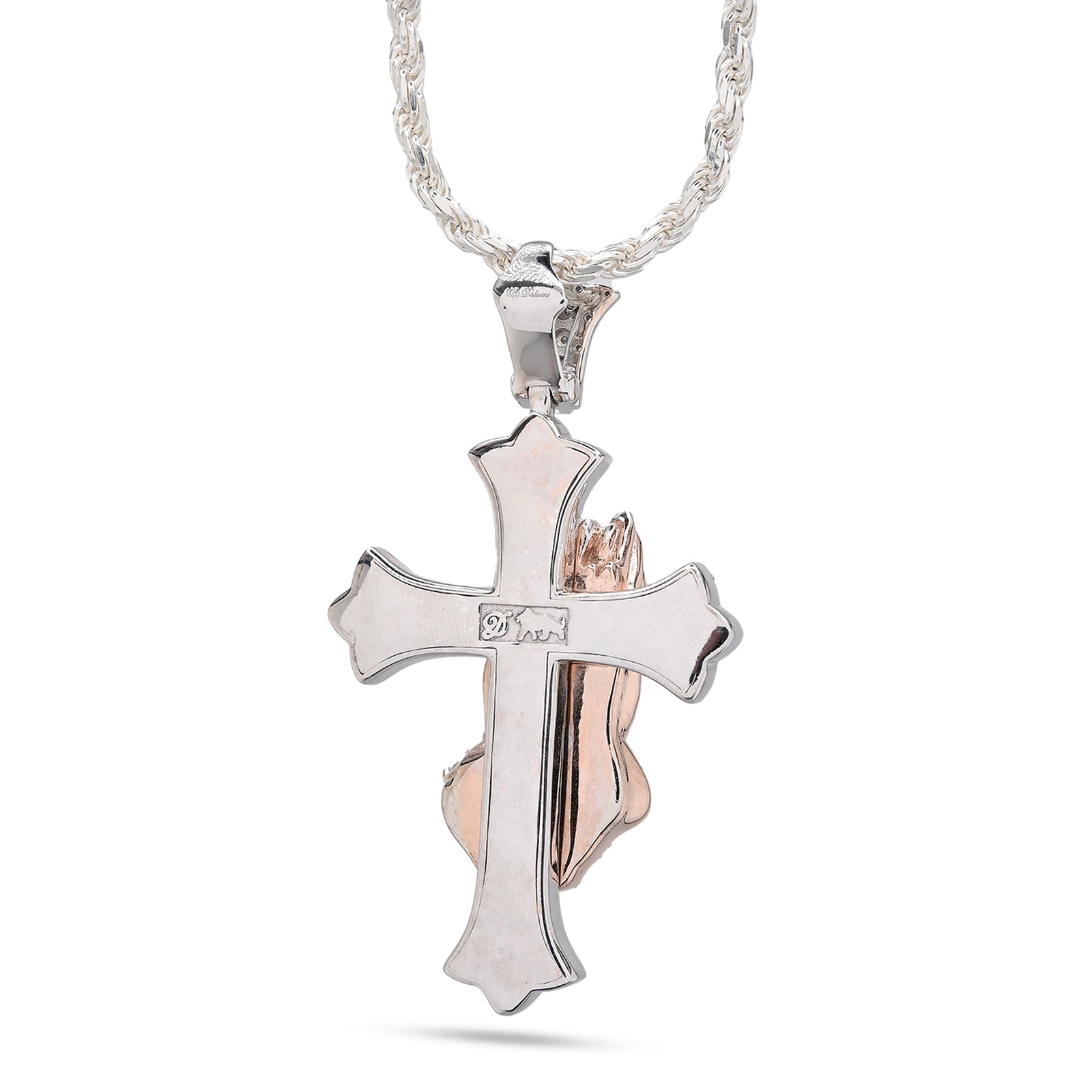 This elegant pendant combines spiritual symbolism with timeless craftsmanship. Crafted from sterling silver, it features a delicate cross adorned with 0.6 carats of natural diamonds, complemented by intricately detailed praying hands. Weighing 16 grams, this versatile charm works beautifully as a standalone pendant or layered piece. Perfect for those seeking meaningful jewelry that reflects faith and devotion with understated luxury.
