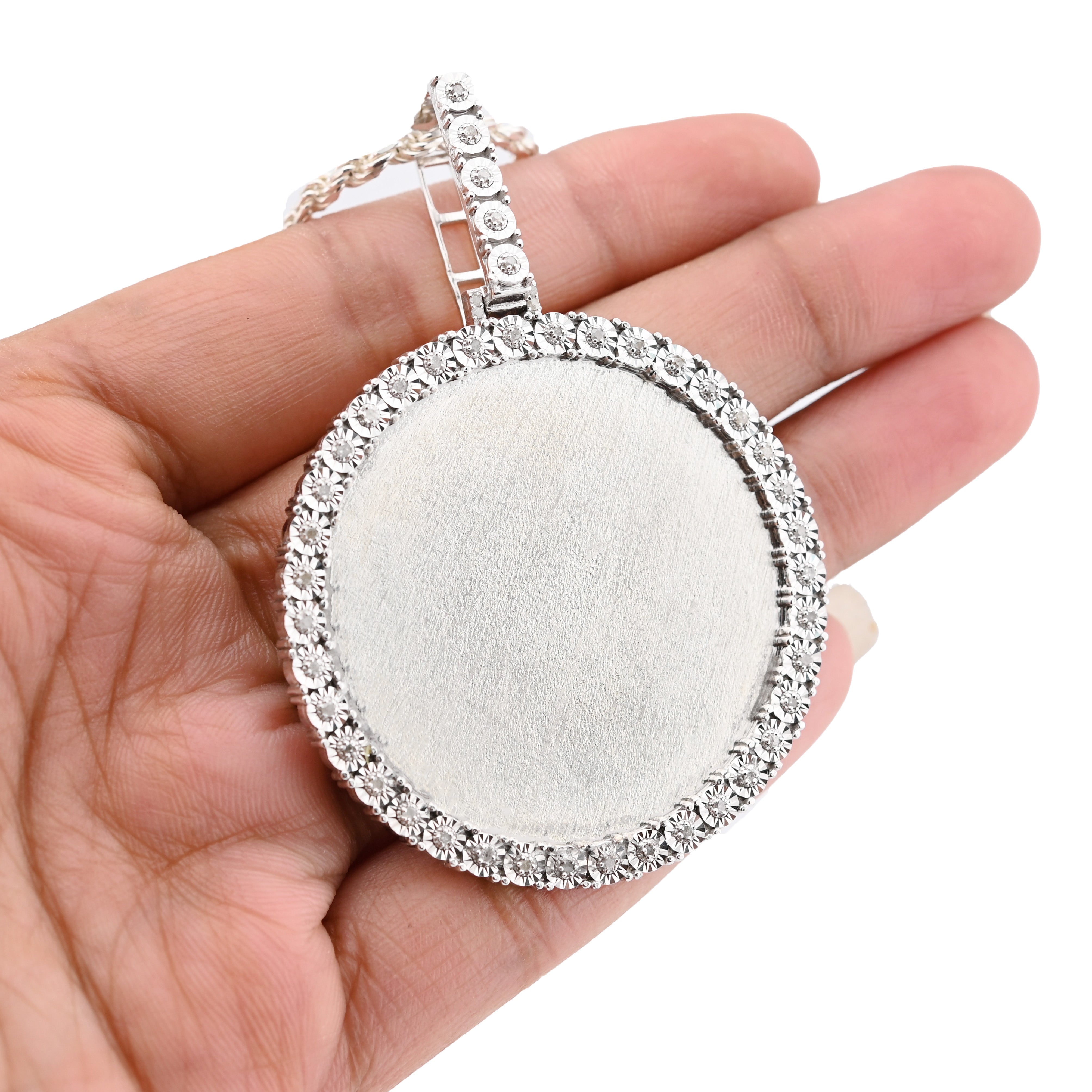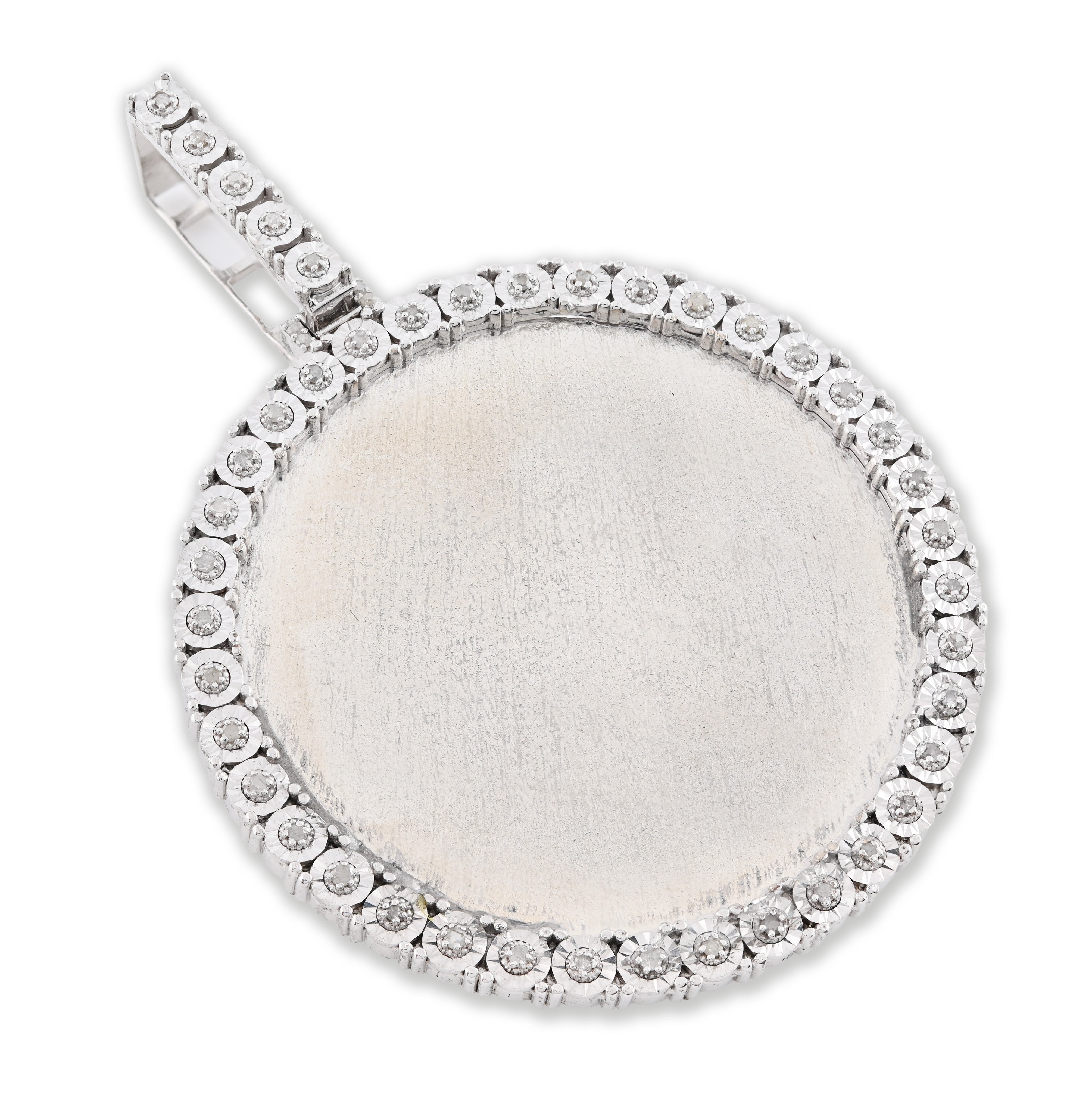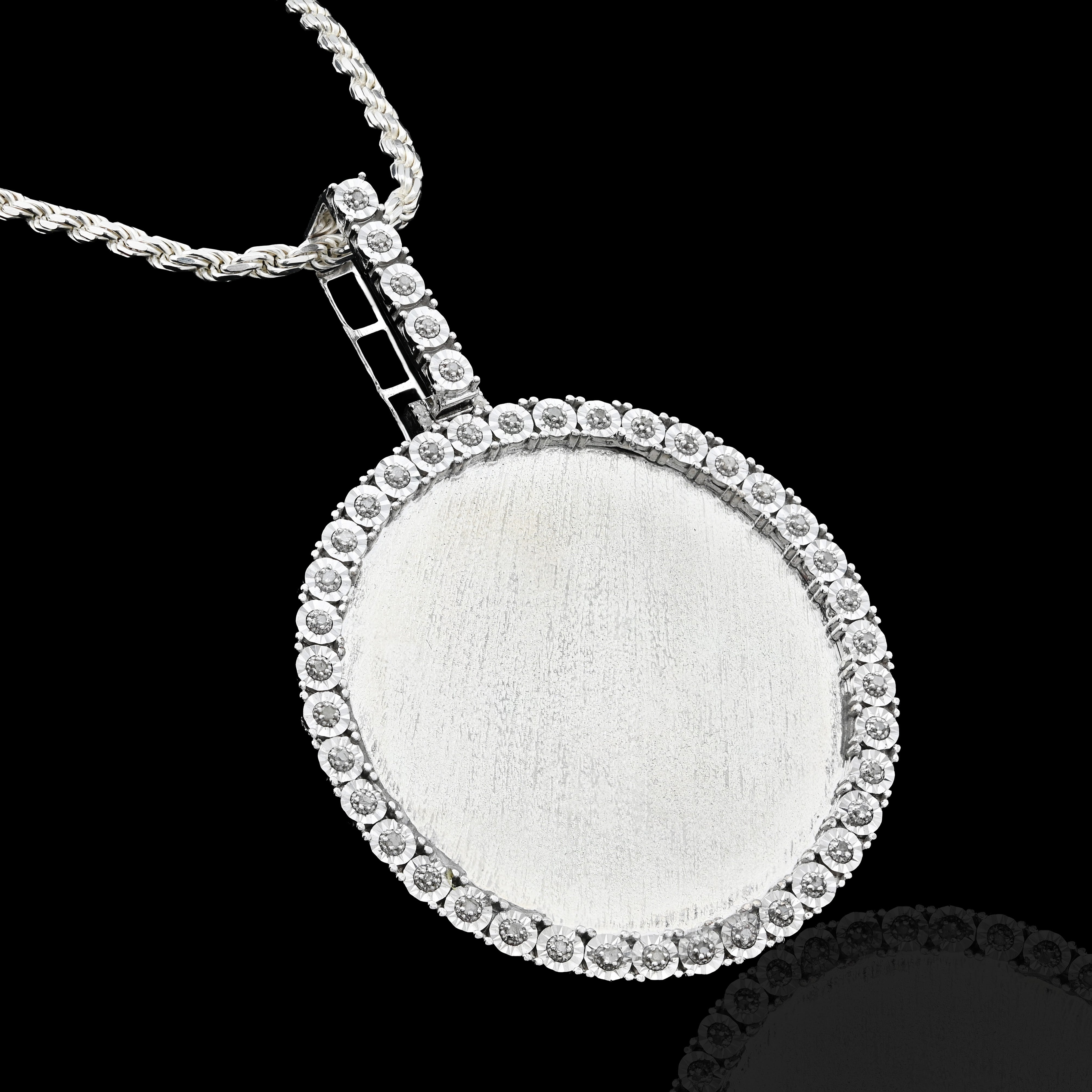Preserve cherished moments with this elegant memory pendant charm in lustrous 925 sterling silver. This substantial piece, weighing 15.1 grams, features a brilliant 0.6-carat genuine diamond and a round engraved design perfect for holding a treasured photograph or personal inscription. Its refined craftsmanship transforms everyday wear into a meaningful keepsake. An exceptional choice for commemorating loved ones or marking life's most precious memories with timeless sophistication and enduring elegance.