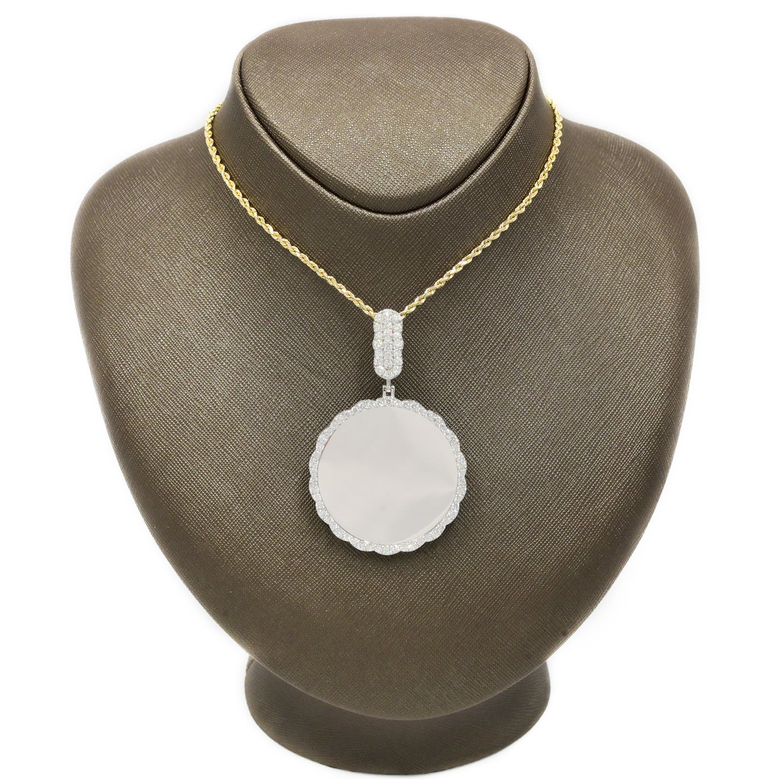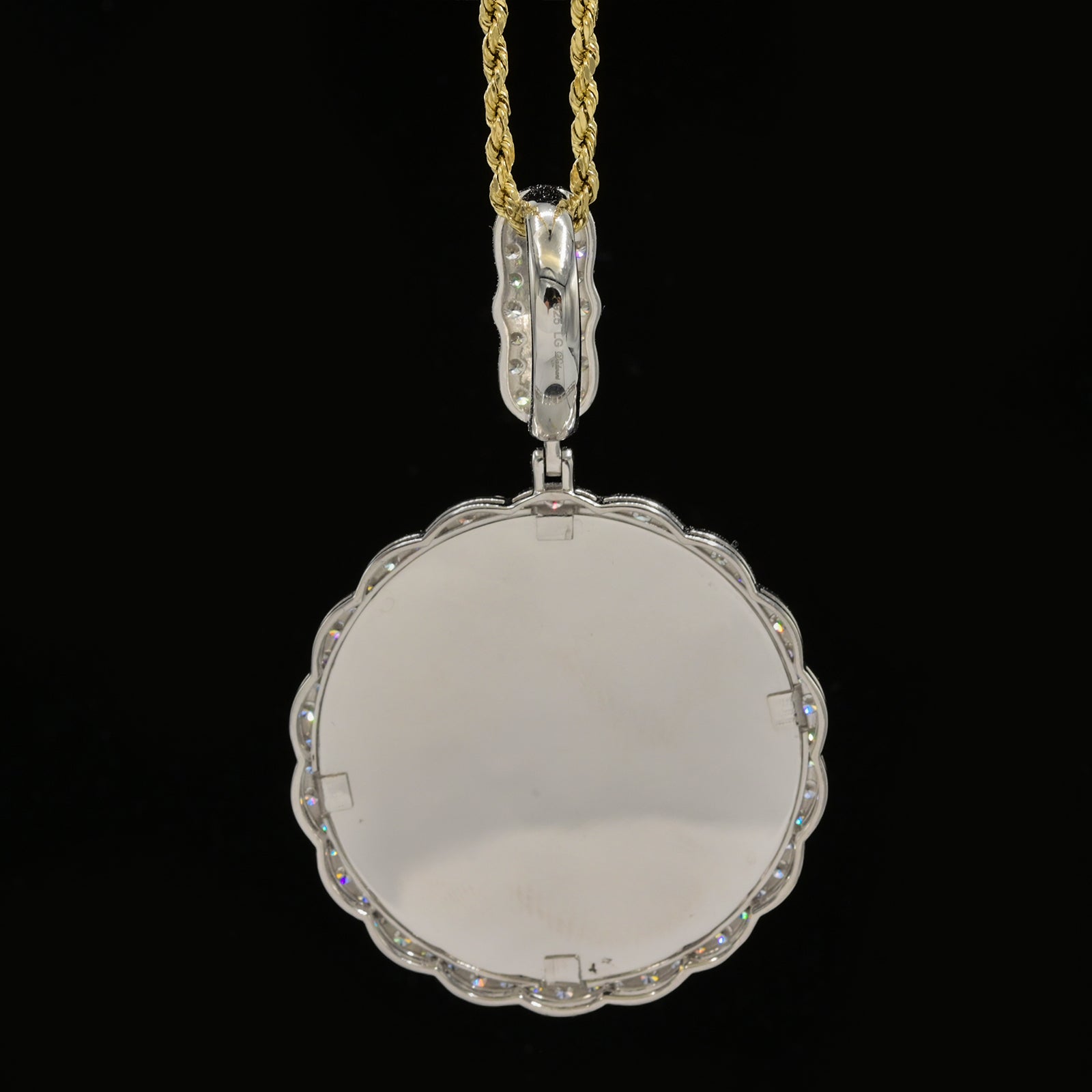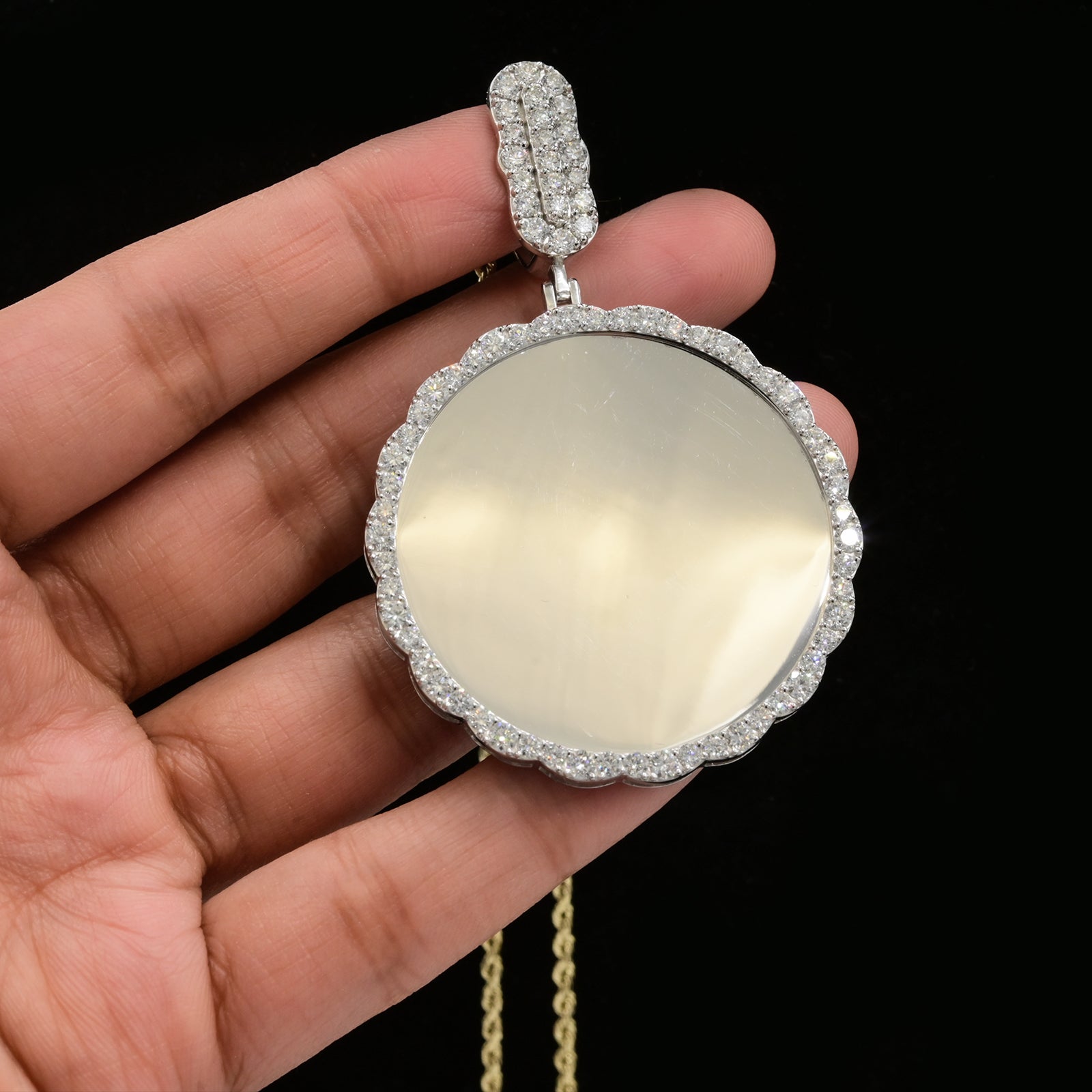 Discover refined elegance with this exquisite 925 silver pendant, showcasing 3.54 carats of lab-grown diamonds set within gracefully curved edges. The flowing silhouette softens the design while maximizing light reflection across the diamond surface, creating captivating sparkle from every angle. At 11.4 grams, this pendant commands attention with substantial presence and quality craftsmanship. The integrated picture charm frame allows you to preserve and display meaningful imagery close to your heart. Lab-grown diamonds ensure ethical sourcing without compromising on brilliance or beauty. A sophisticated accessory that celebrates both personal significance and timeless design.