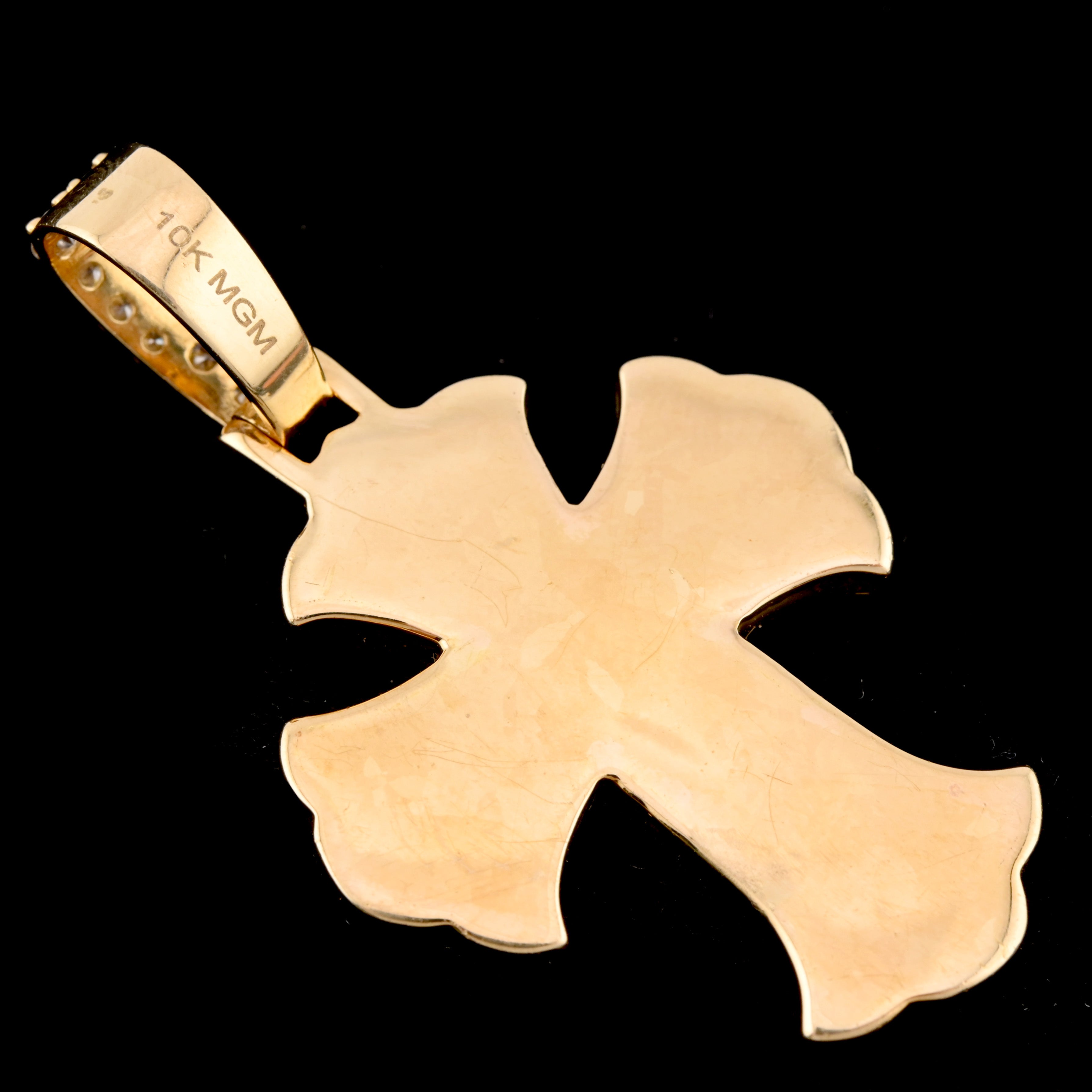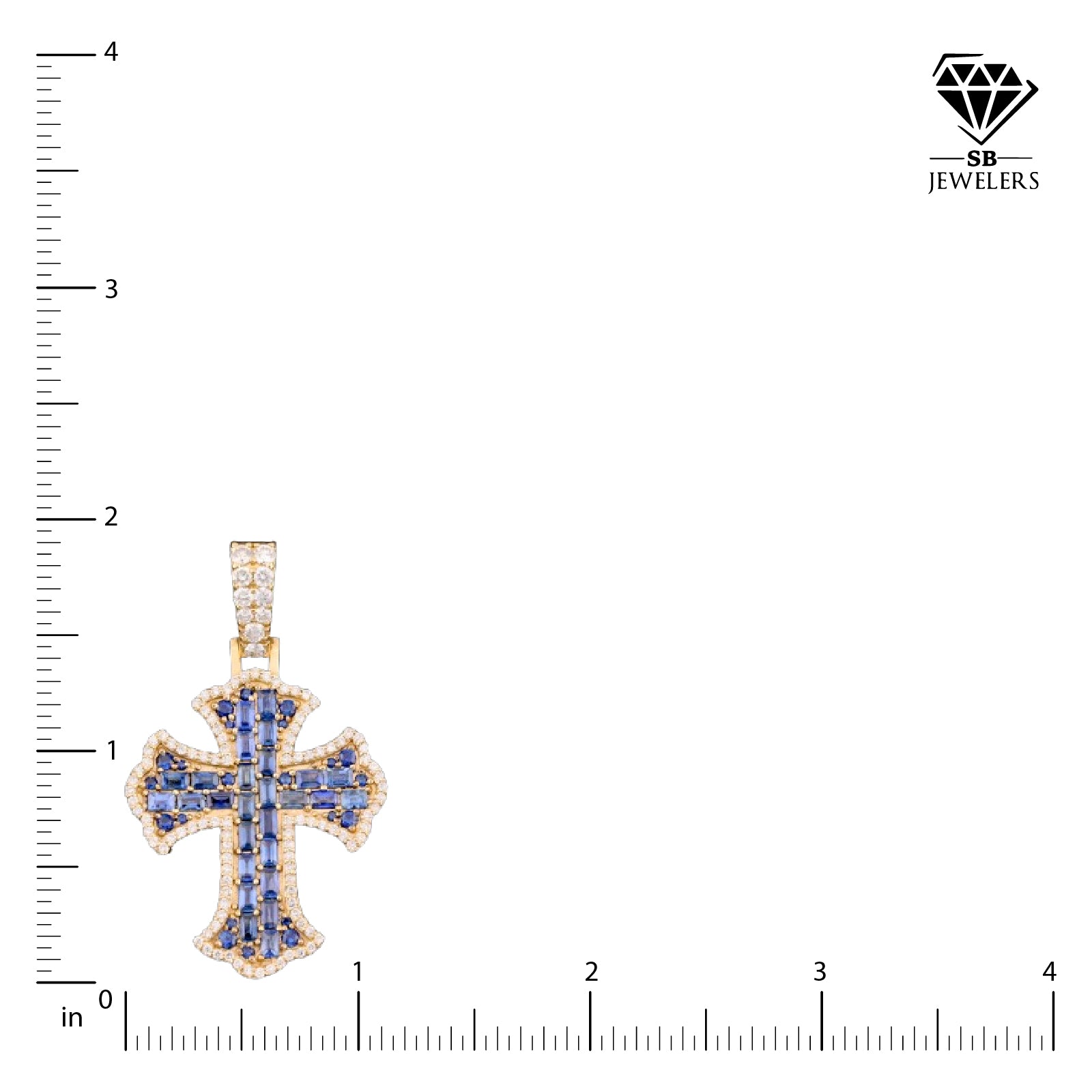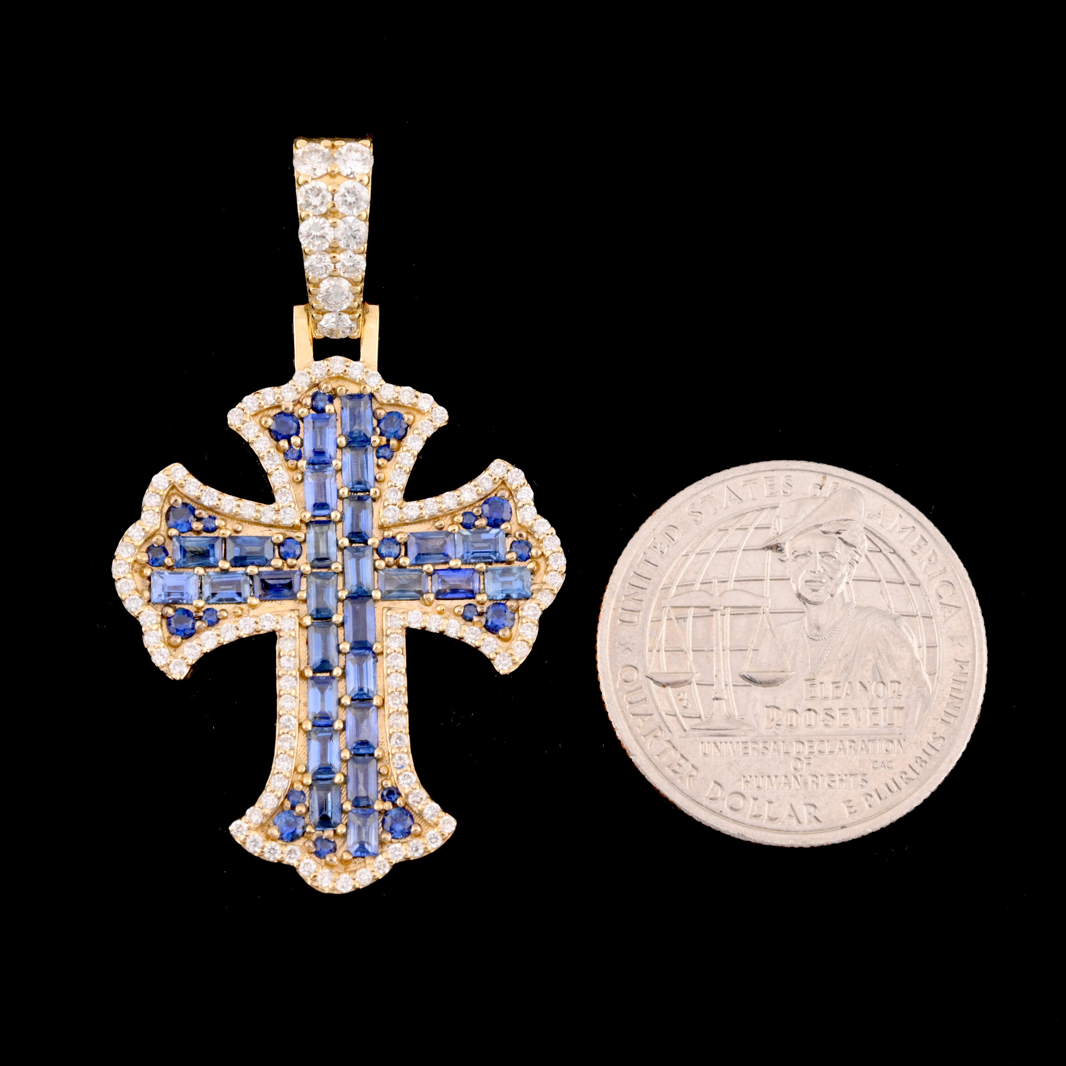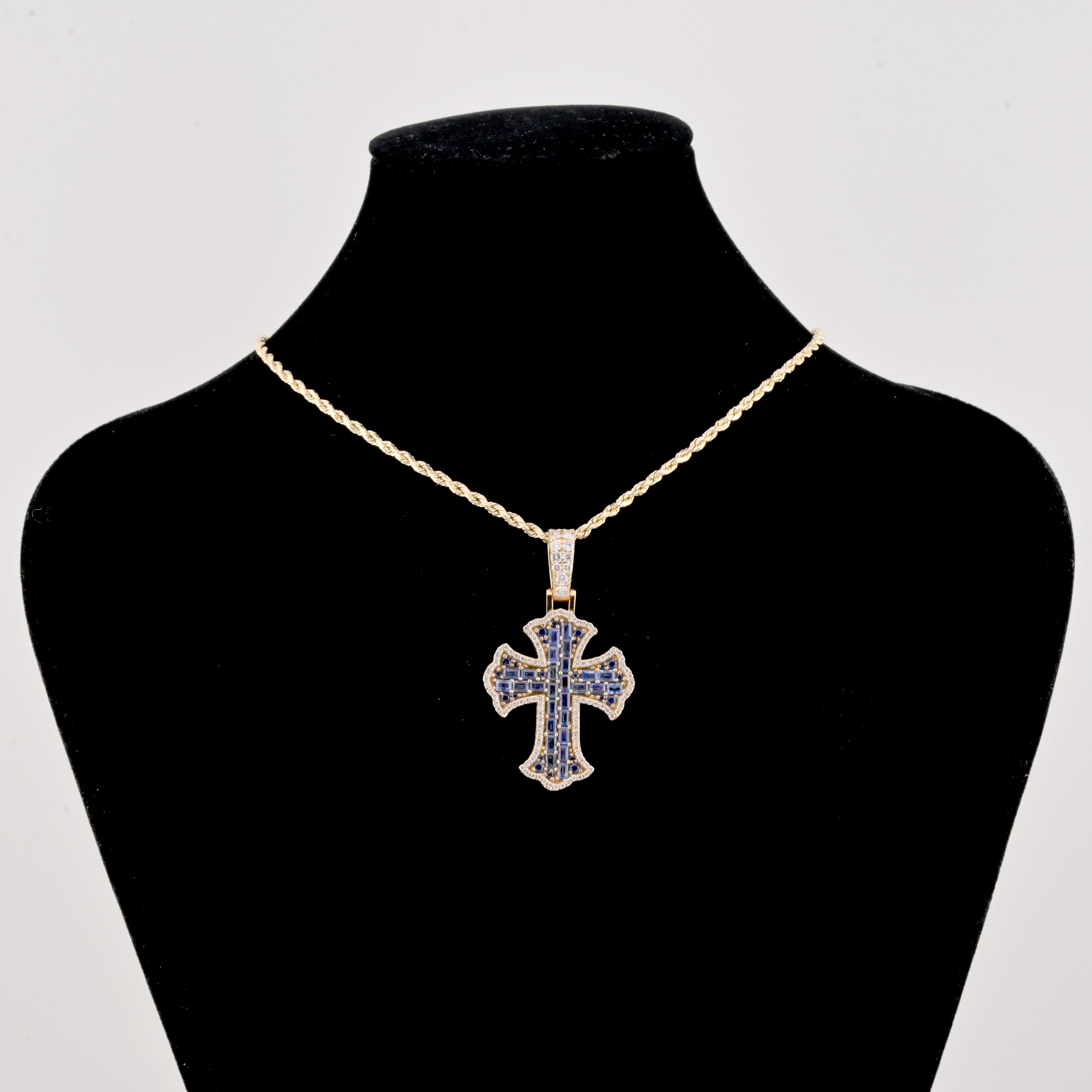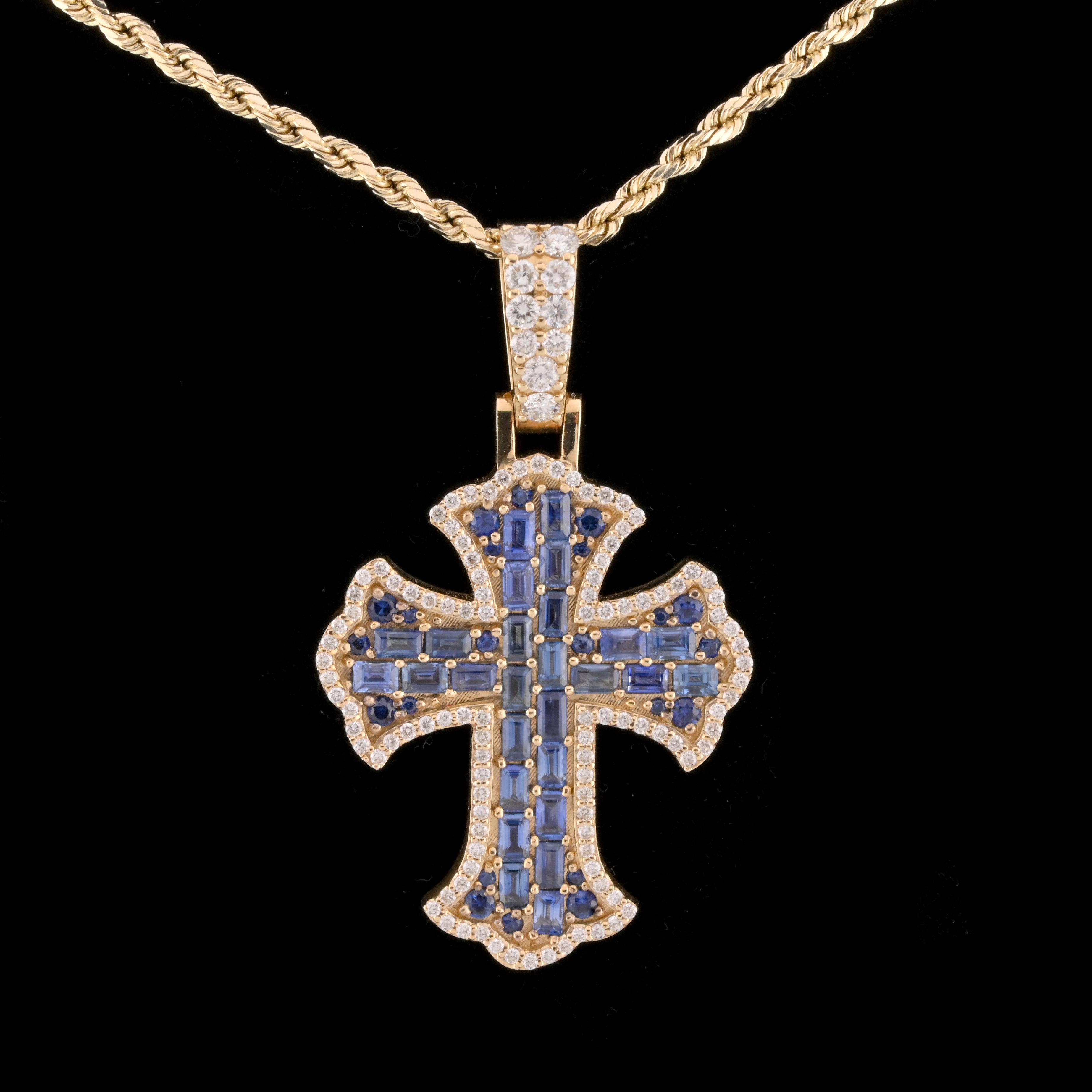This 10k yellow gold cross pendant, weighing 11.1 grams, features expertly set blue lab-grown diamonds in both round and baguette cuts. The combination of shapes enhances the piece’s depth and brilliance, creating a striking yet refined expression of faith. Durable and elegant, this pendant offers a modern take on a classic symbol with exceptional craftsmanship.