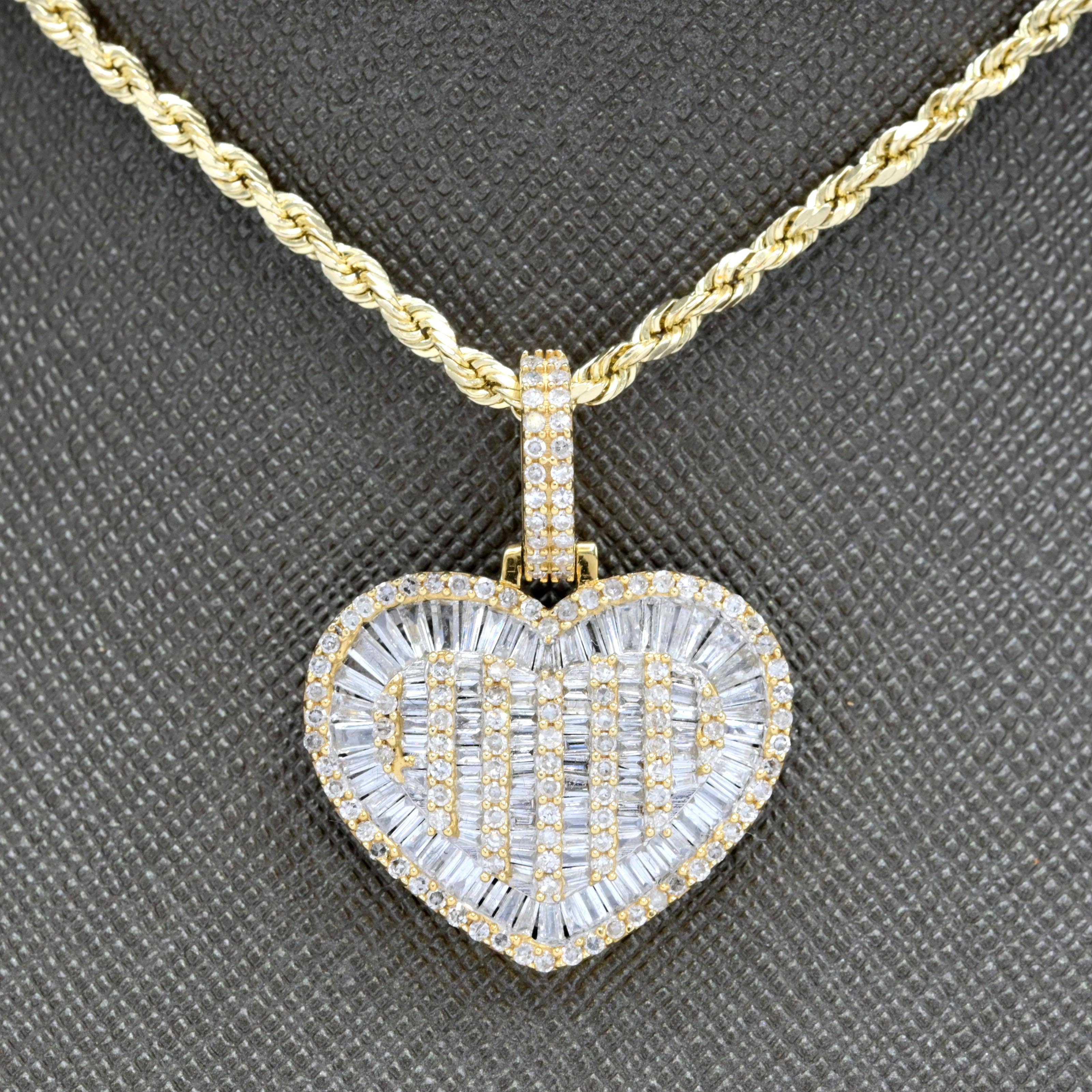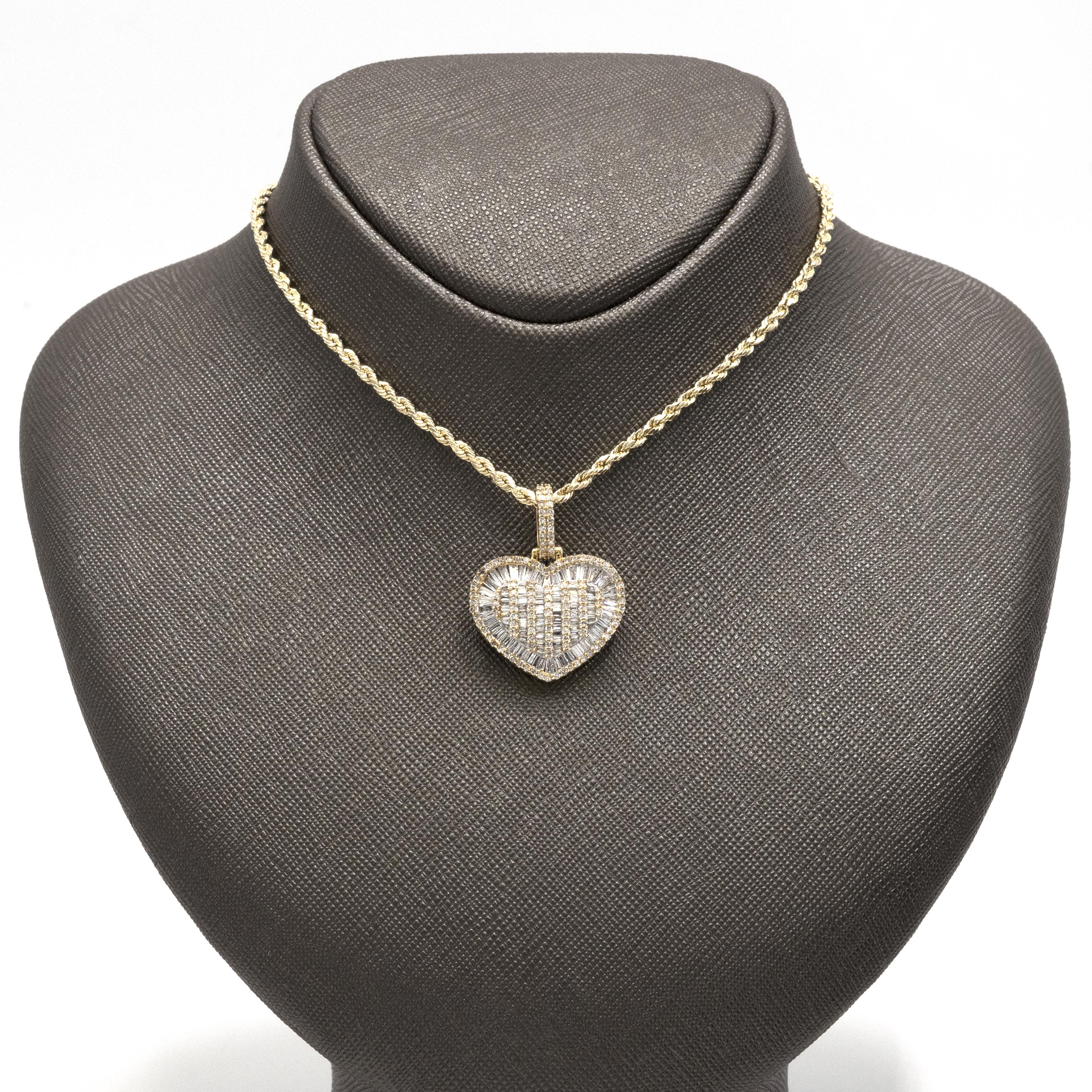 This exquisite women's heart pendant is crafted from 10k yellow gold, weighing 4.9 grams for a substantial yet elegant feel. It features 1.55 carats of natural baguette-cut diamonds, arranged to enhance brilliance and sophistication. The pendant combines timeless design with expert craftsmanship, making it a refined accessory suitable for both everyday wear and special occasions.
