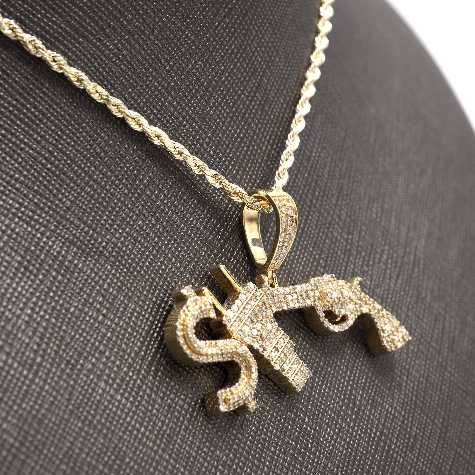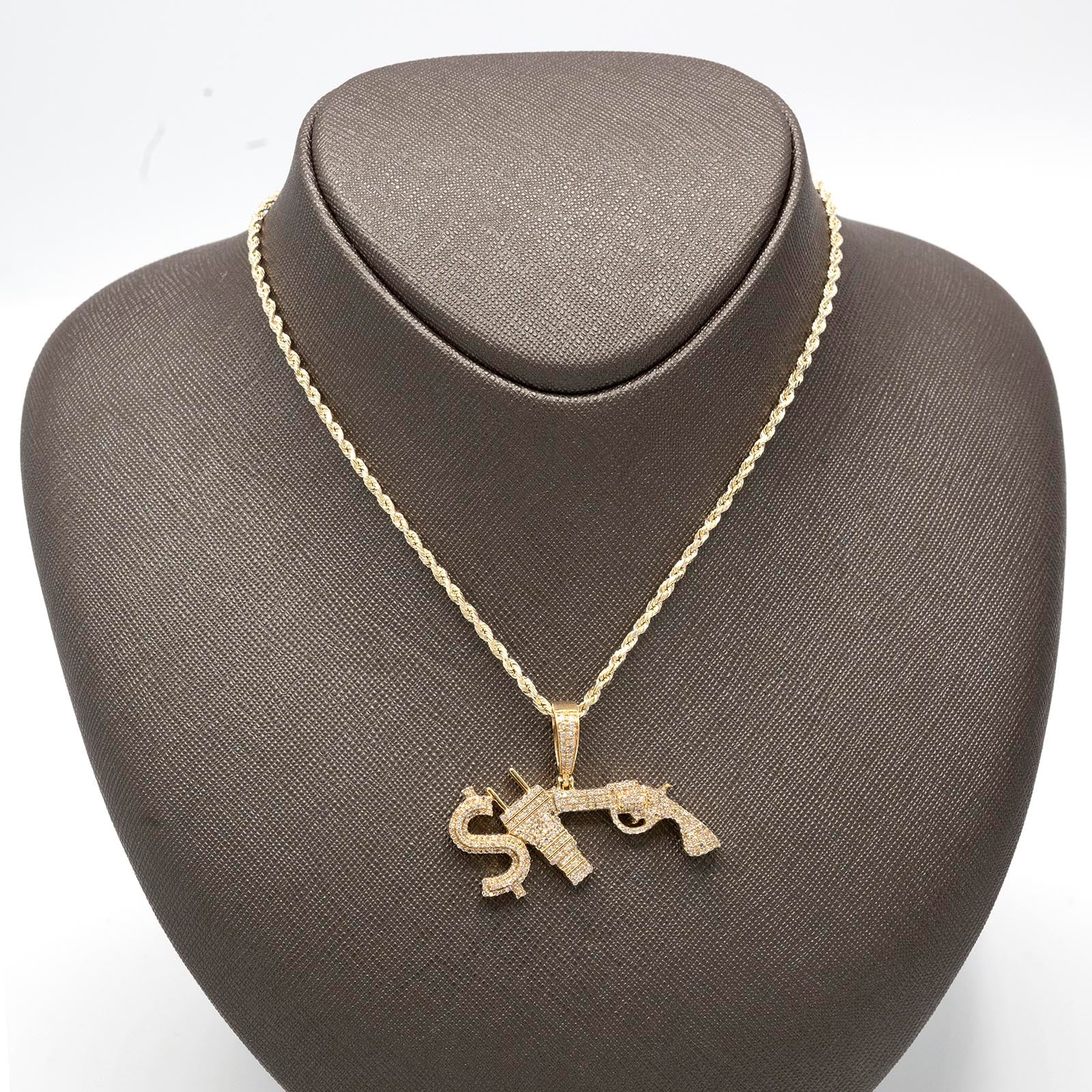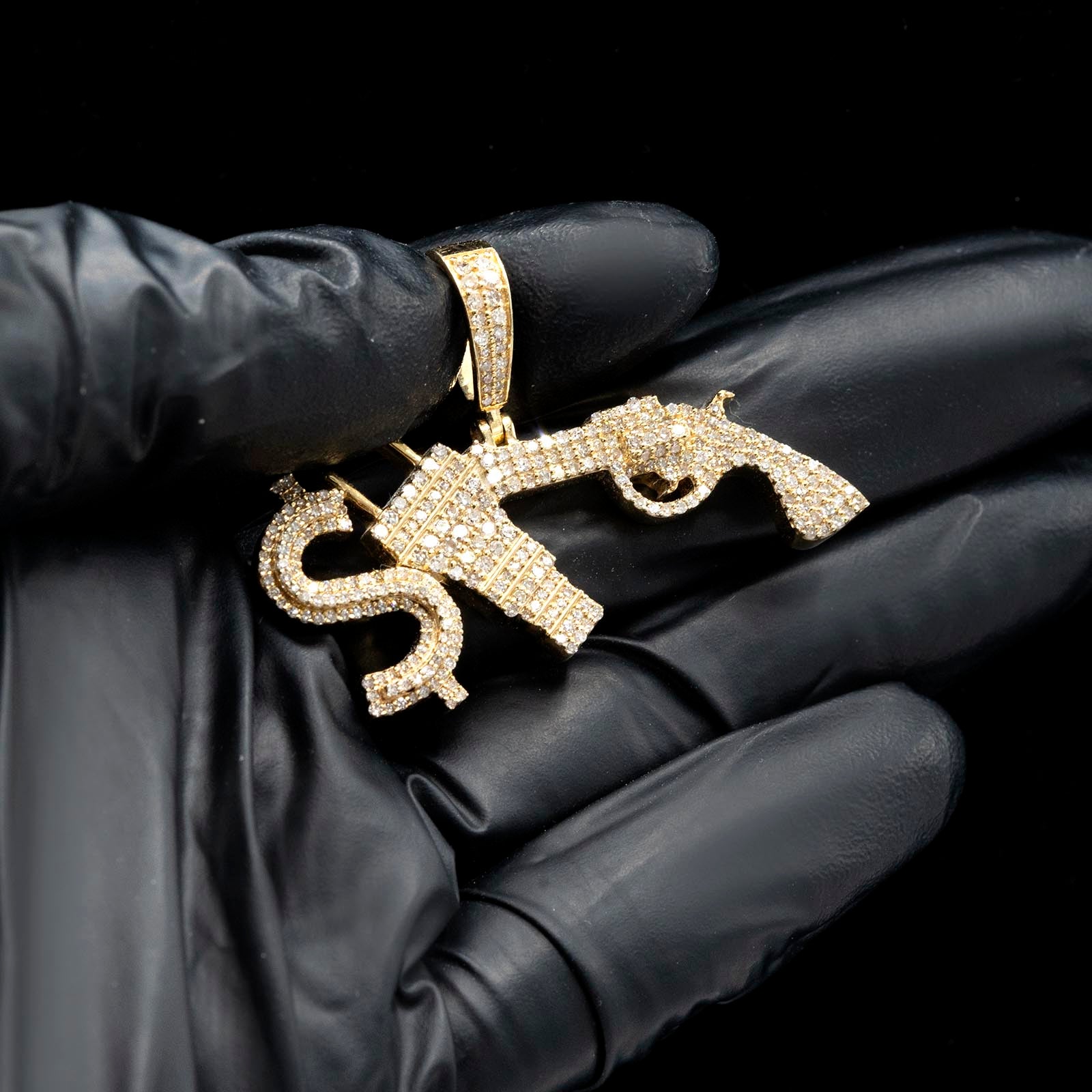 Assert your distinctive presence with this striking 10k yellow gold pendant, a bold expression of contemporary style. Lavishly iced with 1.3 carats of natural diamonds, the piece radiates uncompromising brilliance from every facet, with each stone meticulously set for maximum luminosity. The dual motif—featuring dollar sign and gun imagery—creates a powerful visual narrative that speaks to ambition and confidence. Weighing a substantial 10 grams, this charm delivers authentic heft and quality construction that distinguishes it from ordinary pendants. The warm radiance of 10k yellow gold provides an elegant backdrop for the diamond setting, creating sophisticated contrast. This pendant transcends typical jewelry, functioning as a personal emblem for those who embrace bold aesthetics and refuse to blend into the background. A commanding piece for the man who leads rather than follows.