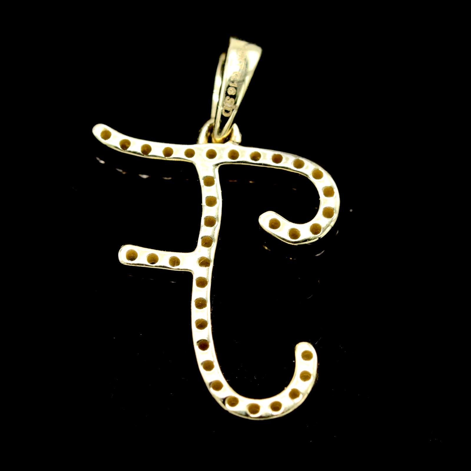 Crafted from 10k yellow gold, this Initial F pendant features a total of 0.16 carats of natural diamonds, adding subtle brilliance to its elegant design. Weighing 0.96 grams, this alphabet charm combines refined craftsmanship with timeless appeal, making it an ideal personal accessory or thoughtful gift. Its durable yet delicate build ensures lasting beauty and everyday wearability.