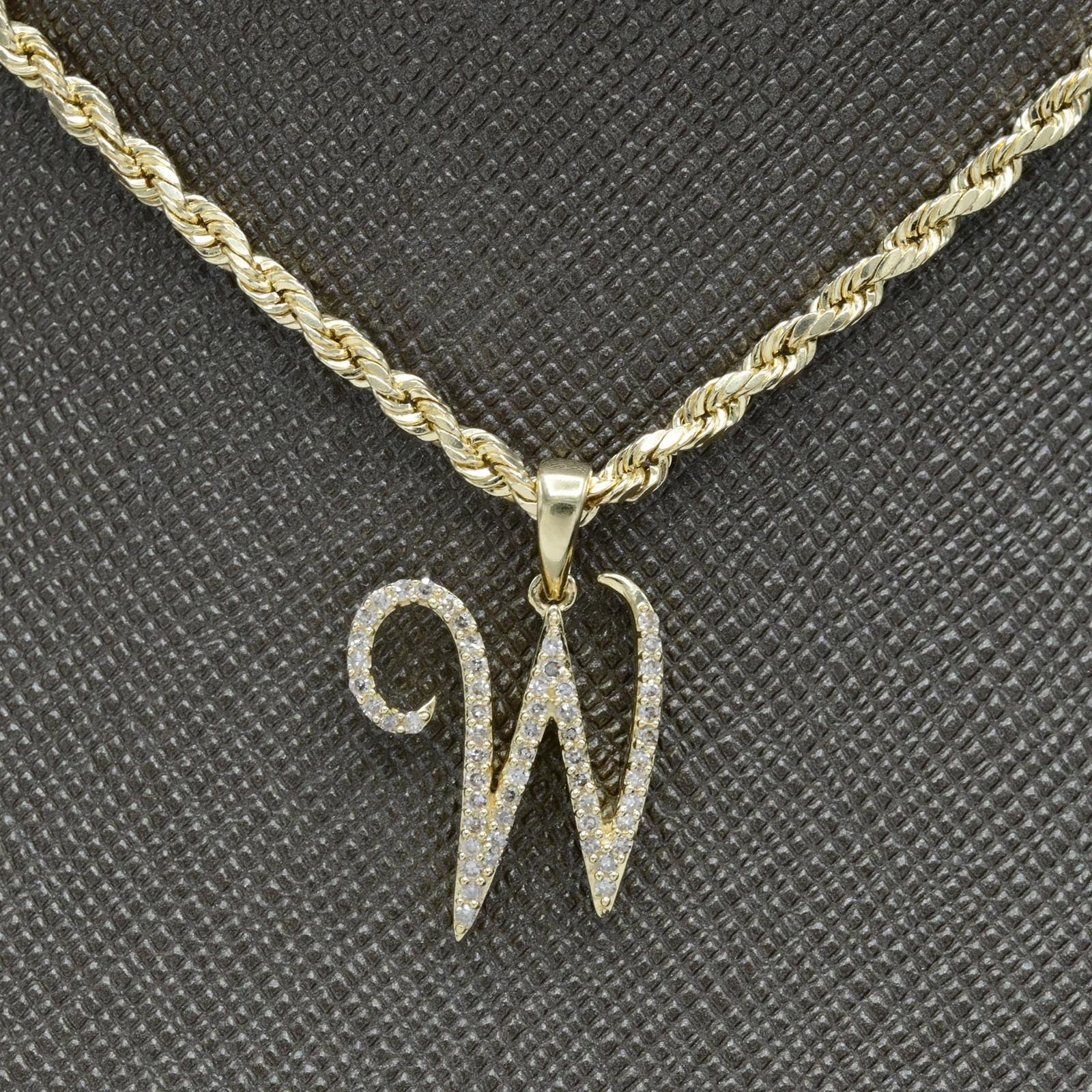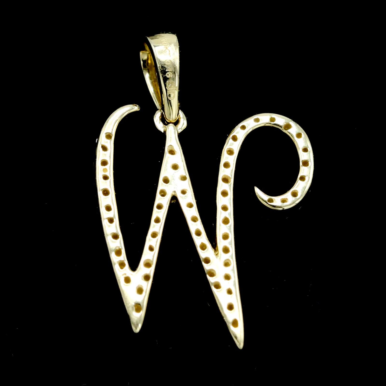 This 10k yellow gold pendant features the initial "W," delicately crafted to highlight its elegant design. Set with 0.16 carats of natural diamonds, the charm adds subtle brilliance, enhancing its sophistication. Weighing 1.5 grams, this alphabet pendant balances durability and comfort, making it an ideal personalized accessory for everyday wear or special occasions.