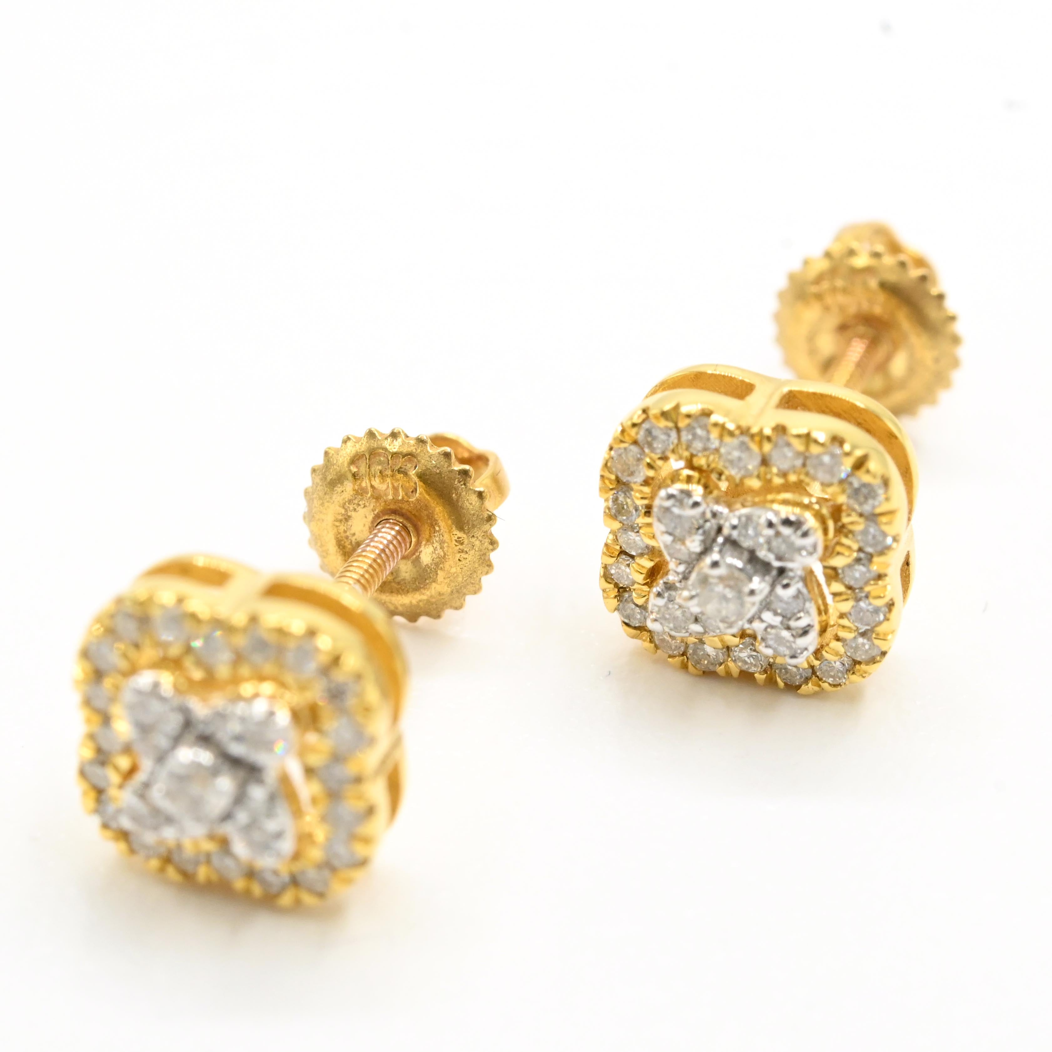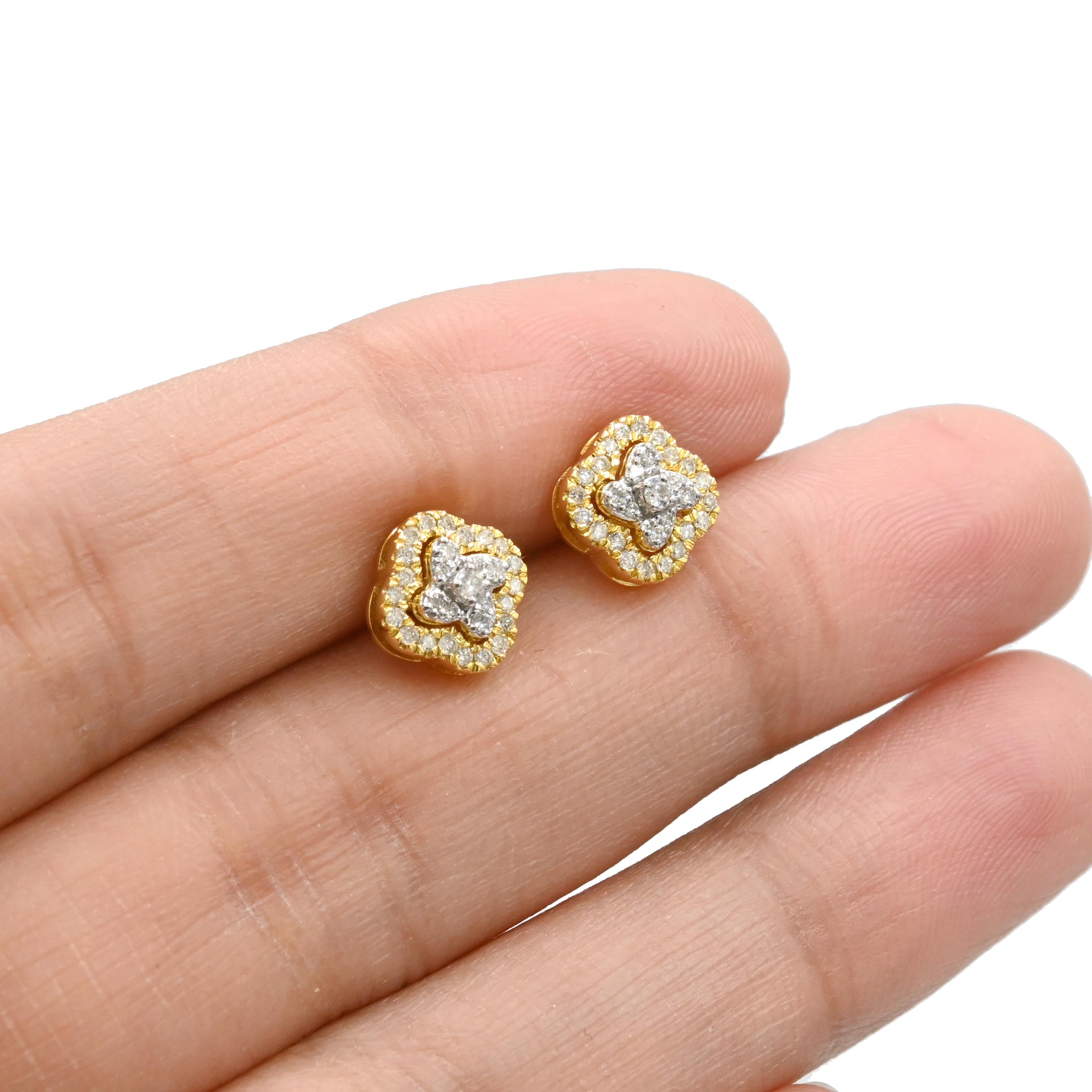 These elegant stud earrings feature a four-leaf clover design crafted in 10k yellow gold, weighing 1.6 grams. Each earring is adorned with 0.25 carats of natural diamonds, adding subtle sparkle and refined charm. Perfect for daily wear or special occasions, they combine timeless symbolism with expert craftsmanship to elevate your look with understated sophistication.