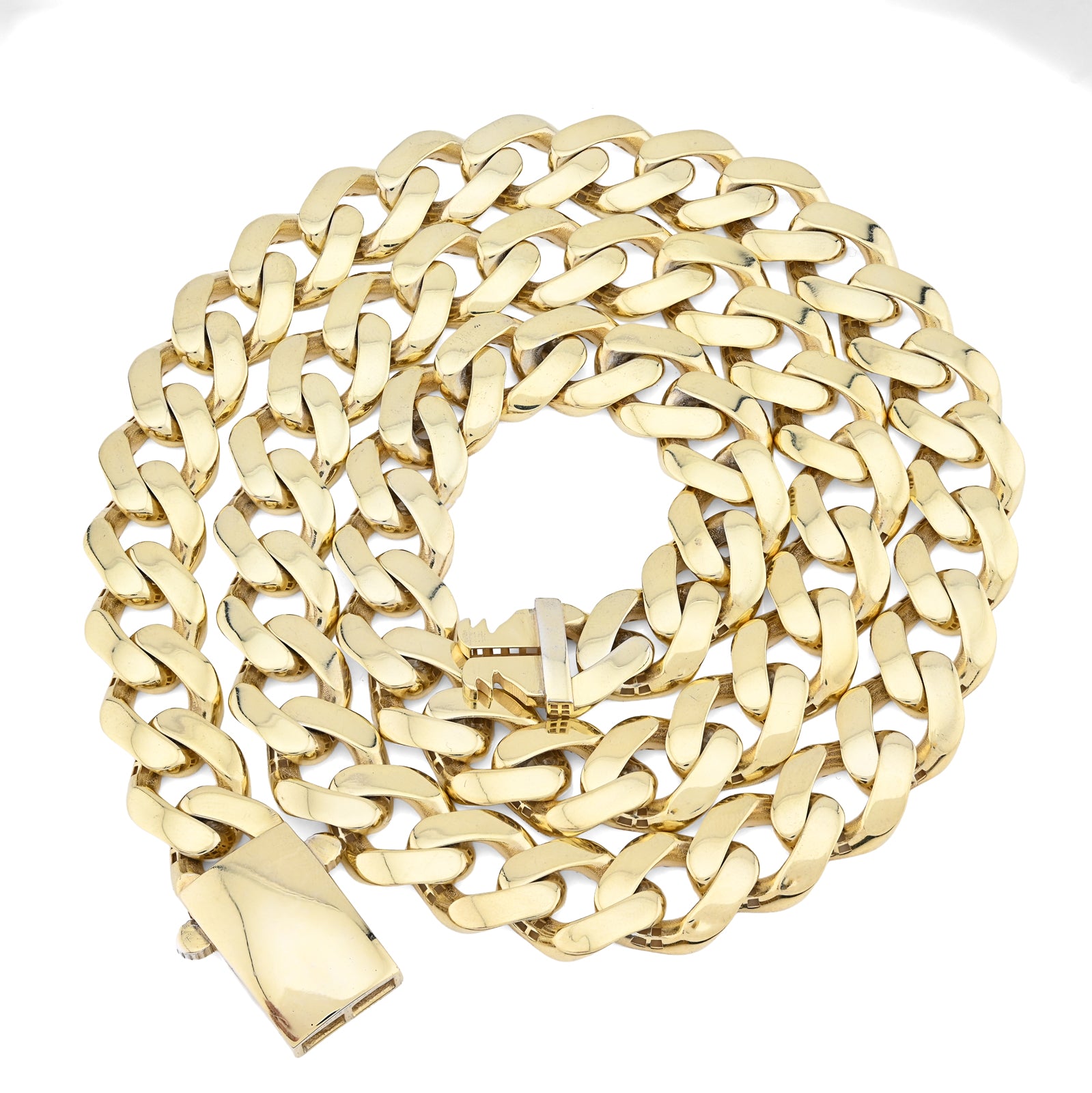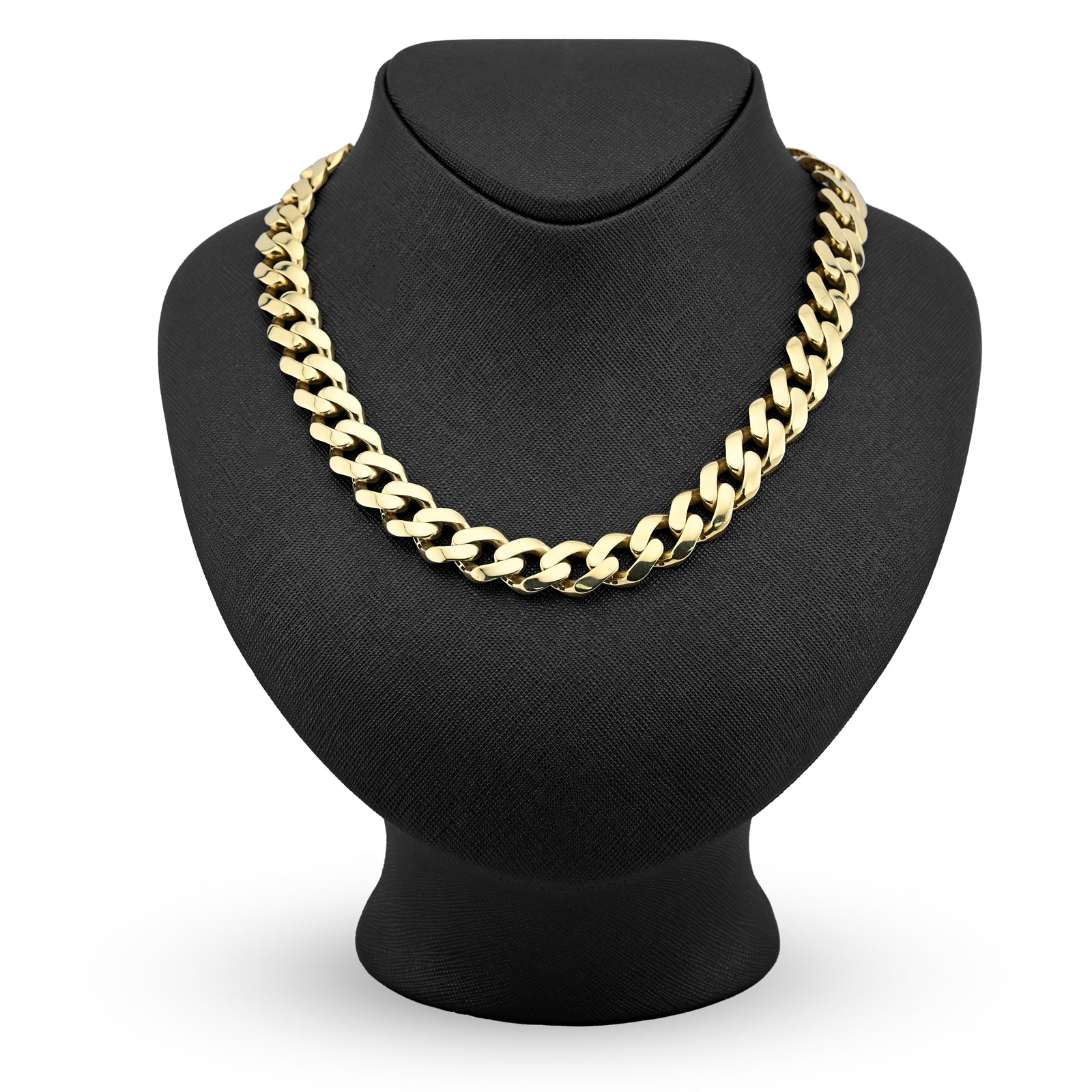 Establish undeniable authority with this magnificent Cuban link chain necklace, engineered for the man who demands maximum impact. The imposing 13mm links showcase the iconic Cuban pattern at its most commanding, creating visual presence that announces success and refined confidence. Bonded with genuine 1/10th 10k yellow gold over 925 sterling silver, this necklace combines exceptional durability with warm aesthetic appeal, developing distinguished character and patina with time. Weighing an impressive 45.9 grams, this chain delivers substantial presence and quality construction that affirms authentic materials and exceptional craftsmanship. The 24-inch length ensures optimal positioning while providing exceptional versatility across diverse styling contexts and occasions. The Cuban link design remains perpetually relevant, functioning seamlessly from casual moments to significant celebrations. The warm gold bonding complements all complexions, while the sterling silver foundation ensures lasting durability and reliability. This necklace represents a definitive investment for those who embrace bold aesthetics—a wearable declaration of success, power, and uncompromising taste in fine jewelry.
